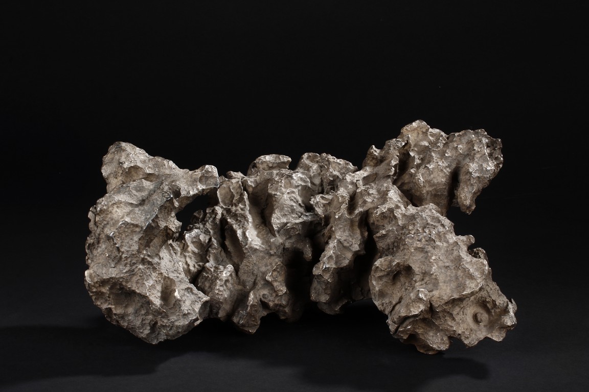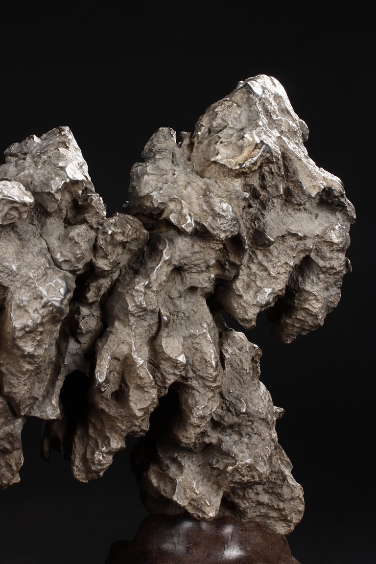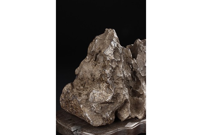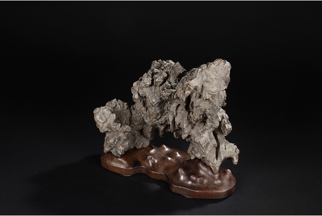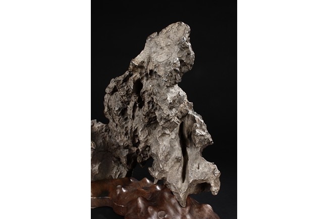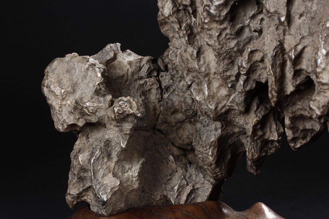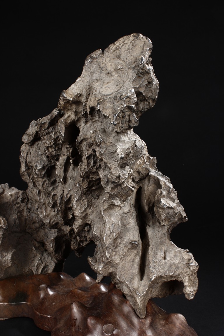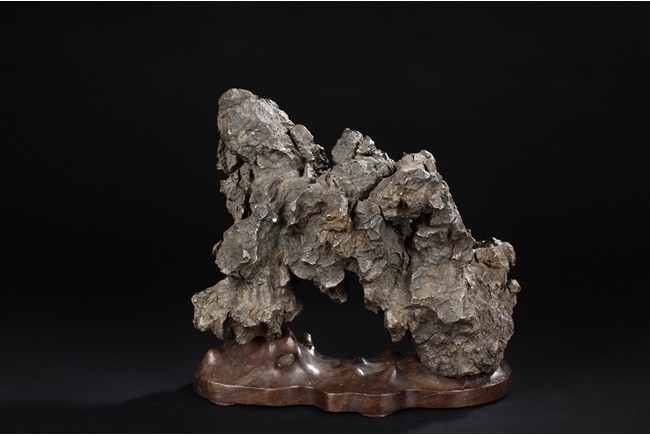 The scholar stone was made from lingbi stone, depicting jagged and steep mountain ridges. Includes original stand. Qing Dynasty period.