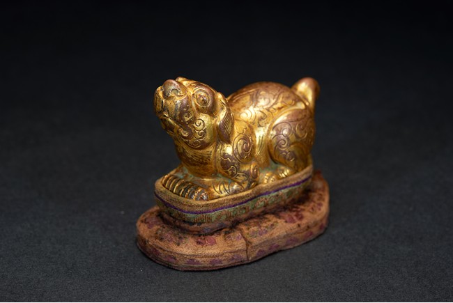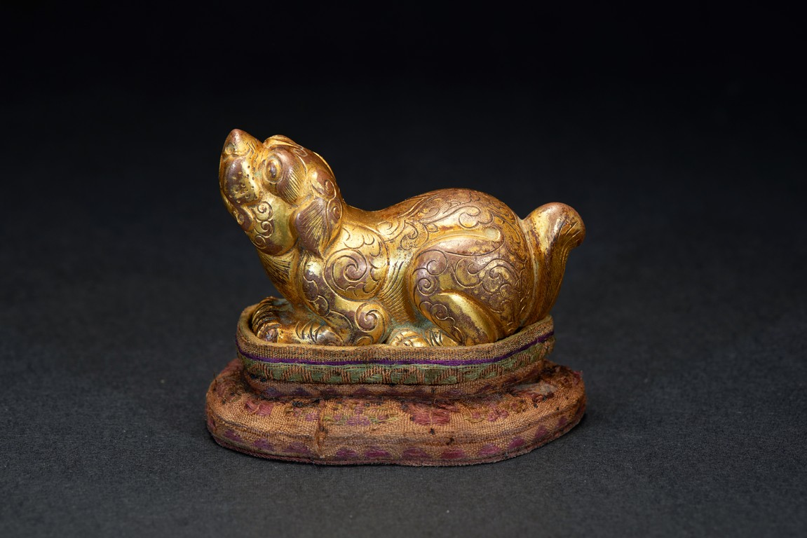 Skillfully cast, the mythical beast is shown seated in an recumbent position, head turned upward and detailed with powerful nose and protruding eyes, the body overall incised with scrolling decorations, with an short tail. Fitted with original embroidered stand. Ming Dynasty period.