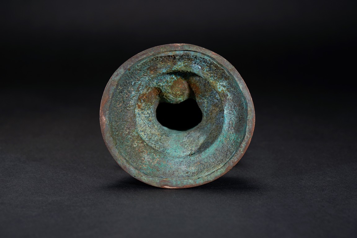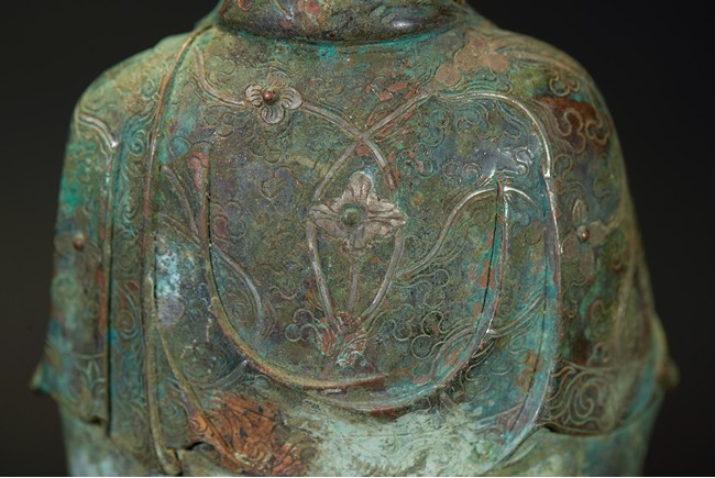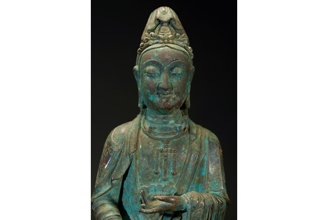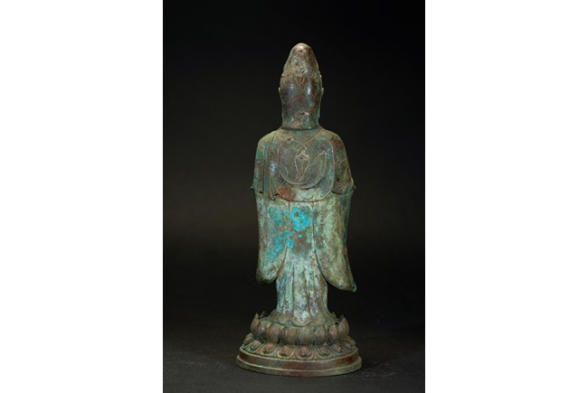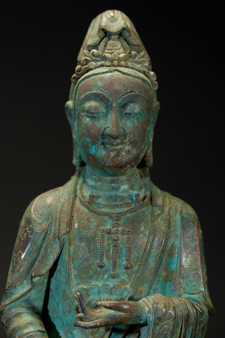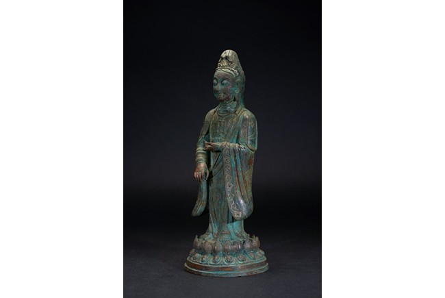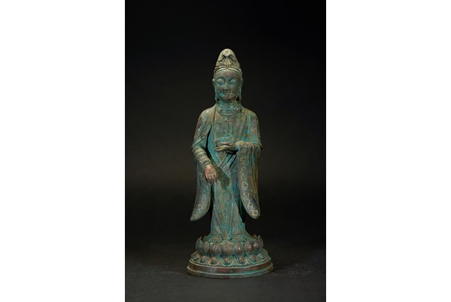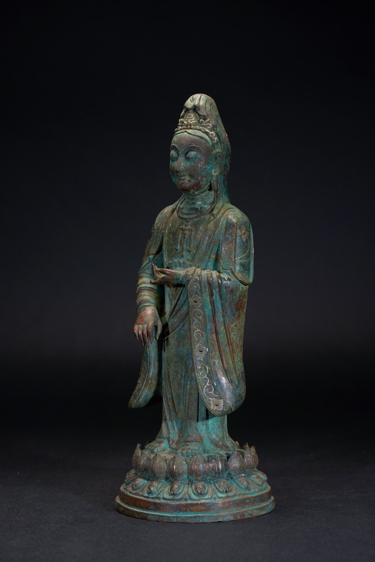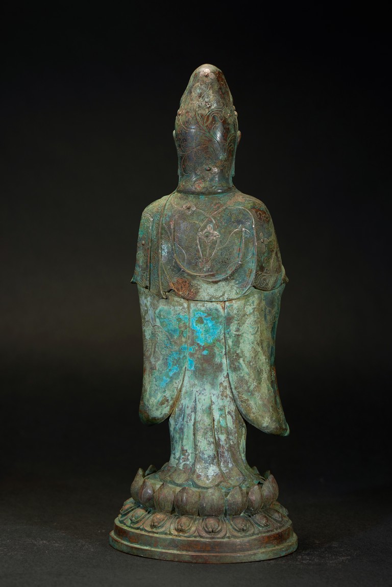 The deity is shown standing upon an double lotus throne with both hands raised in mudra, wearing long robe with delicate scrolling floral design outlined in silver and beaded necklace, her face with serene expression flanked by pendulous earlobes, the hair tied in an tall chignon under an veil. The bronze with extensive malachite encrustation. Ming Dynasty period.