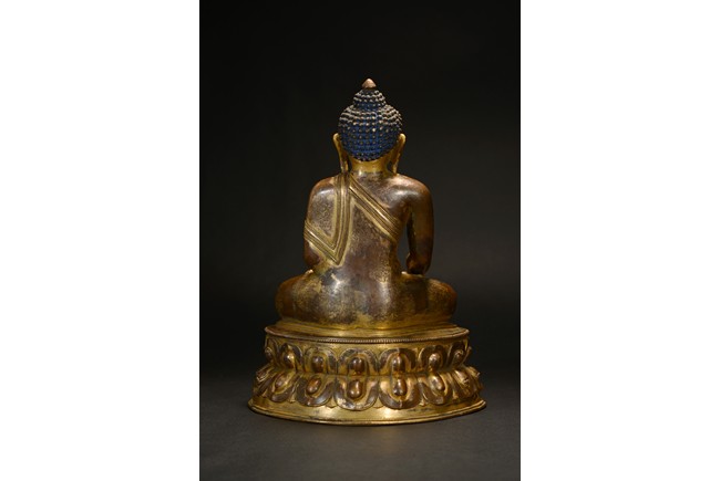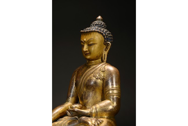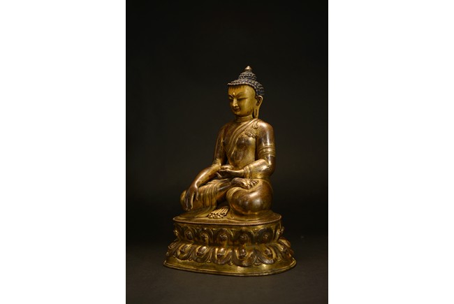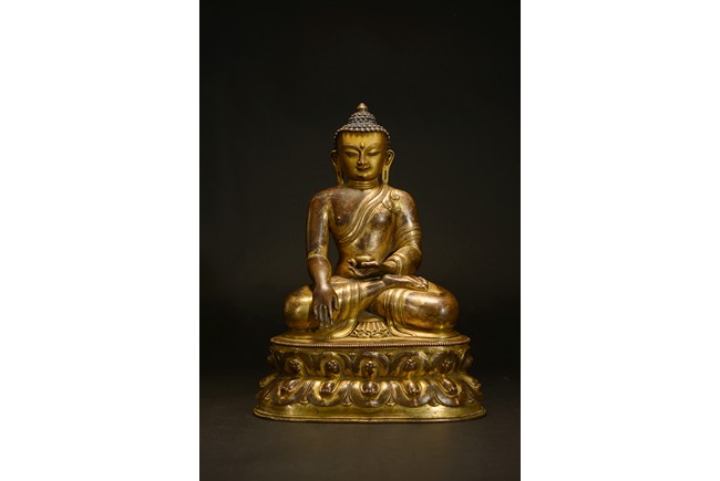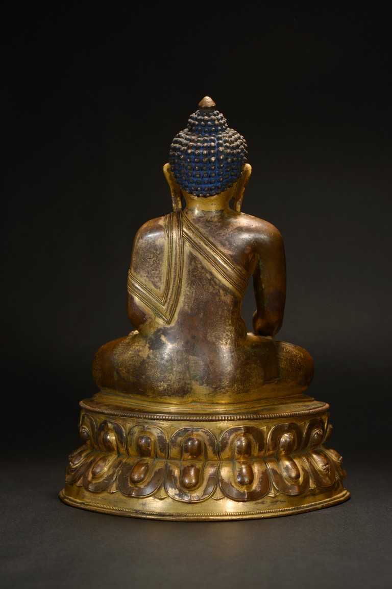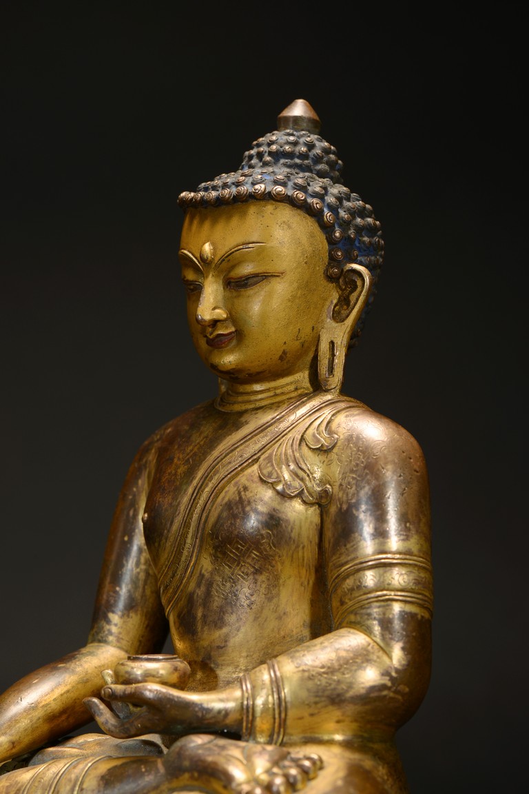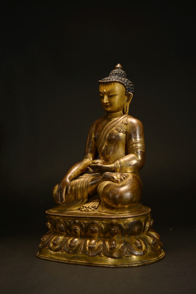 The shakyamuni shown seated in dhyanasana upon double lotus throne with right hand resting on leg, left hand holding an bowl in dhyana mudra, wearing loose-fitting robe falling in elegant folds, the serene face with downcast eyes and gentle smile flanked by pendulous earlobes, the head with tall ushnisha with tight curls. Qing Dynasty period.