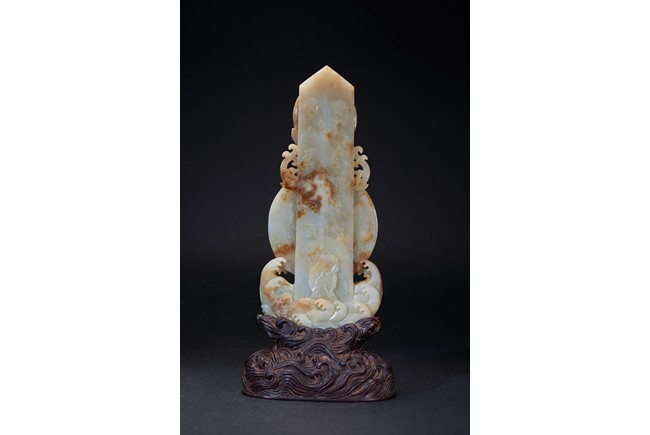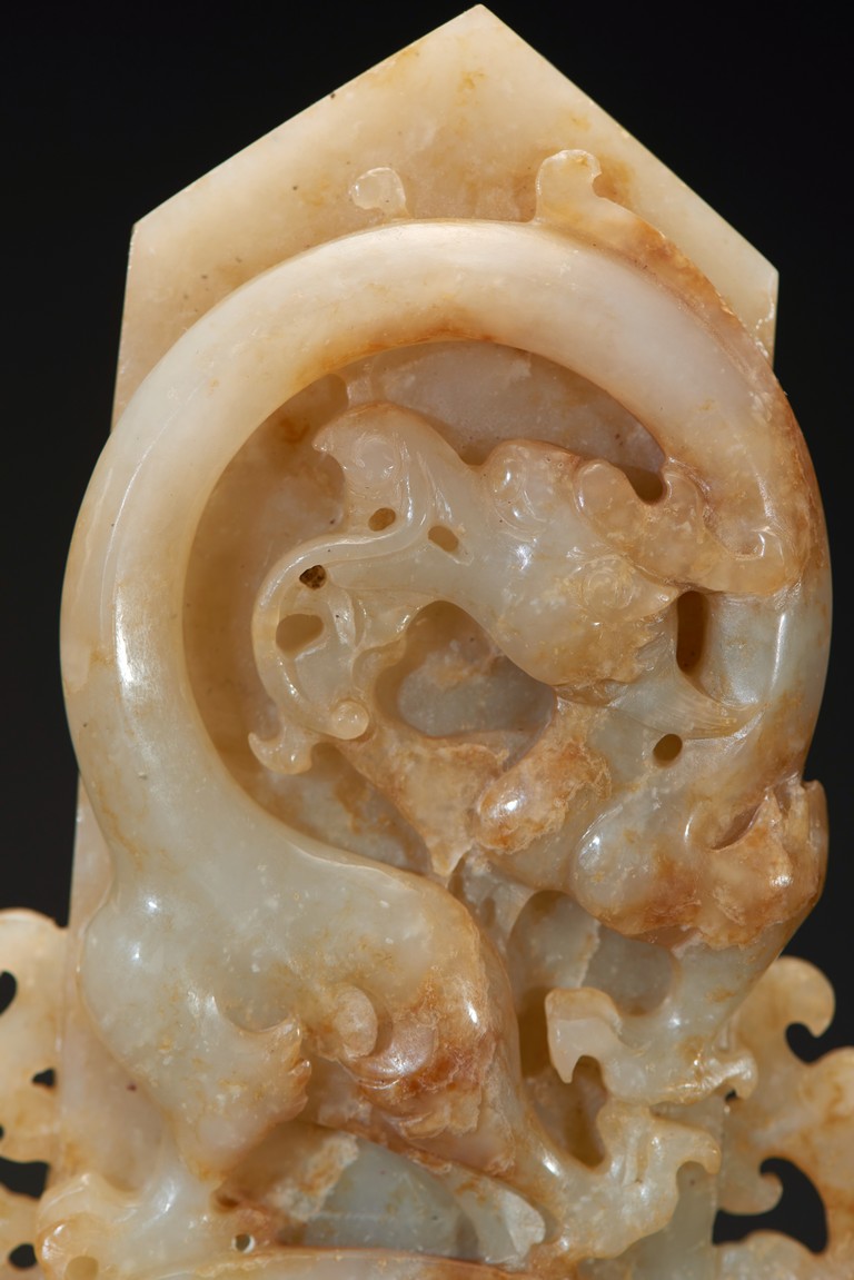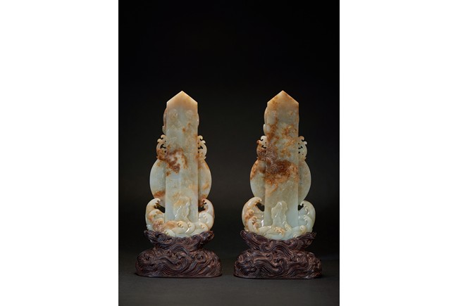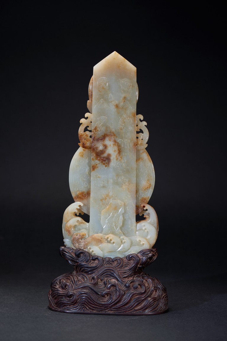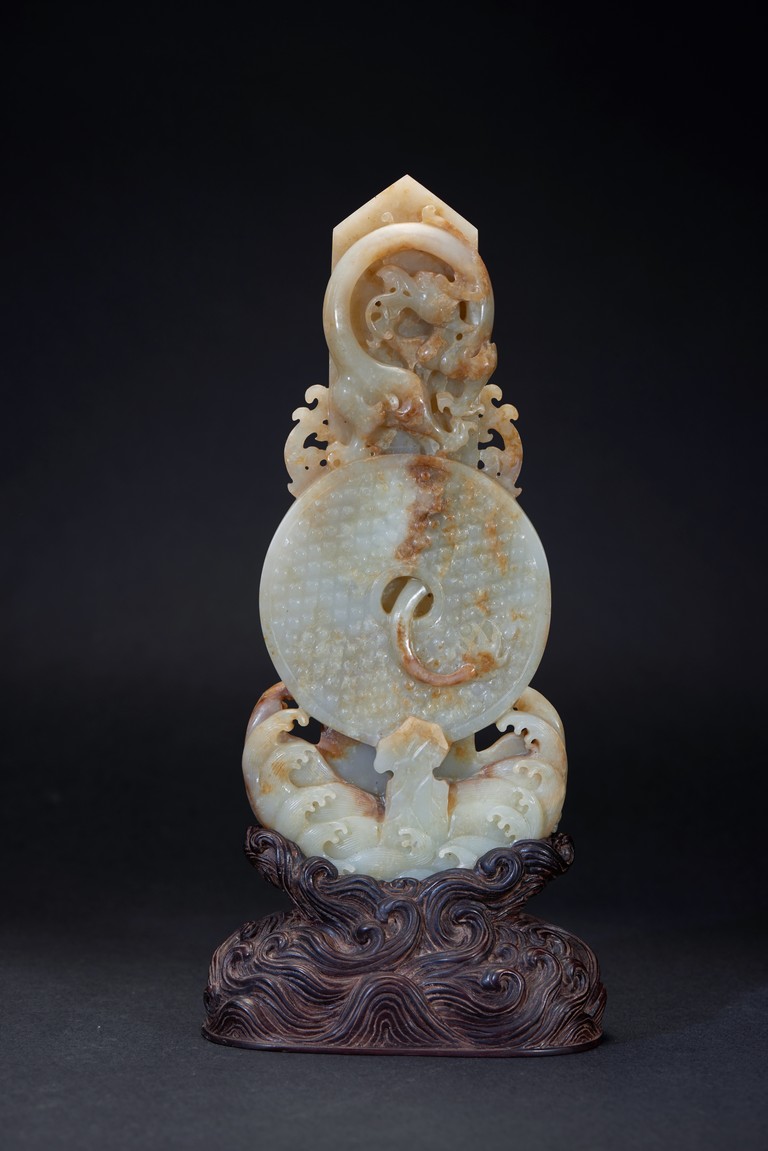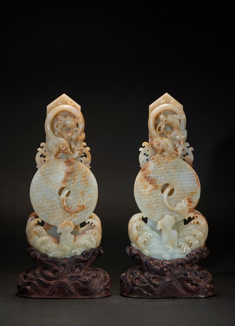 Each tablet is of flattened form with gui scepter joining an central circular bi disc with raised studs issuing from turbulent waves and rocks below, the blade carved with powerful sinuous dragon with tail through bi aperture, the gui carved with twelve symbols to the back, the stone of white tone with russet skin and markings, accompanied with rosewood stand. Qing Dynasty period.