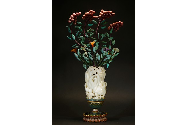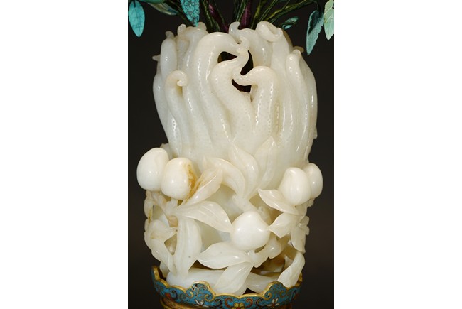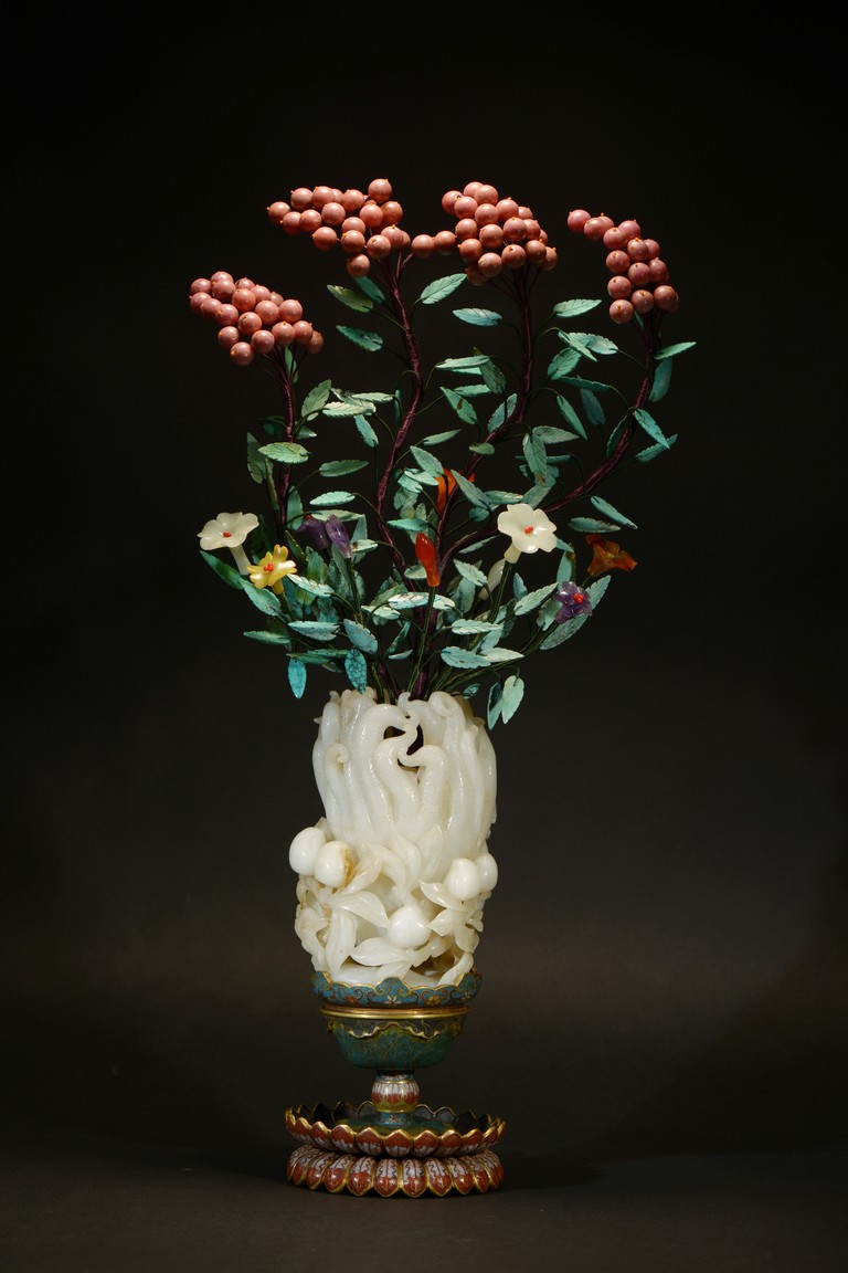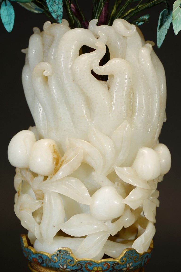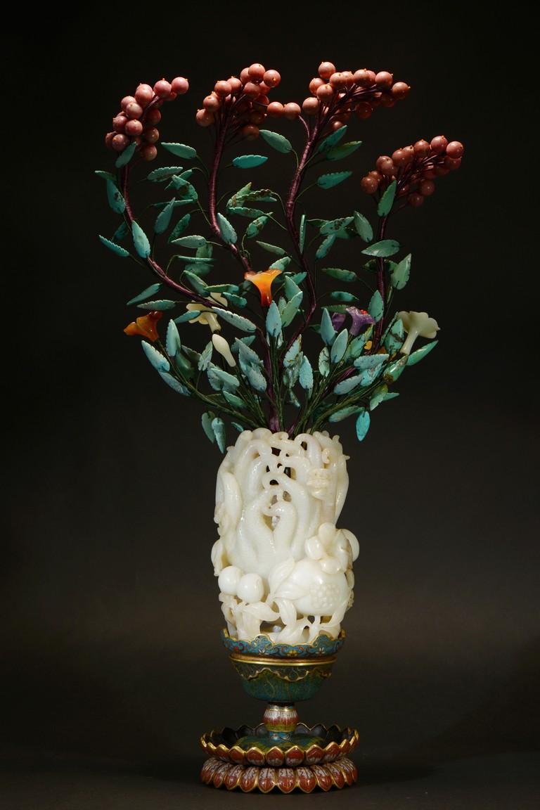 The deep white jade vase is carved in the form of an finger citron with curling ends borne on leafy peach branches. The vase further supported on cloisonné enamel stand with scroll foliage pattern. The finger citron vase inset with entwined fruiting vines with turquoise leaves, coral bead fruits, and white jade, agate, amethyst flowers.