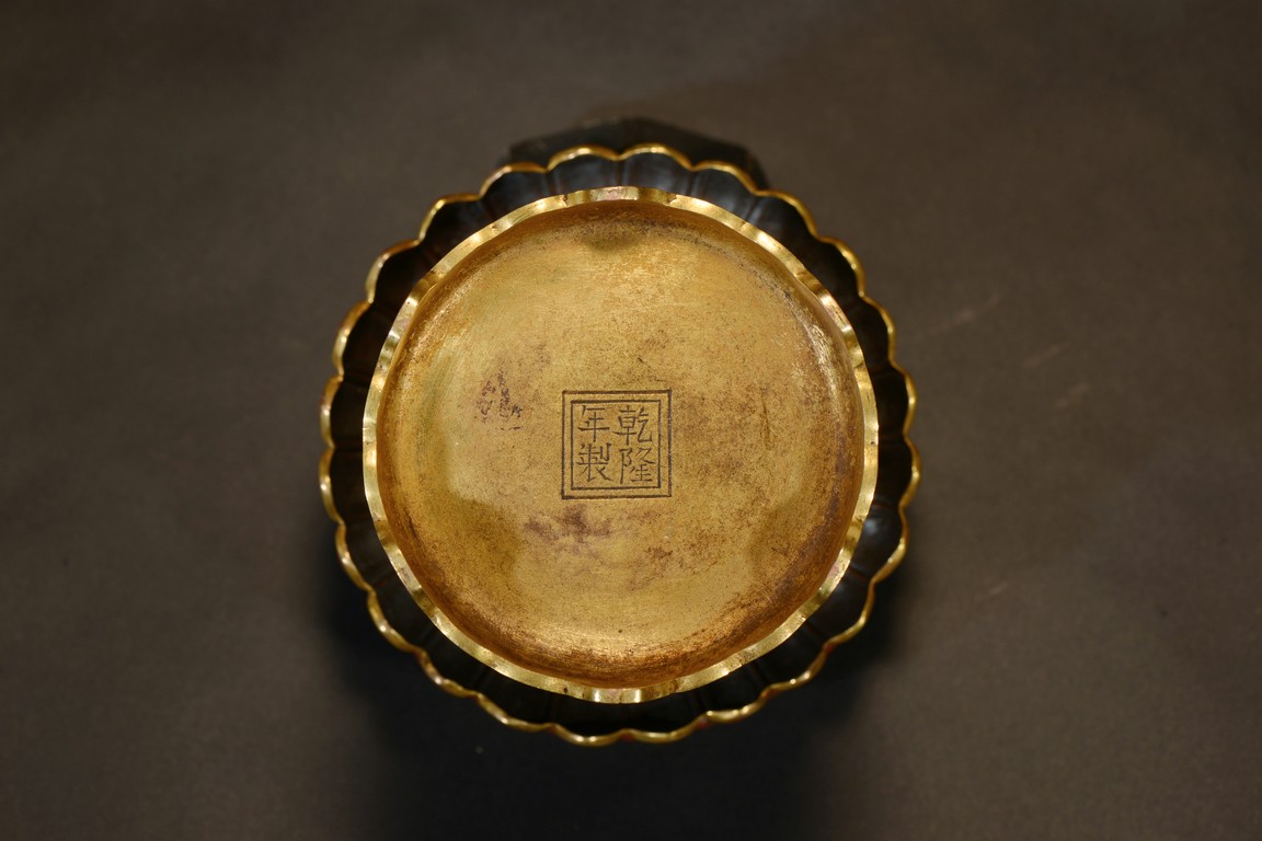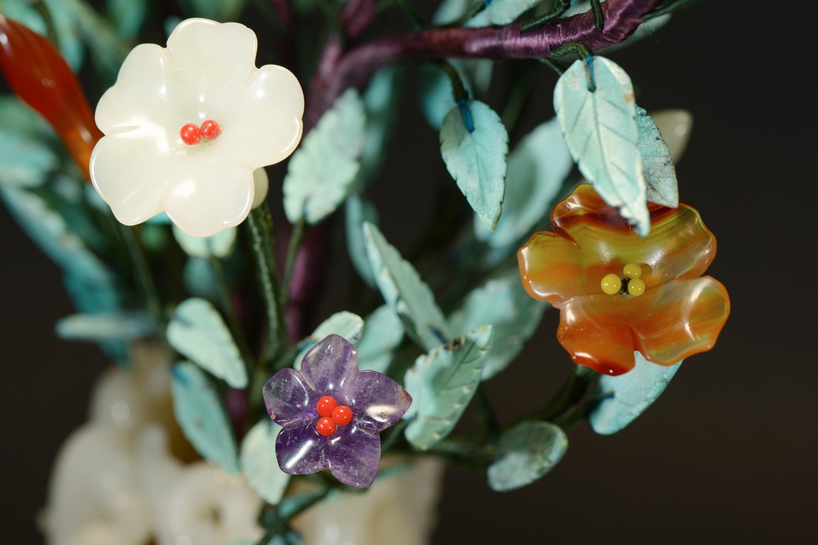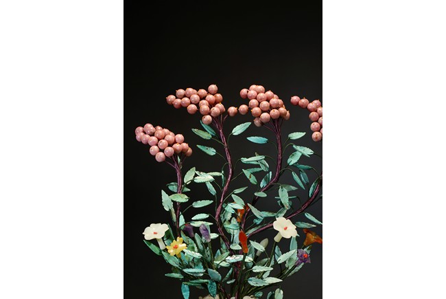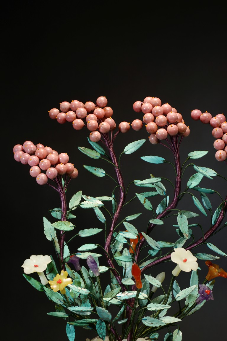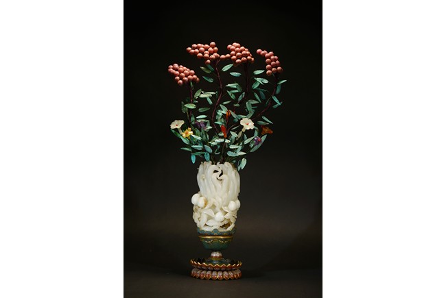 The deep white jade vase is carved in the form of an finger citron with curling ends borne on leafy peach branches. The vase further supported on cloisonné enamel stand with scroll foliage pattern. The finger citron vase inset with entwined fruiting vines with turquoise leaves, coral bead fruits, and white jade, agate, amethyst flowers.