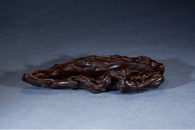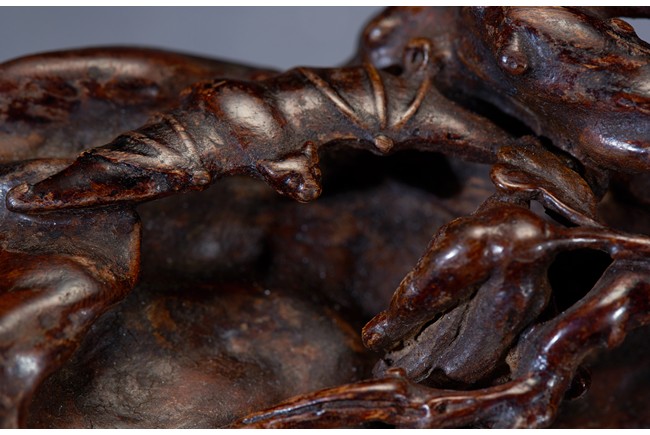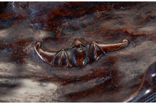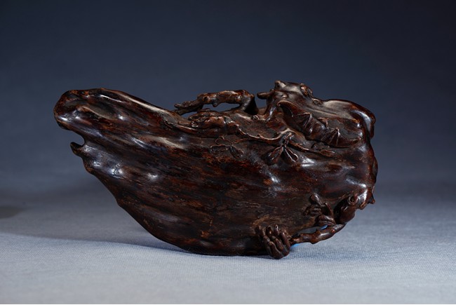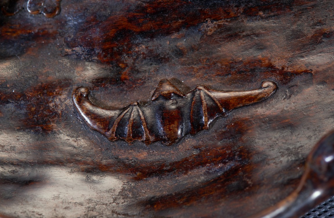 Superbly and naturalistically carved in the form of an hollowed tree trunk, the surface skillfully undercut in various levels of relief with wood knots and textured bark, adorned on the exterior with gnarled flowering branches in openwork, and with carved flying bats crawling over the rim. Qing Dynasty period.