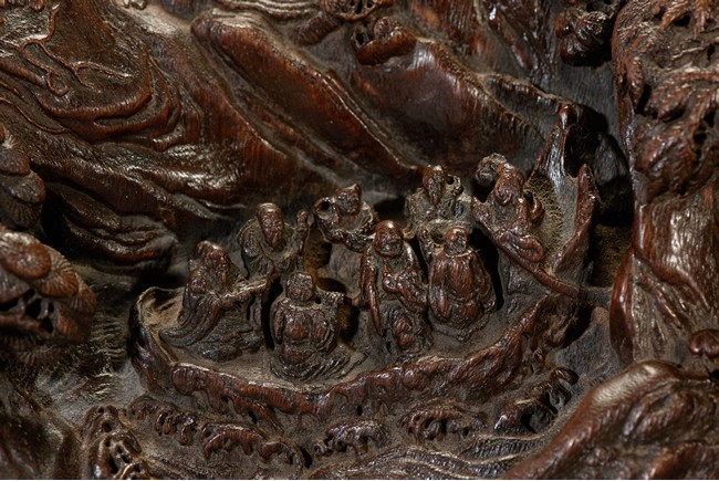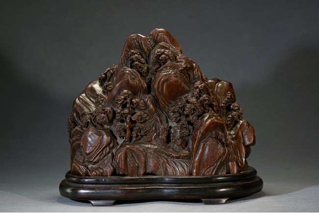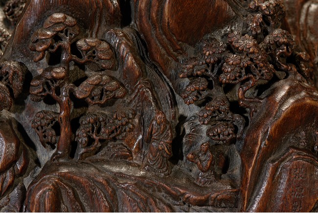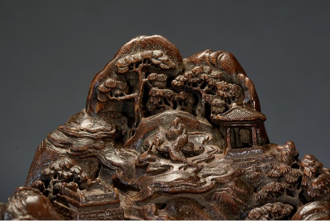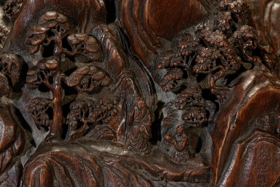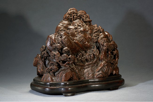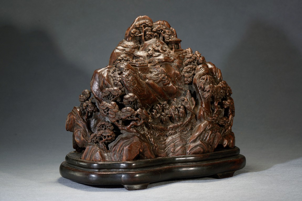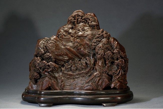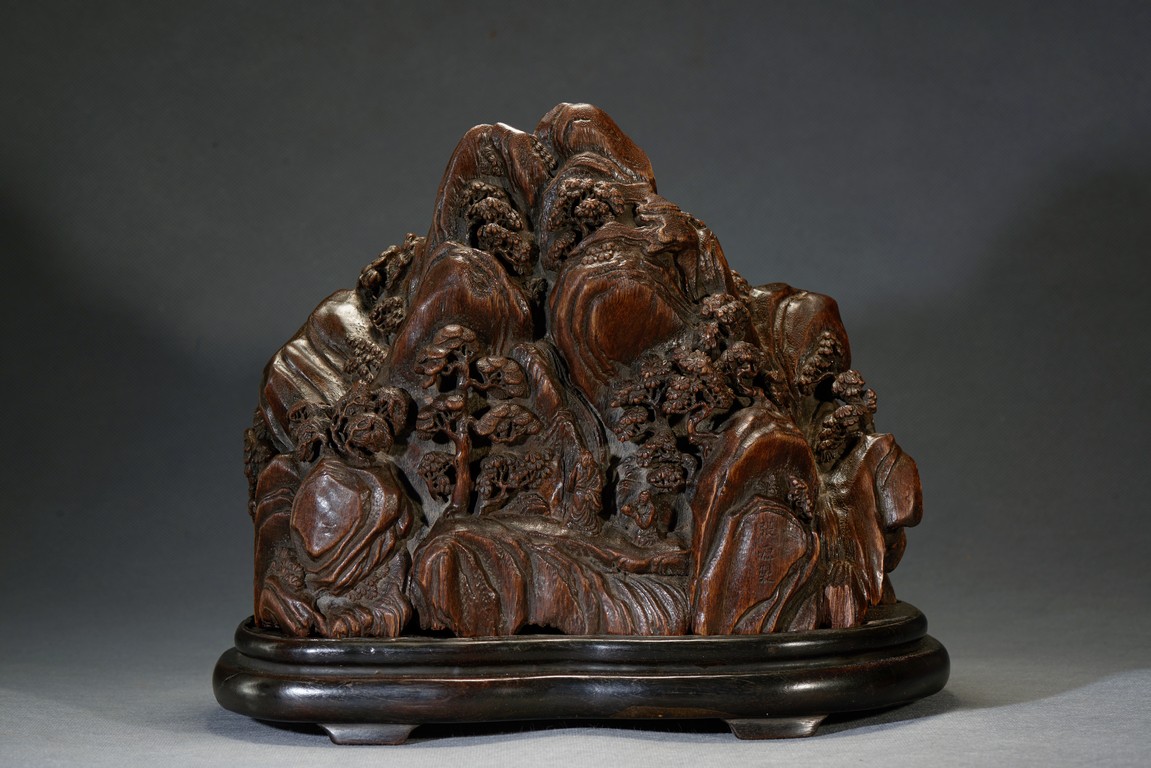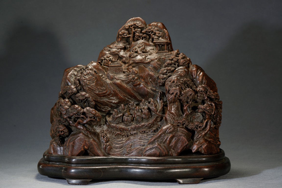 Well carved and set in varying layers of depth with an craggy mountainscape, the front depicts the eight immortals traveling on an boat across turbulent waves. The reverse carved with an attendant bend down his waist holding an peach for an elder scholar close to an tall pine tree. Qing Dynasty period.