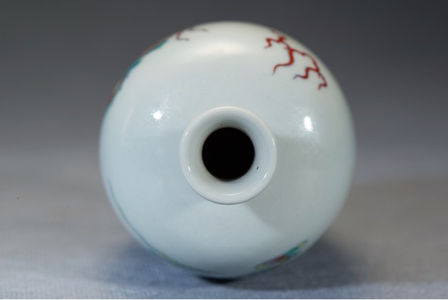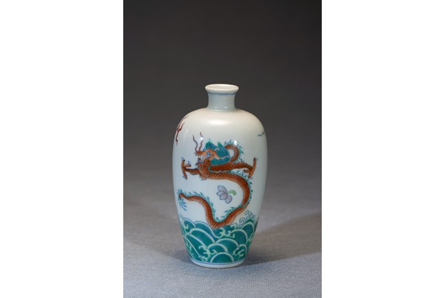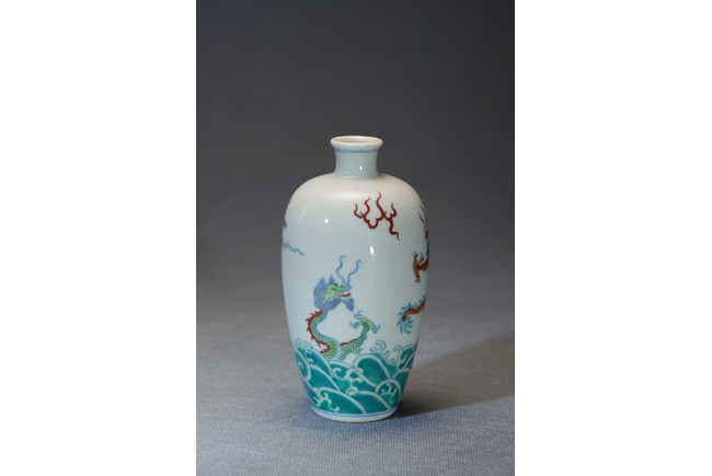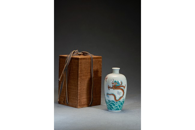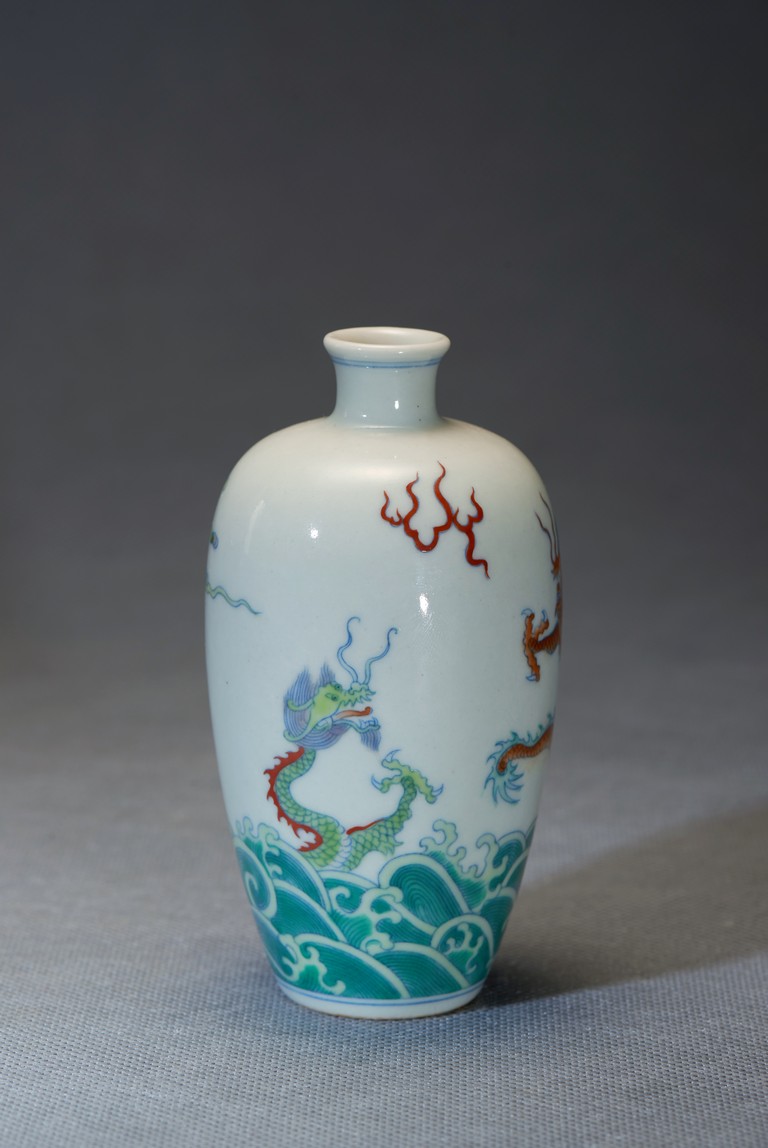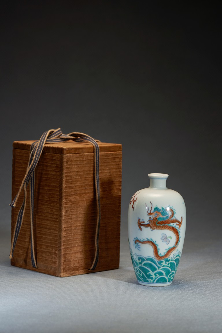 Of somewhat ovoid shape body, the vase raises to an short neck with flared rim, the exterior all finely painted in bright enamels with an large red and green 'three-clawed' sinuous dragon and an green dragon emerging from the foams and waves, the base with six character 'YONGZHENG' mark. Accompanied with an Japanese wood box. Qing Dynasty period.
