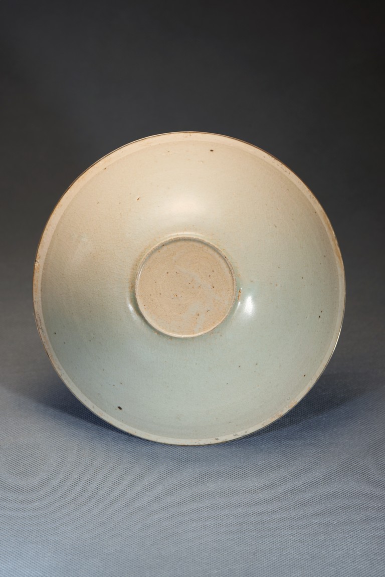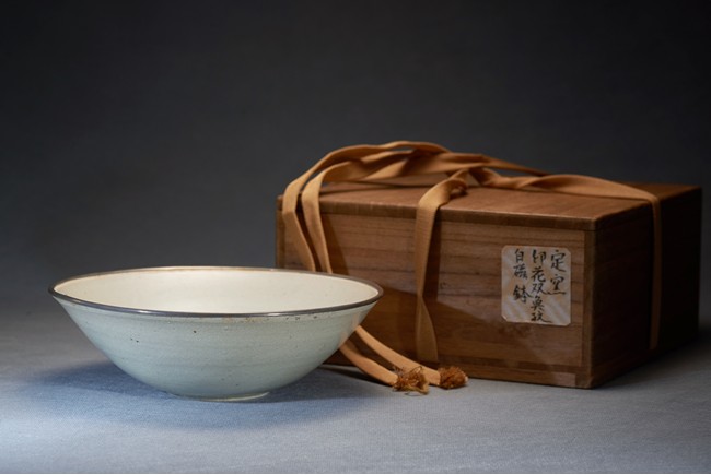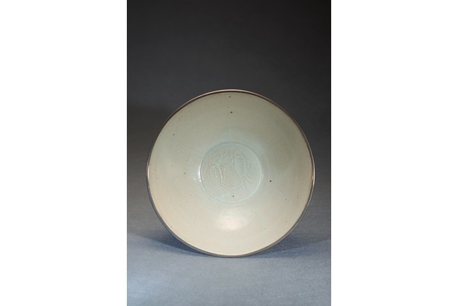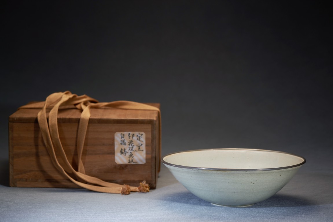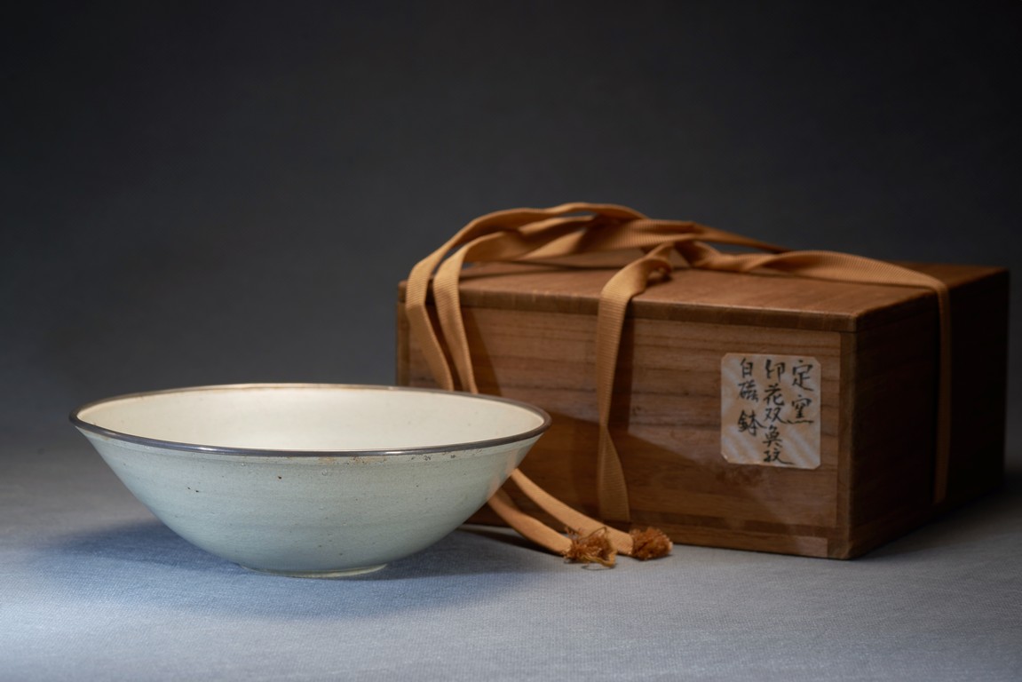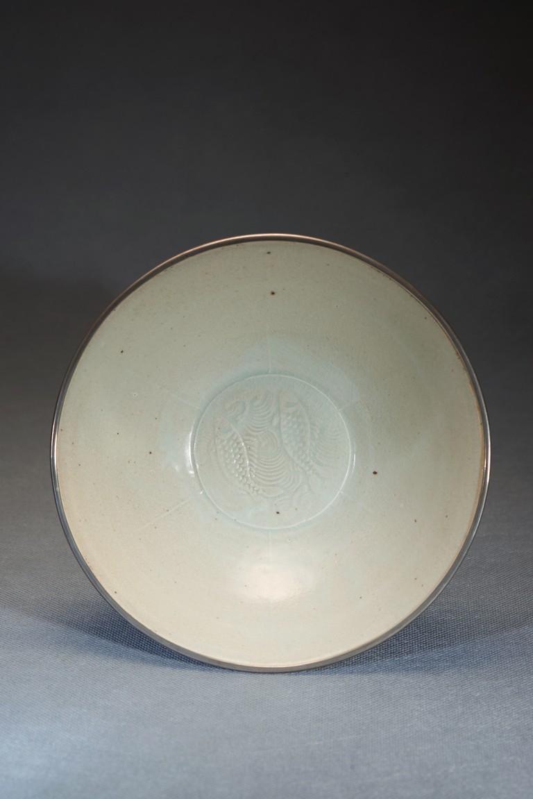 The dish finely moulded with an pair of fish in the central medallion amid waves,the exterior with plain design, all covered in an even pale ivory glaze. The rim is bound in metal mount. Accompanied with Japanese wood box. Song Dynasty period.
