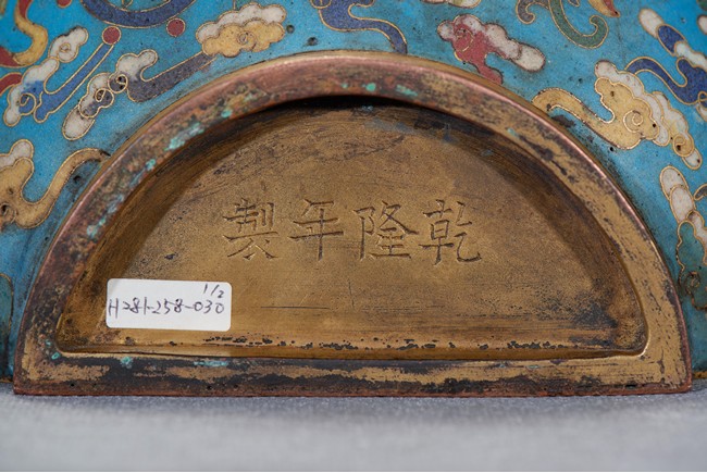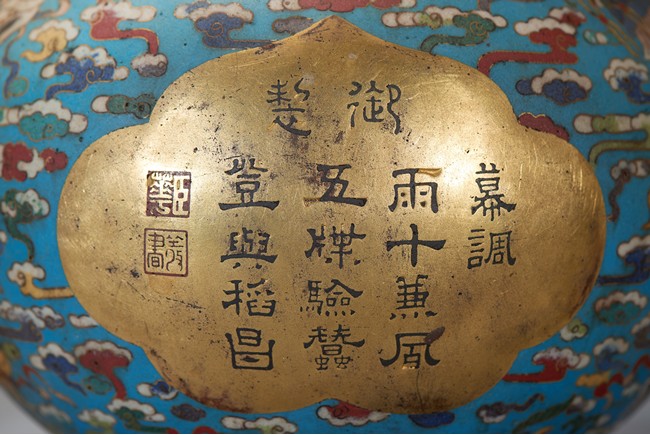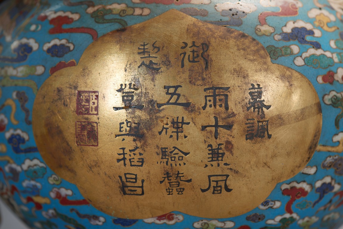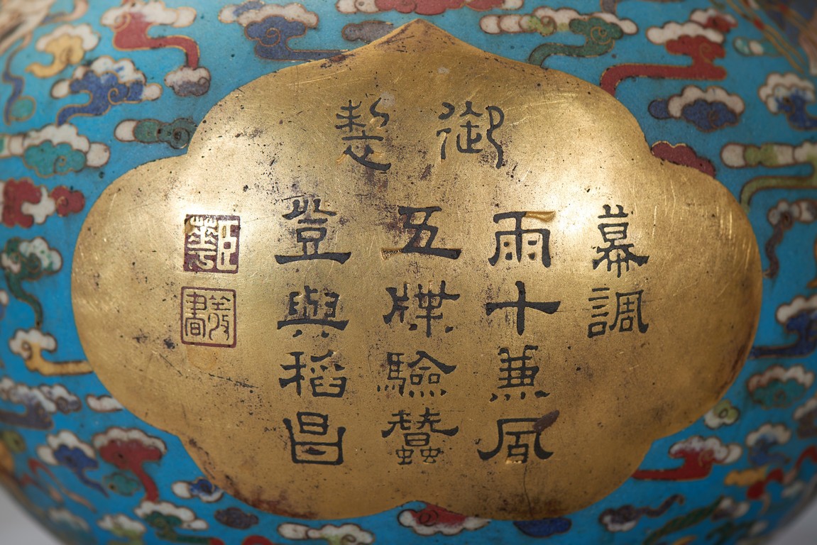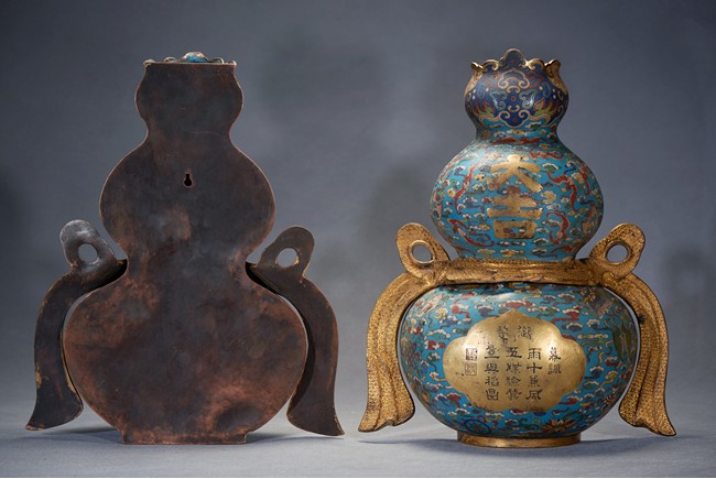 The upper bulb decorated in gilt with the phrase da ji (good fortune), the two characters reserved on the turquoise blue ground with auspicious clouds and bats in flight, the lower bulb with an shaped panel of imperial poem and seal marks, all flanked by gilt bronze 'knot' handles. Qing Dynasty period.