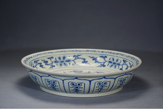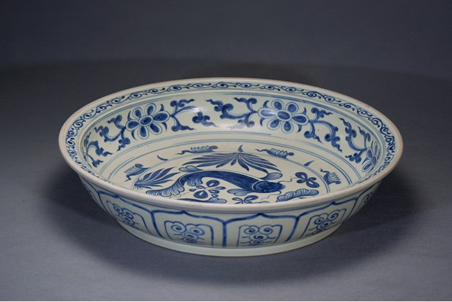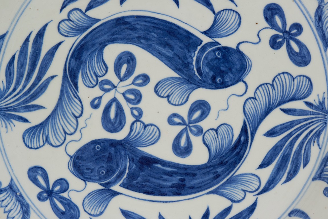 Painted with two fish joining head to tail amongst weeds to the central medallion enclosed in an double circle, the side with scrolling floral pattern, the exterior decorated with lotus lappet band.