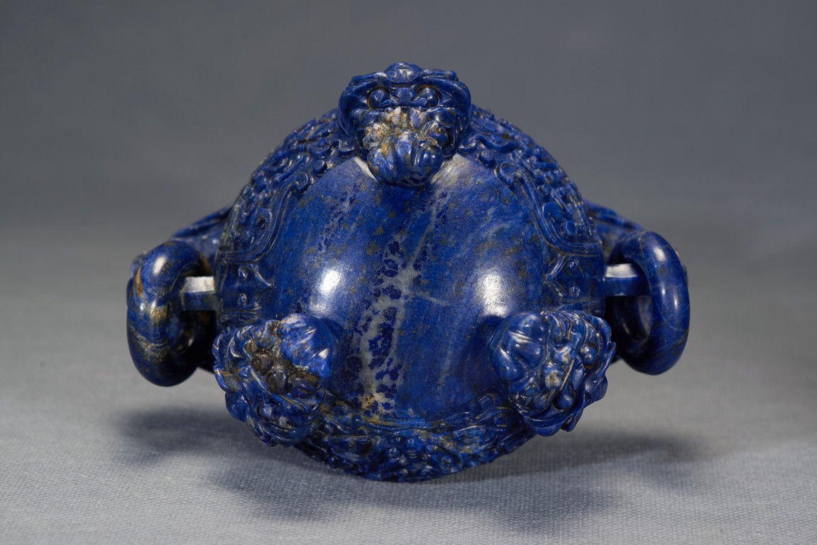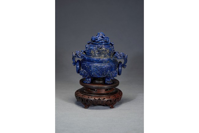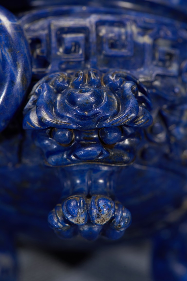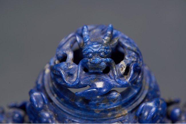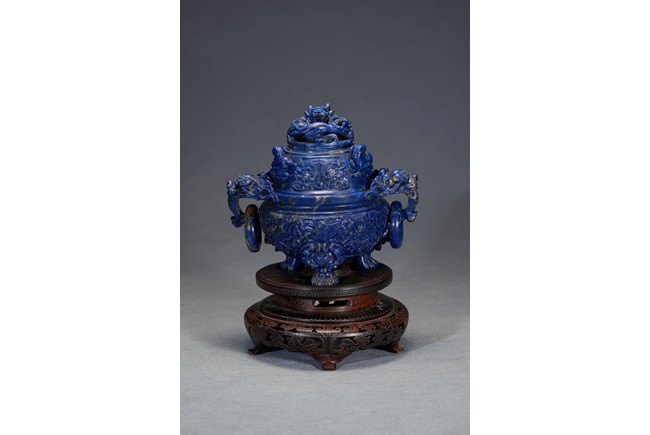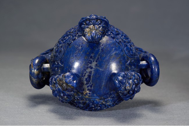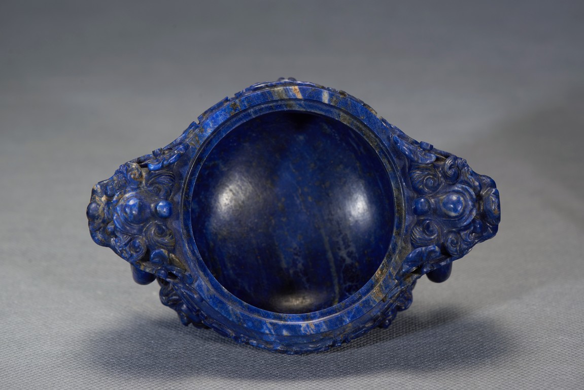 Of elongated, rounded rectangular form, it is carved through the purple overlay glass to transparent glass, depicting an cat standing upon an rockwork next to an upright chrysanthemum, below an auspicious bat in flight, with an oval enclosing chinese characters. Qing Dynasty period.