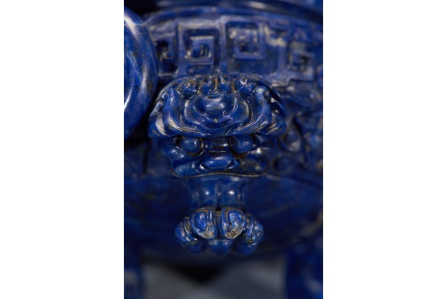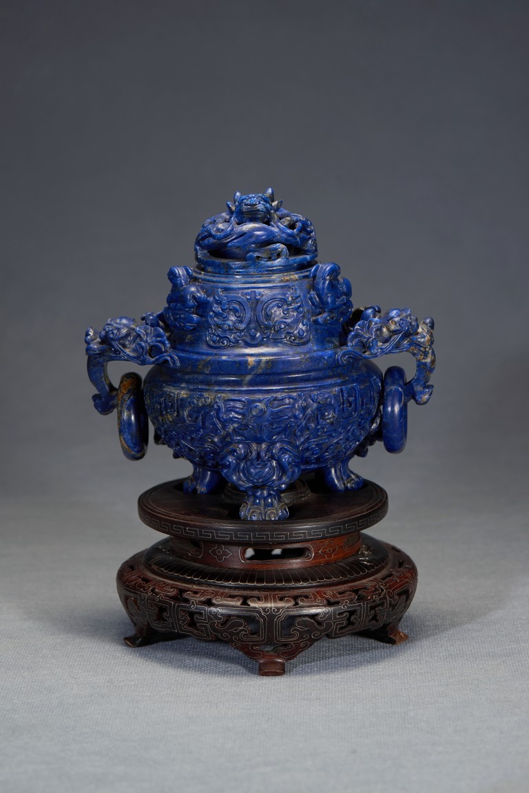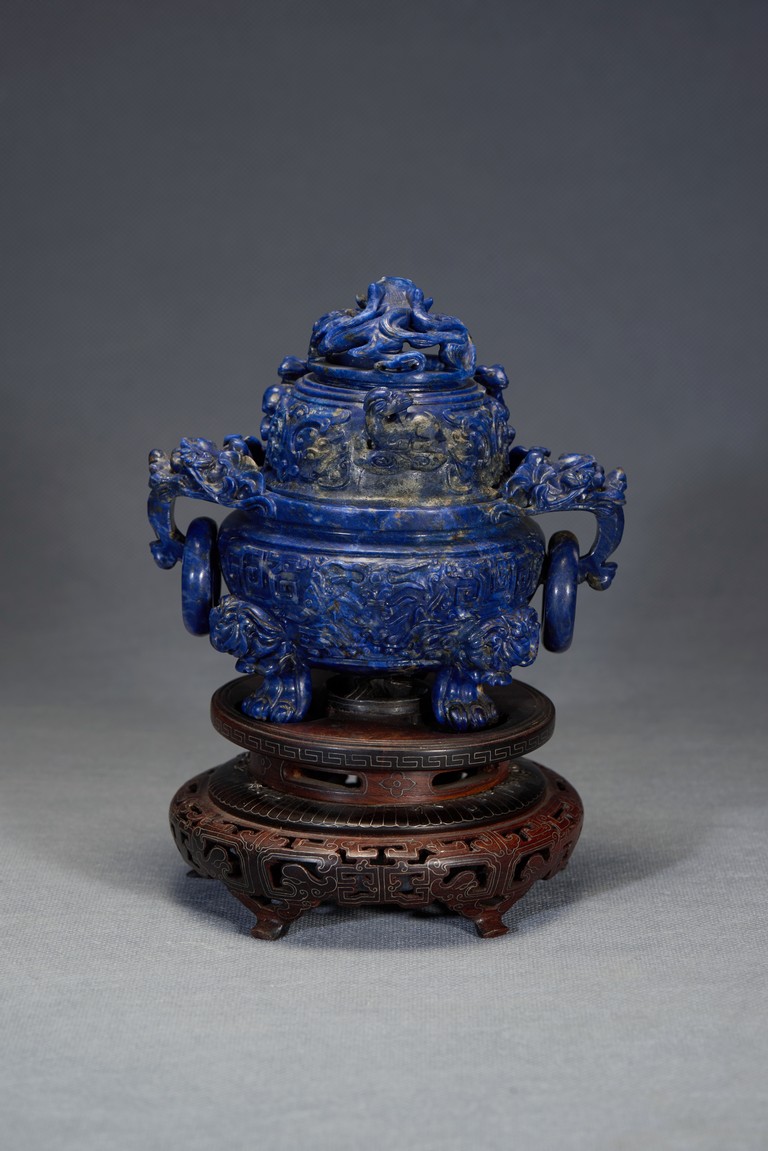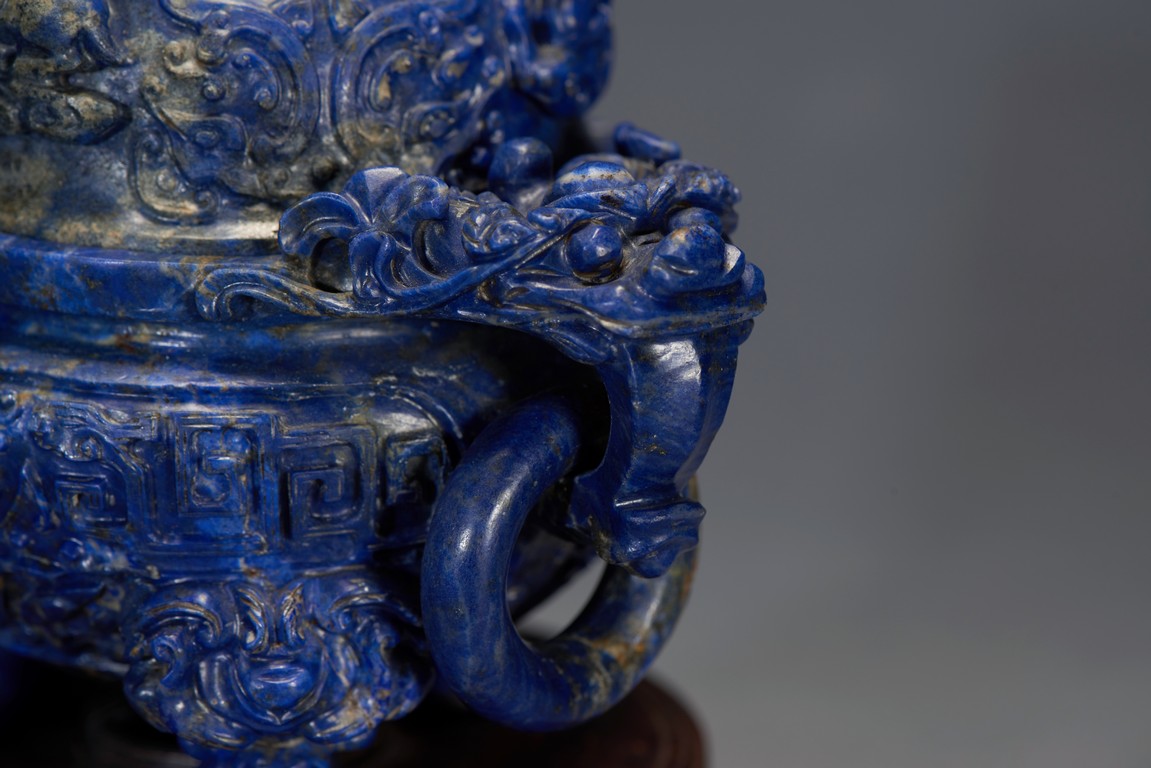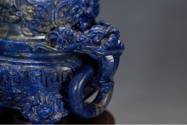Of elongated, rounded rectangular form, it is carved through the purple overlay glass to transparent glass, depicting an cat standing upon an rockwork next to an upright chrysanthemum, below an auspicious bat in flight, with an oval enclosing chinese characters. Qing Dynasty period.