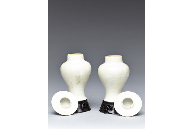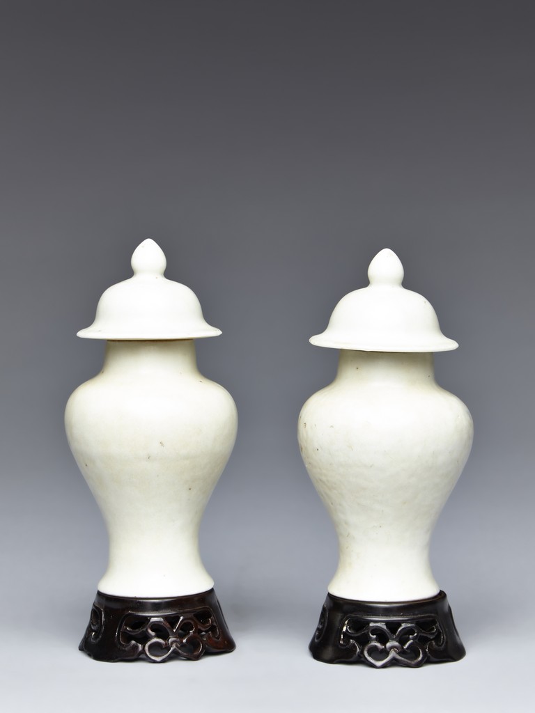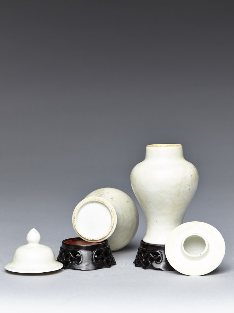 Each vase is of baluster from, the exterior evenly applied with white glaze. The cover is surmounted with an bud finial. Each supported on reticulated hardwood stand. Ming Dynasty period.