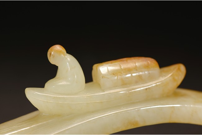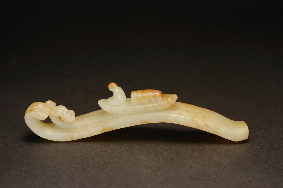 The jade hook finely carved as an dragon head back turned, the arched shaft surmounted with an figure seated upon an boat carving, the stone is of white tone with russet inclusions. Ming Dynasty period.