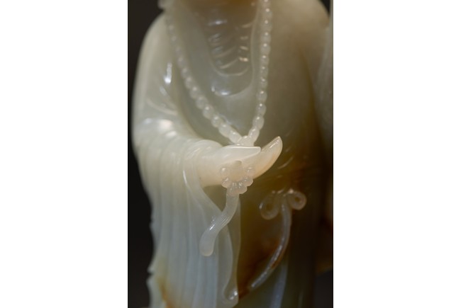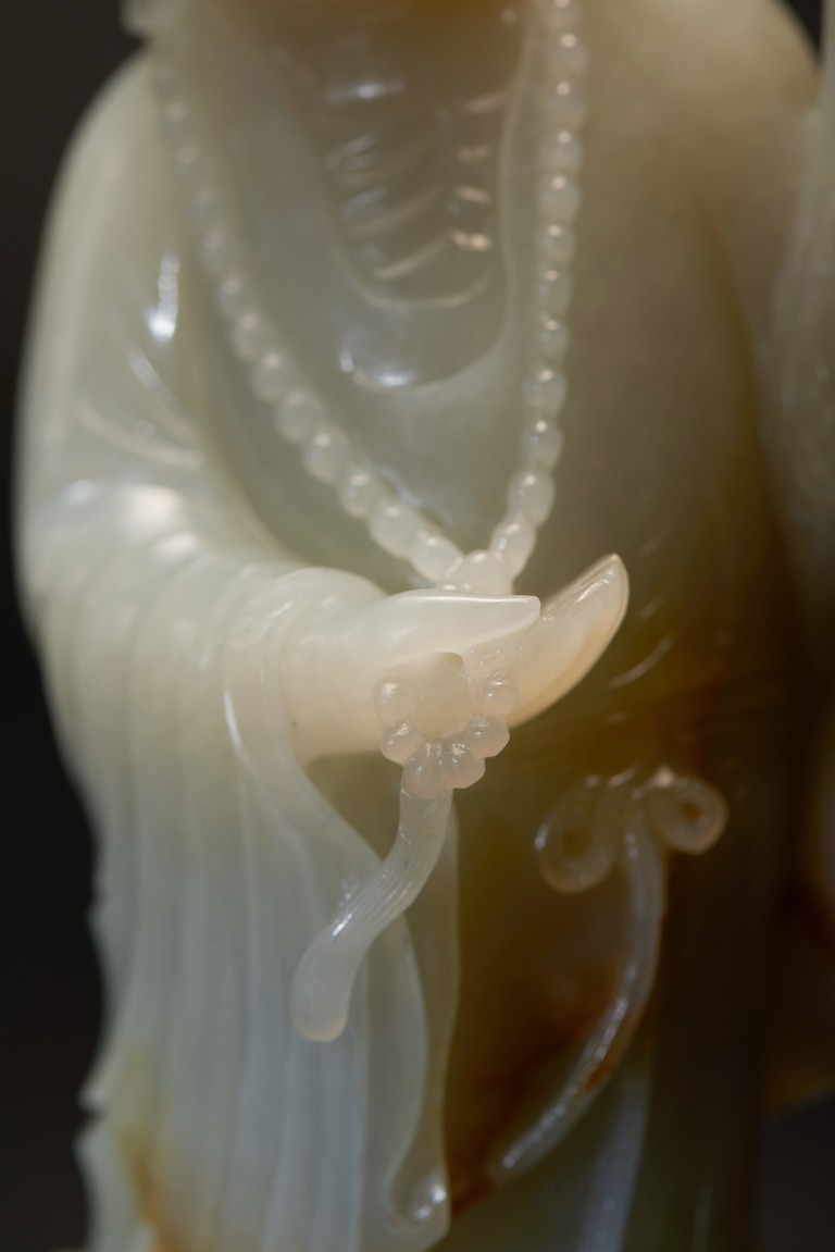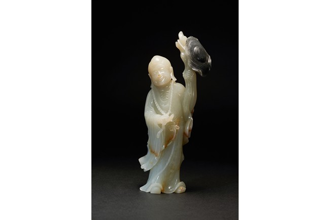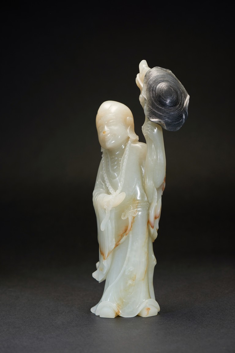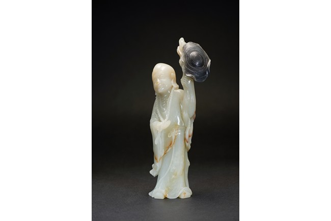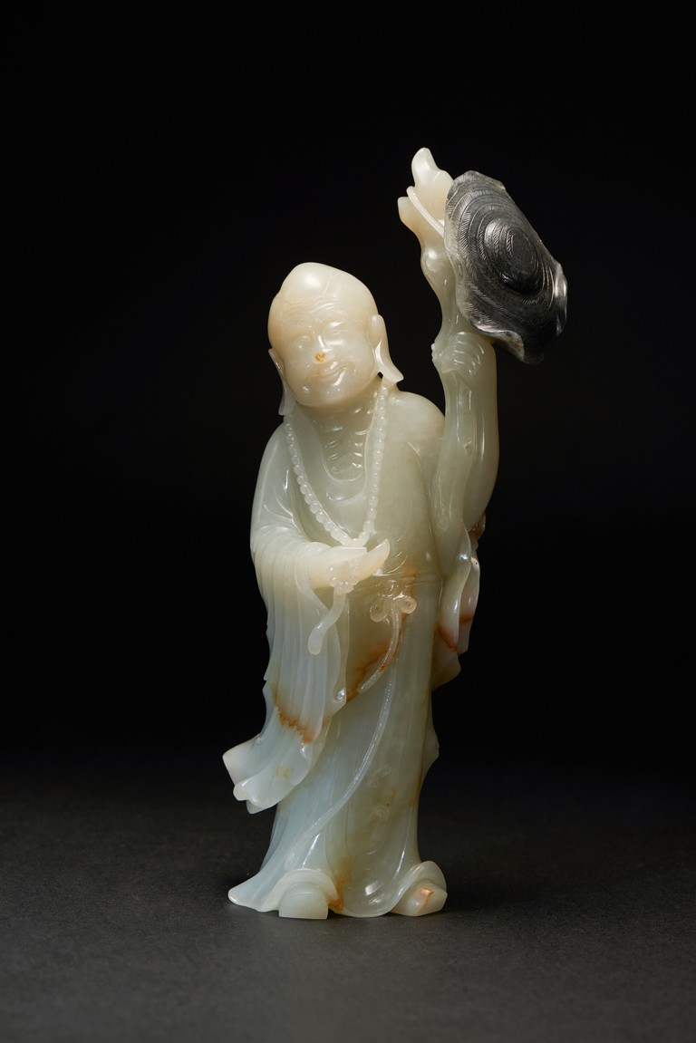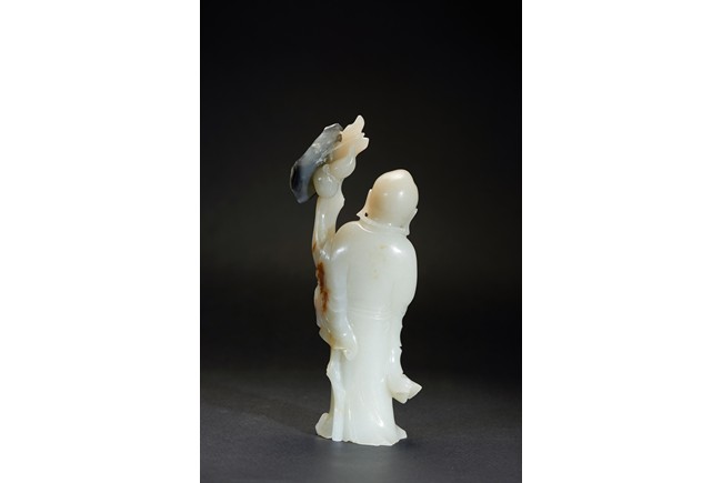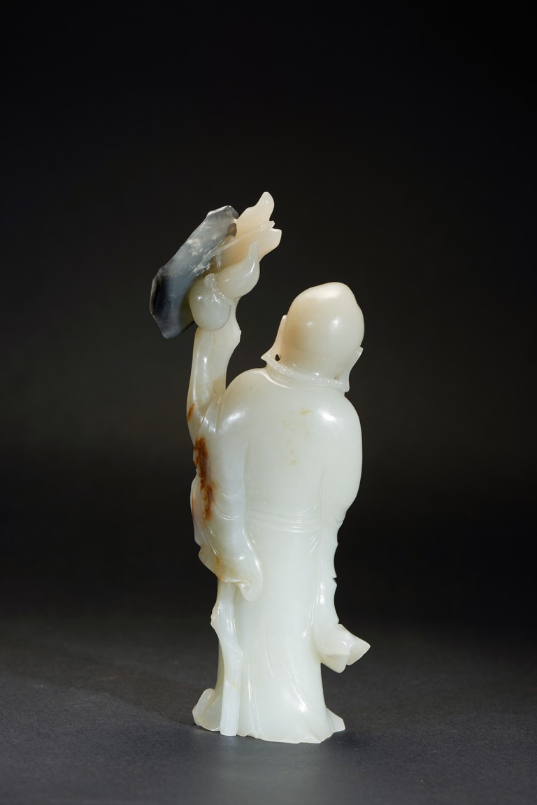 Delicately and skillfully carved, the luohan is shown standing and left hand holding an tree branch crutch, with black jade cleverly carved as hat hanging on the top, his right hand holding bead necklace, wearing long and flowing robes draped in elegant folds, his face with serene expression. The stone is well-polished white tone with russet markings. Qing Dynasty period.