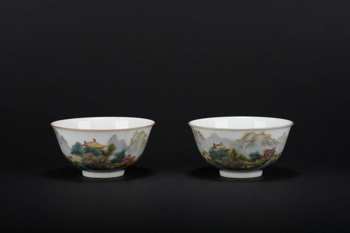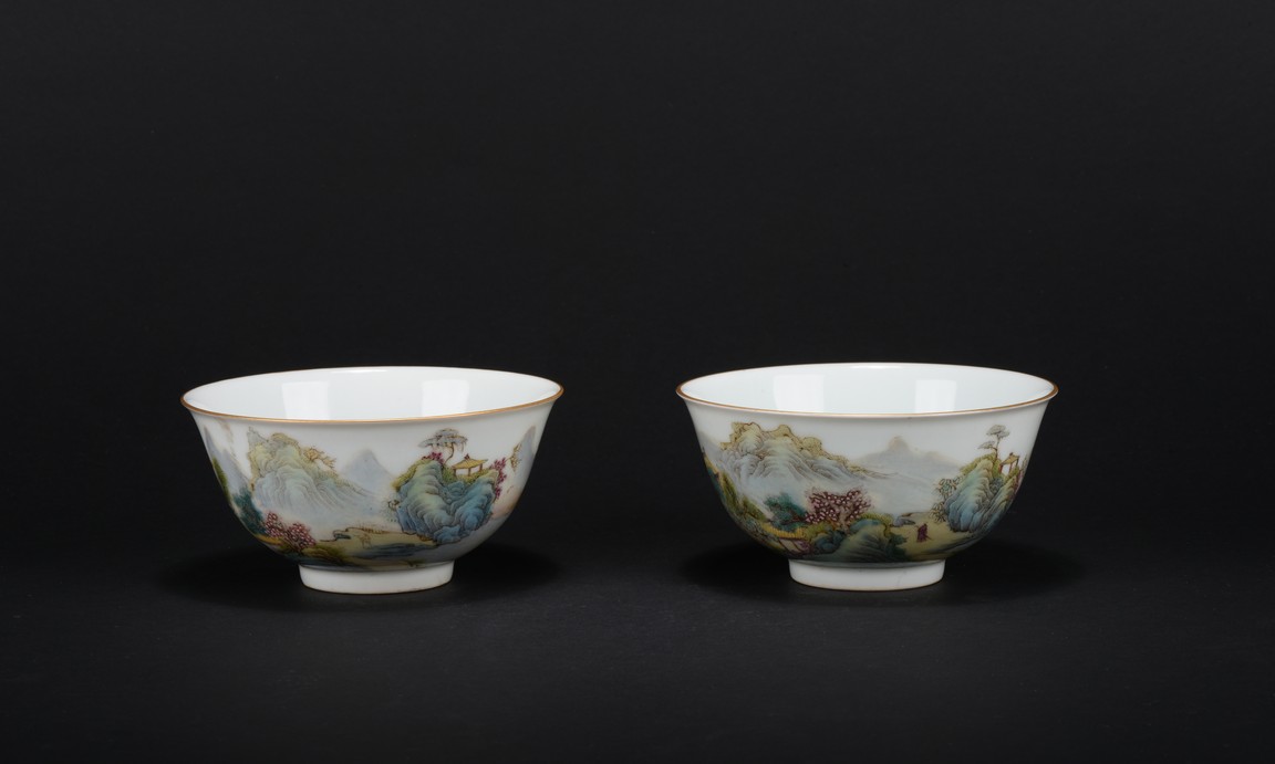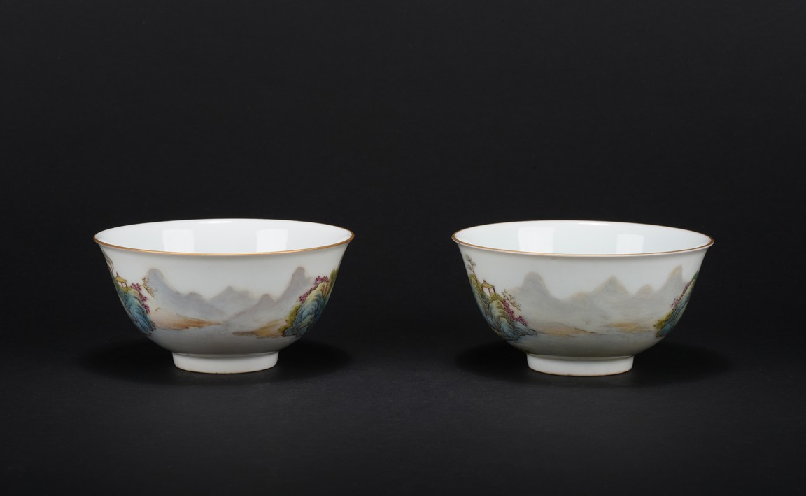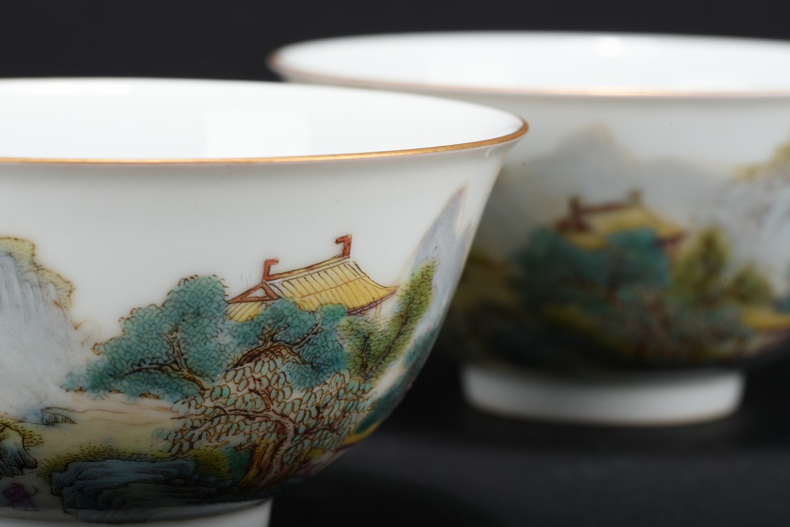 Each delicately potted with deep rounded sides rising from an short foot to an gilt-decorated rim, the exterior finely enamelled with continuous lakeside landscape scene of blue and green mountains to the background and an pavilion behind green trees, the base glazed white and inscribed with the six-character seal-mark. Qing Dynasty Guangxu period.