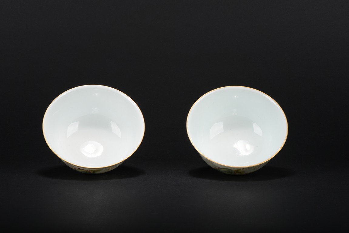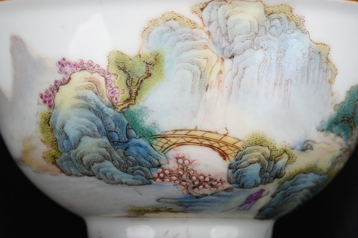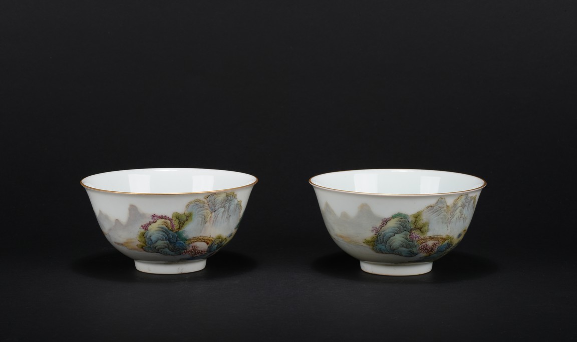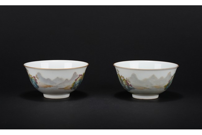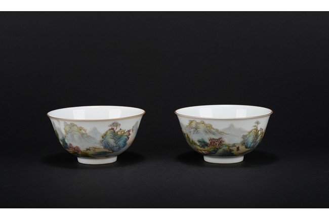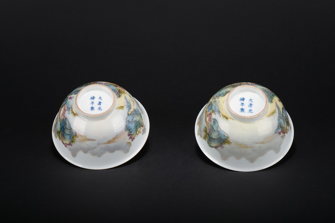Each delicately potted with deep rounded sides rising from an short foot to an gilt-decorated rim, the exterior finely enamelled with continuous lakeside landscape scene of blue and green mountains to the background and an pavilion behind green trees, the base glazed white and inscribed with the six-character seal-mark. Qing Dynasty Guangxu period.