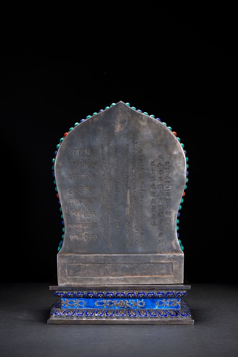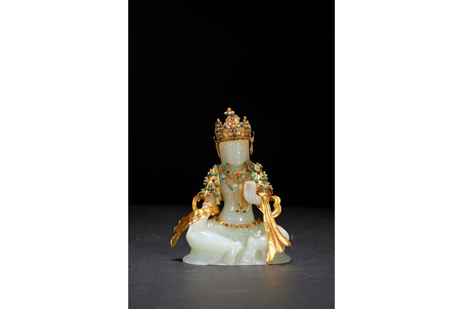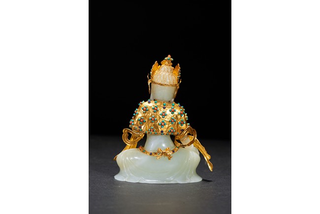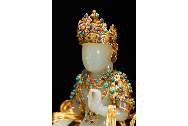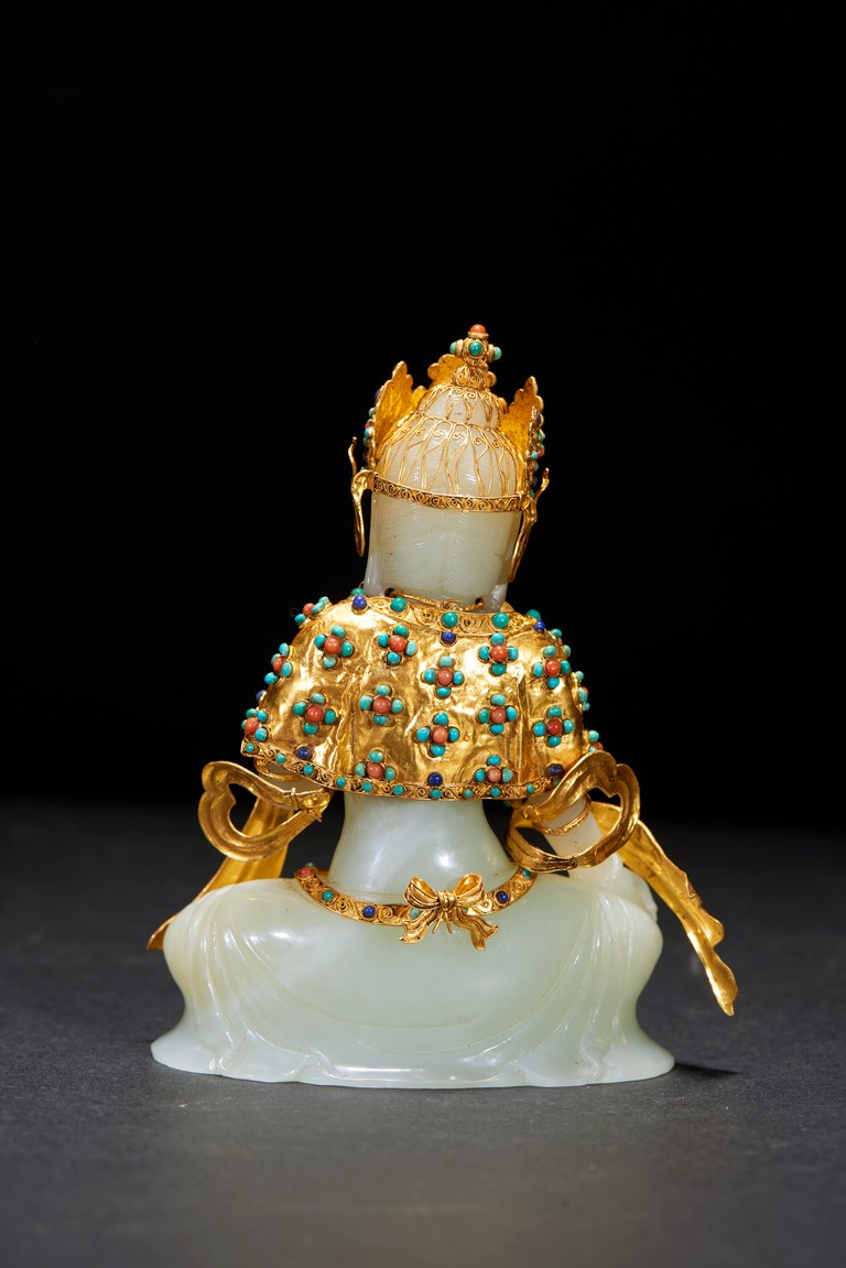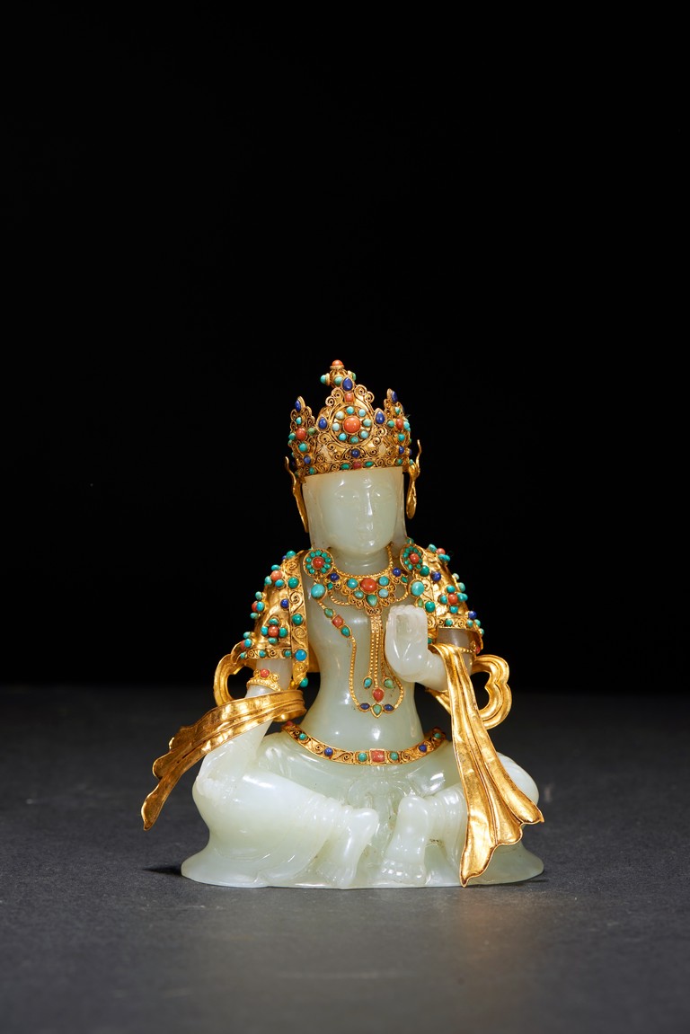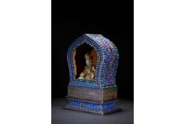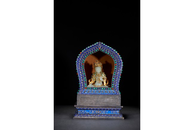 Contained within an elaborately worked silver shrine, the inner front frame finely embellished with turquoise, lapis lazuli, and coral beads, with outer rim enamelled in blue with flame motifs. The sides finely cast and enamelled with buddhist's treasures enclosed by turquoise, lapis lazuli, and coral beads. The bottom of the shrine with vajra and floral motifs, enclosed within scrolling foliage pattern. The base with double lotus petals enamelled in blue; the white jade bodhisattva statue is shown seated with left hand raised in tarjani mudra, symbolizing vigilance, and right hand rested on knee, wearing exquisite necklace, magnificent crown, and wheel-shaped earrings, all adorned with lapis lazuli, coral, turquoise, and spinach jade beads, and billowing sashes around both arms, all cast in gold foil. His face is shown with meditative expression, flanked by pendulous earlobes, and the jade is of even white tone.