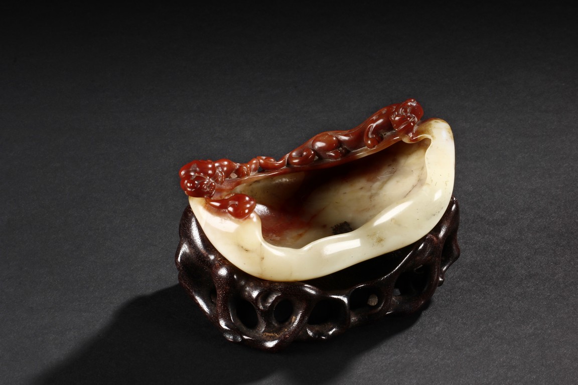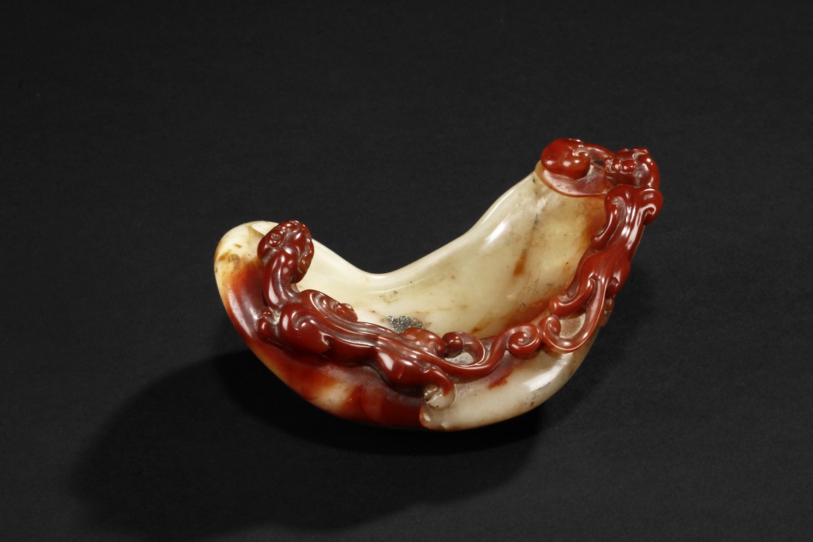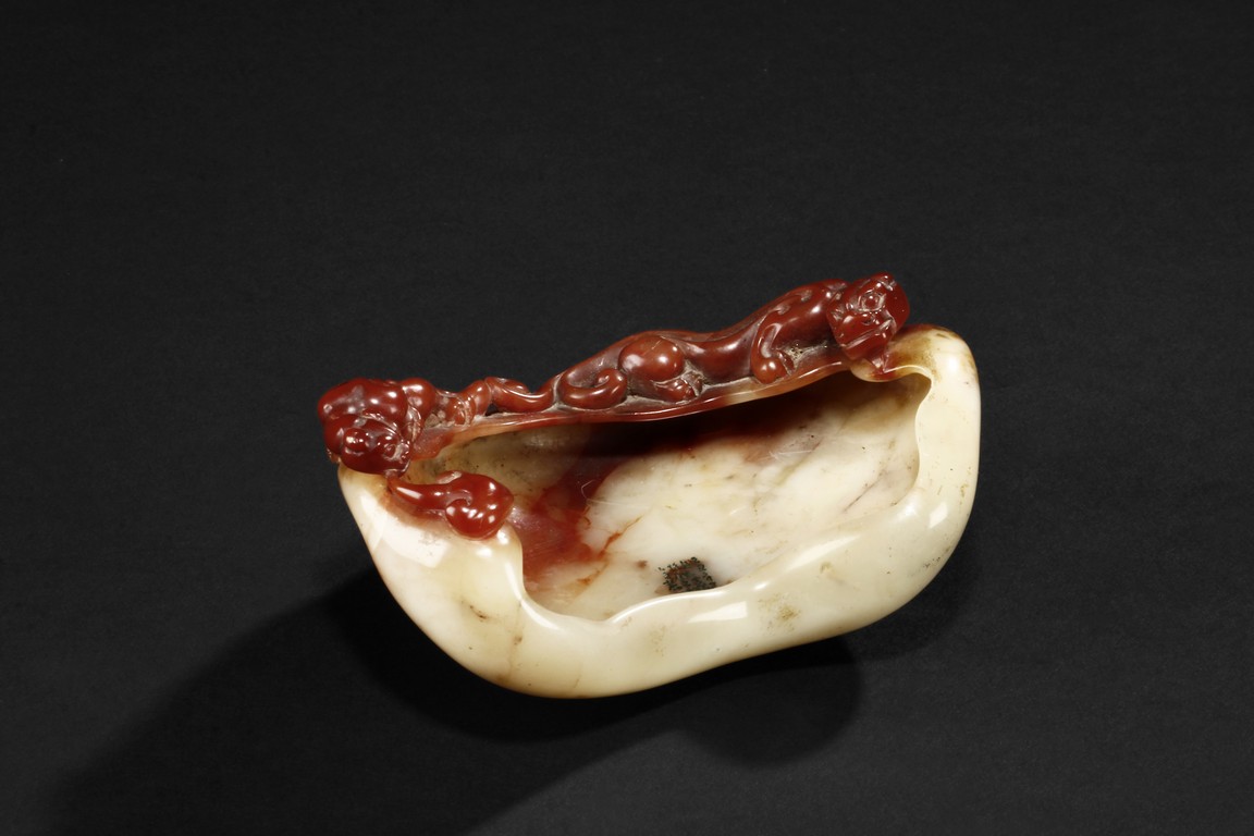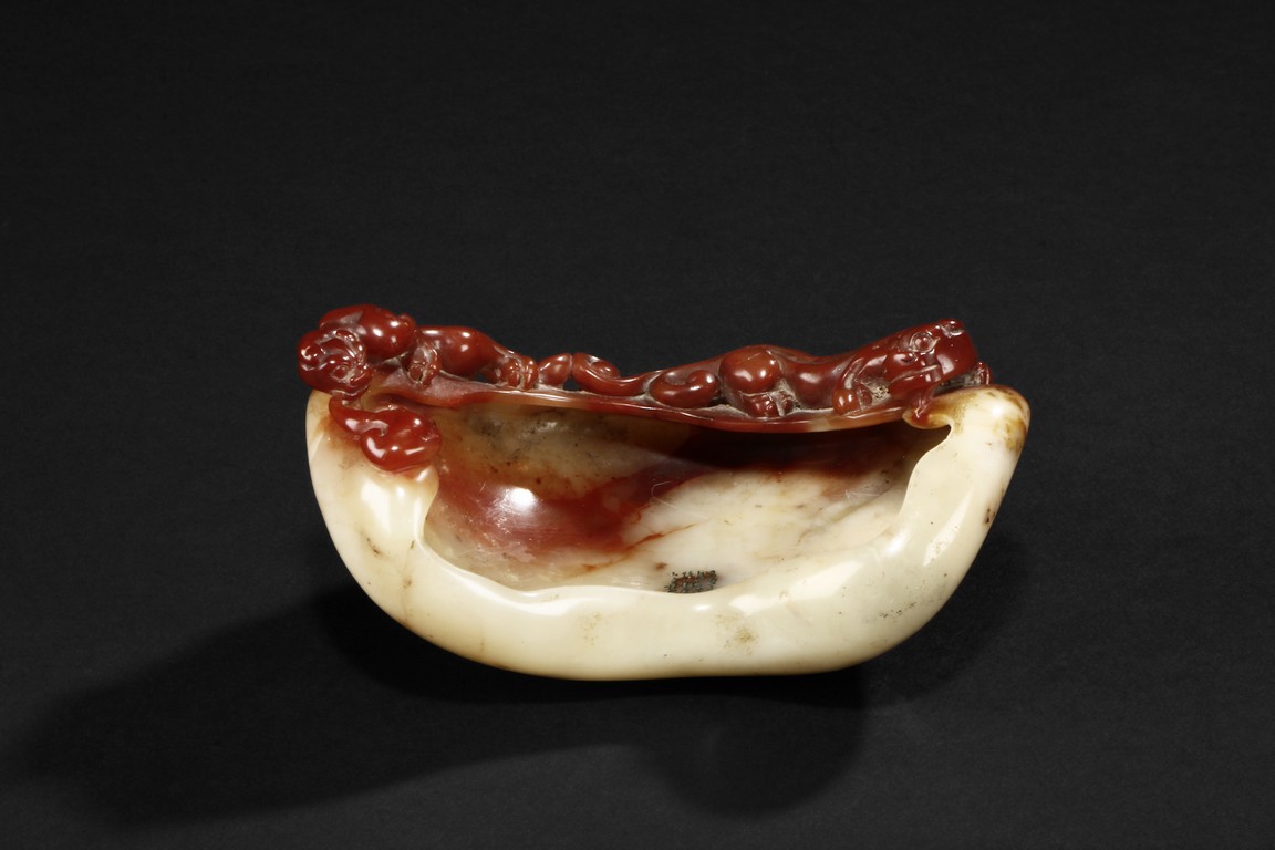 The waterpot was carved gracefully into an leaf-like container, the top side cleverly carved into two mythical beasts utilizing the natural red color, the center carved with Chinese poem and painted green, and the reverse carved with four characters. Qing Dynasty period.