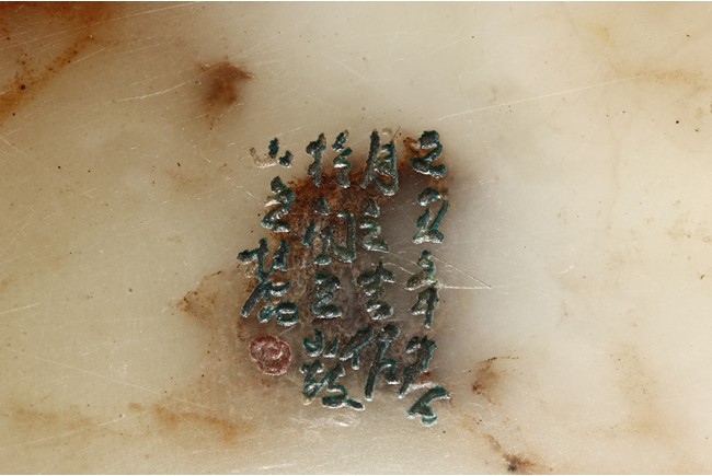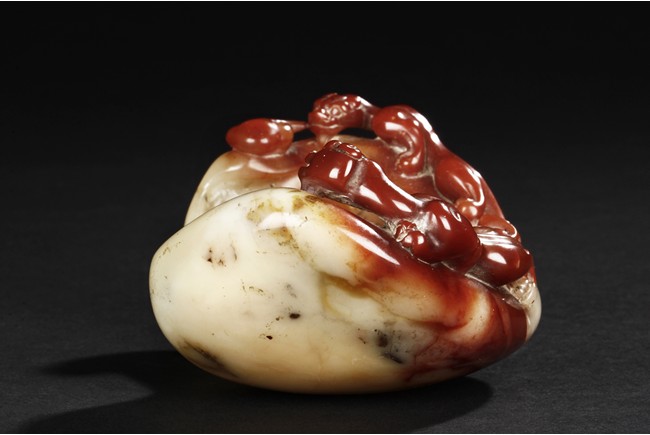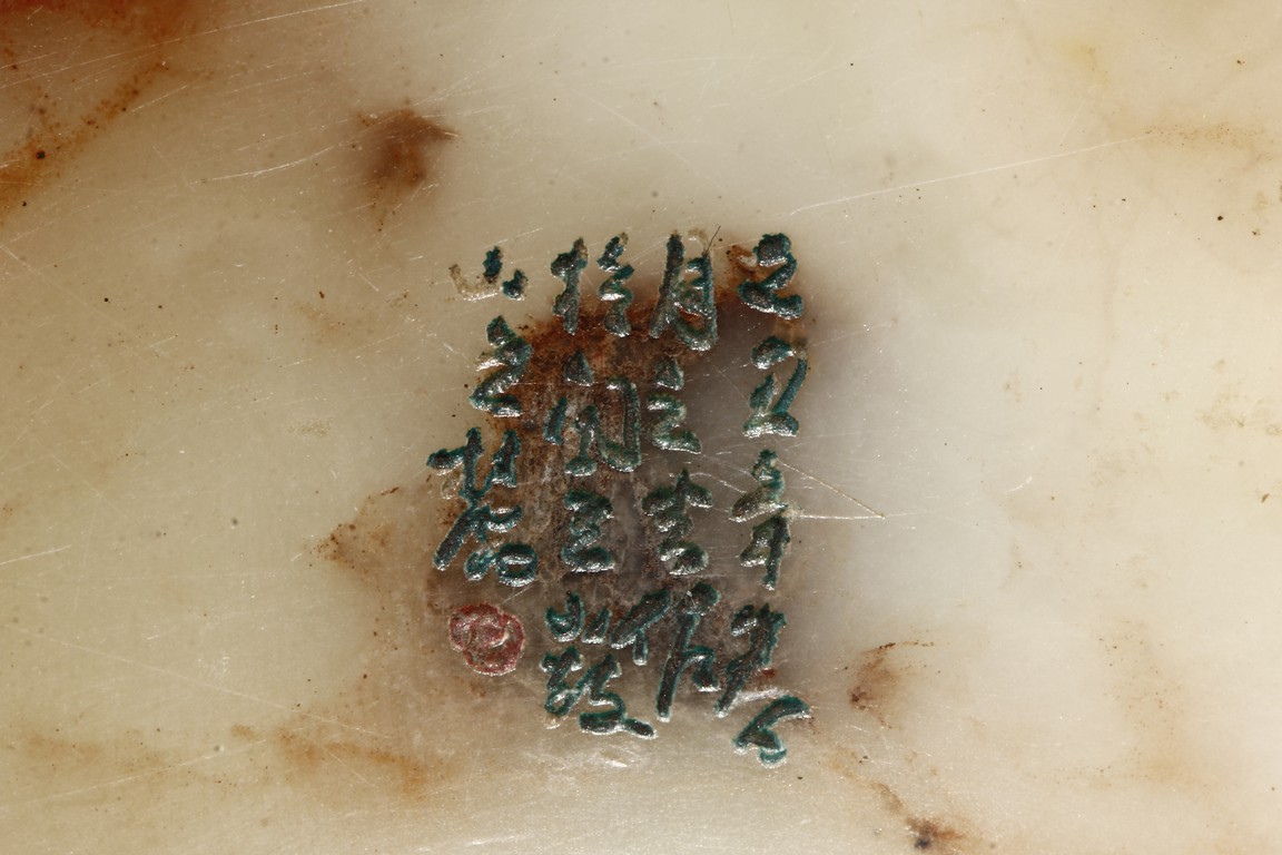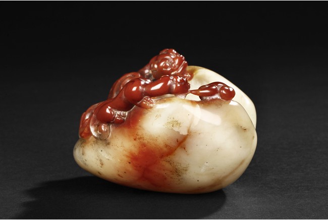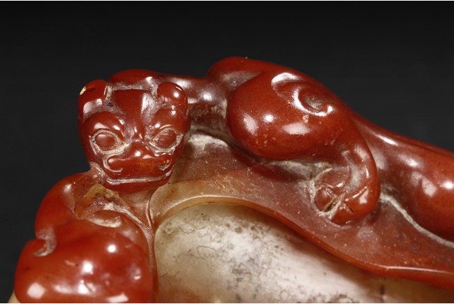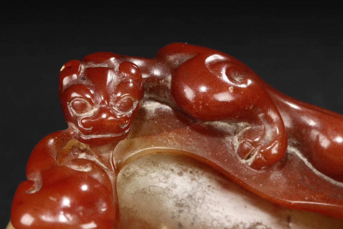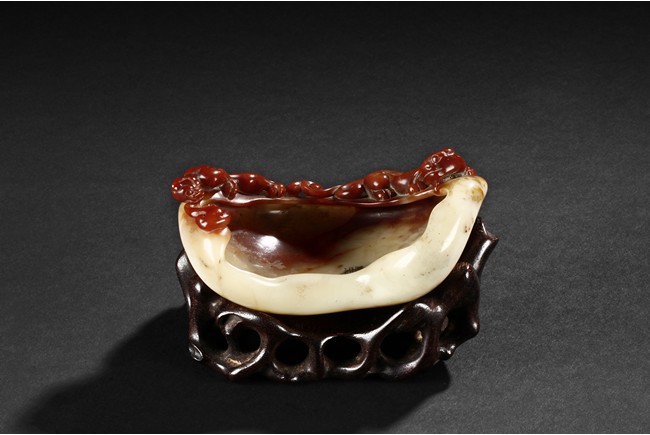 The waterpot was carved gracefully into an leaf-like container, the top side cleverly carved into two mythical beasts utilizing the natural red color, the center carved with Chinese poem and painted green, and the reverse carved with four characters. Qing Dynasty period.
