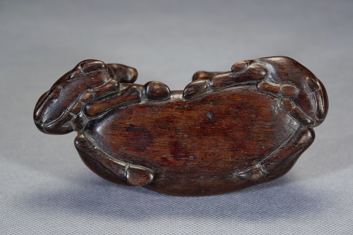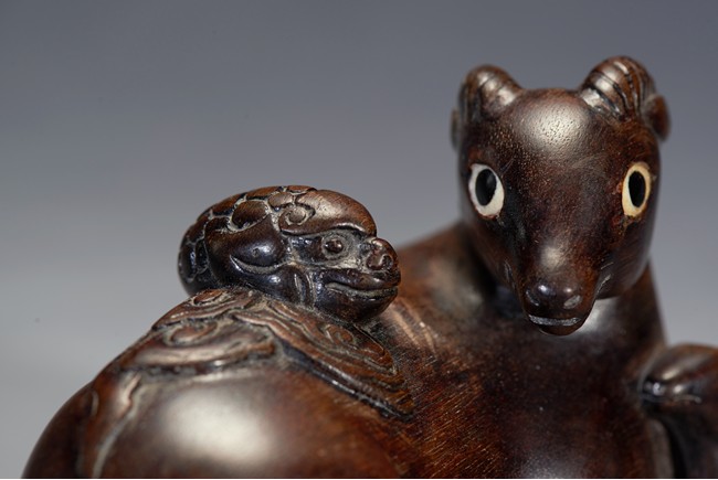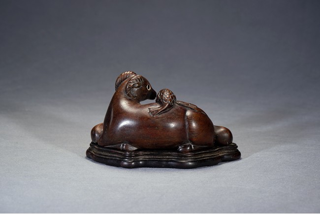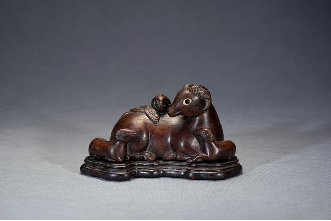 Finely carved with an recumbent ram with head turned back, with two smaller baby rams seated against with legs tucked under body on both sides, the back carved with an mythical beast on top. Republic period.
