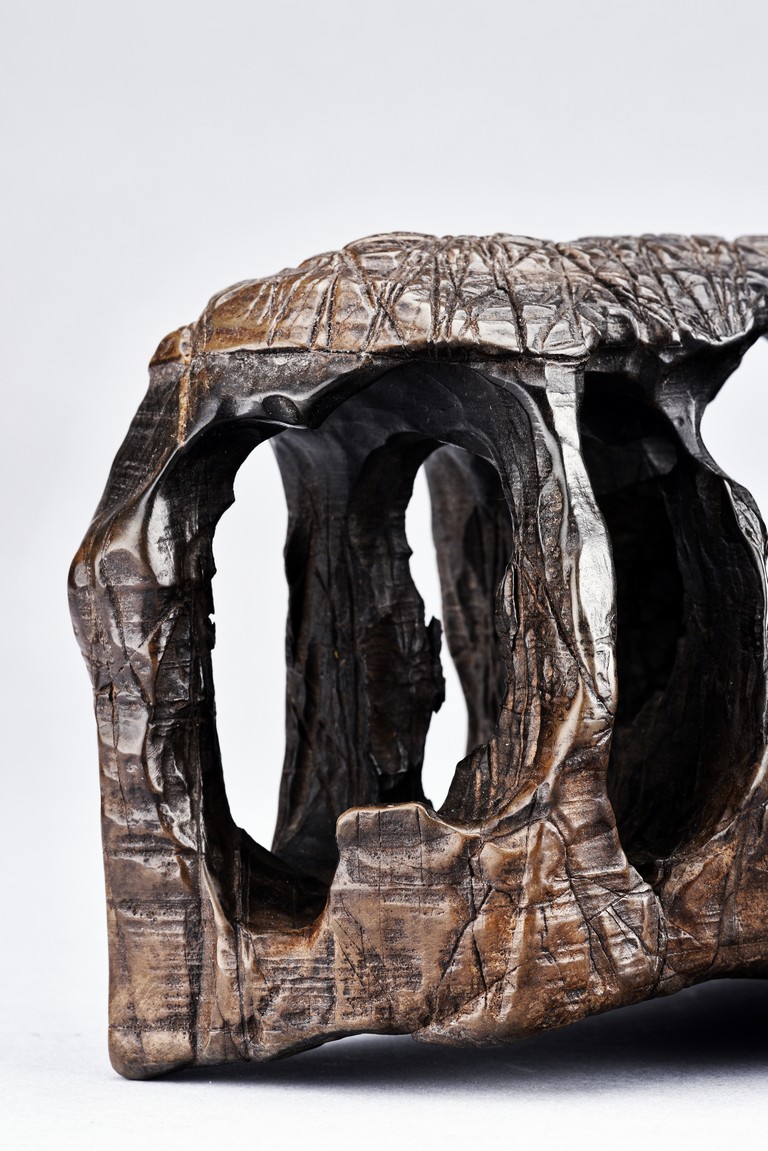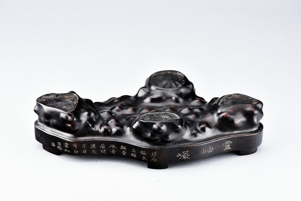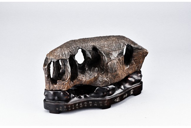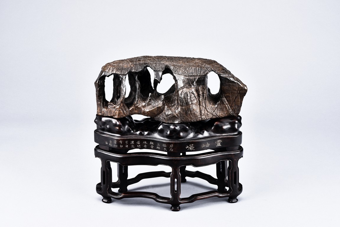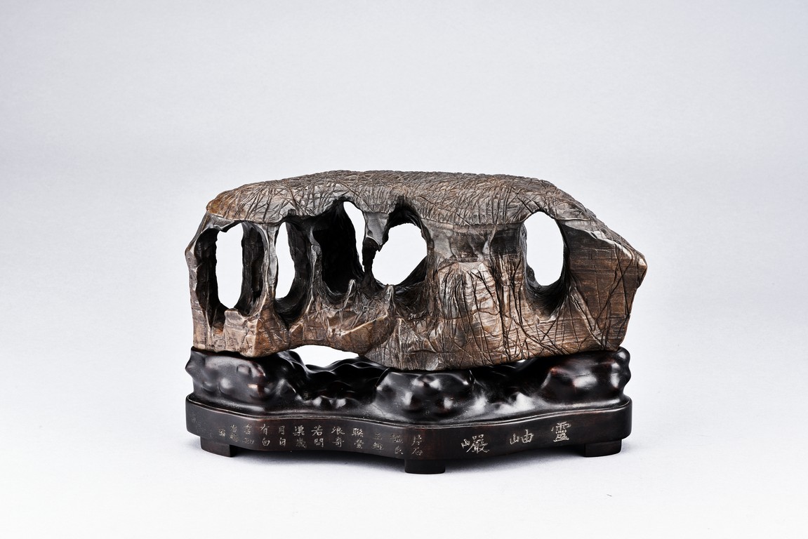The scholar's rock is worked into horizontal form with irregular holes of different sizes and richly textured surface. The original stand is inscribed with script and artist's mark. Qing Dynasty period.