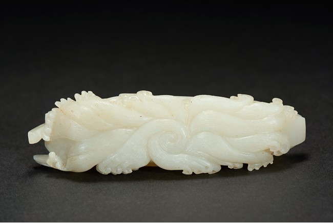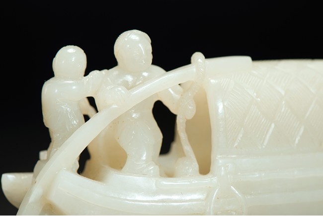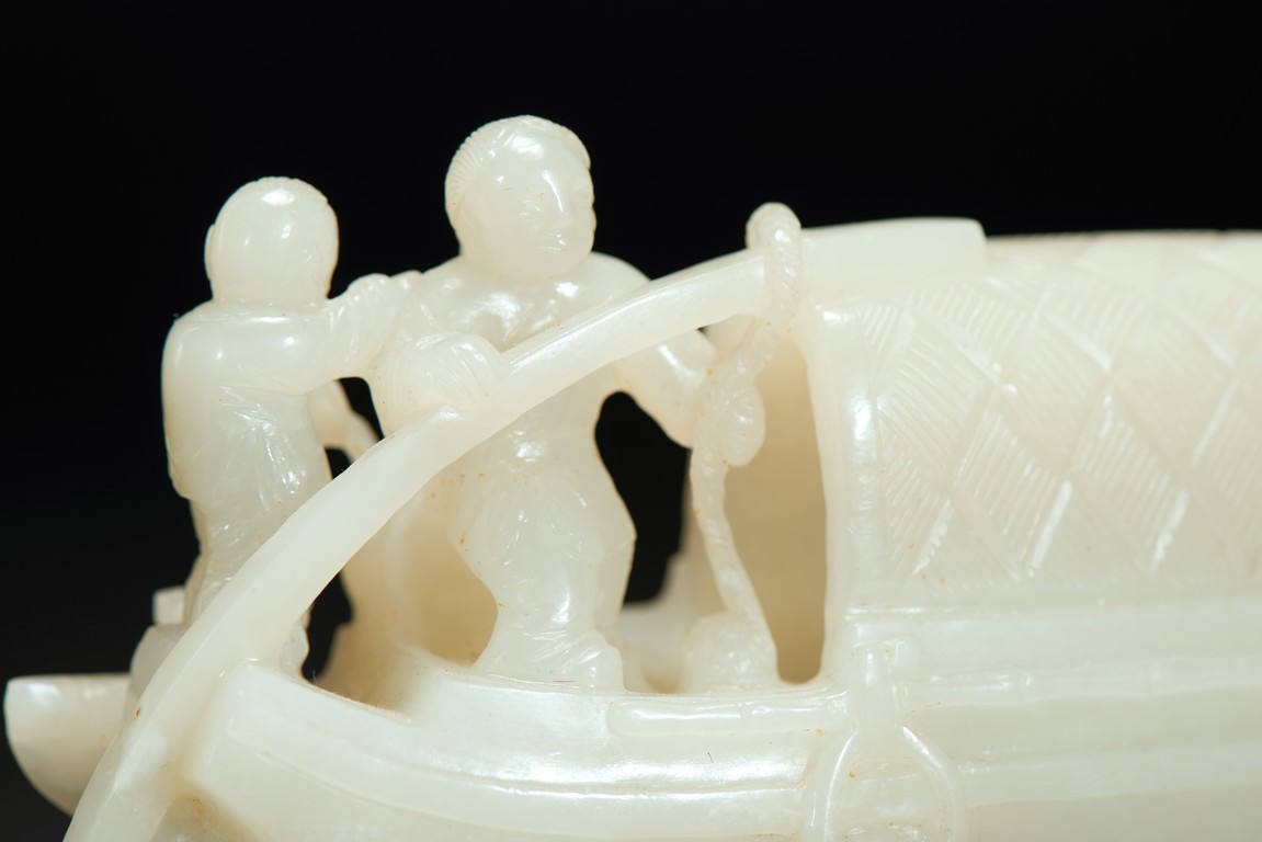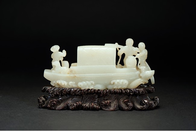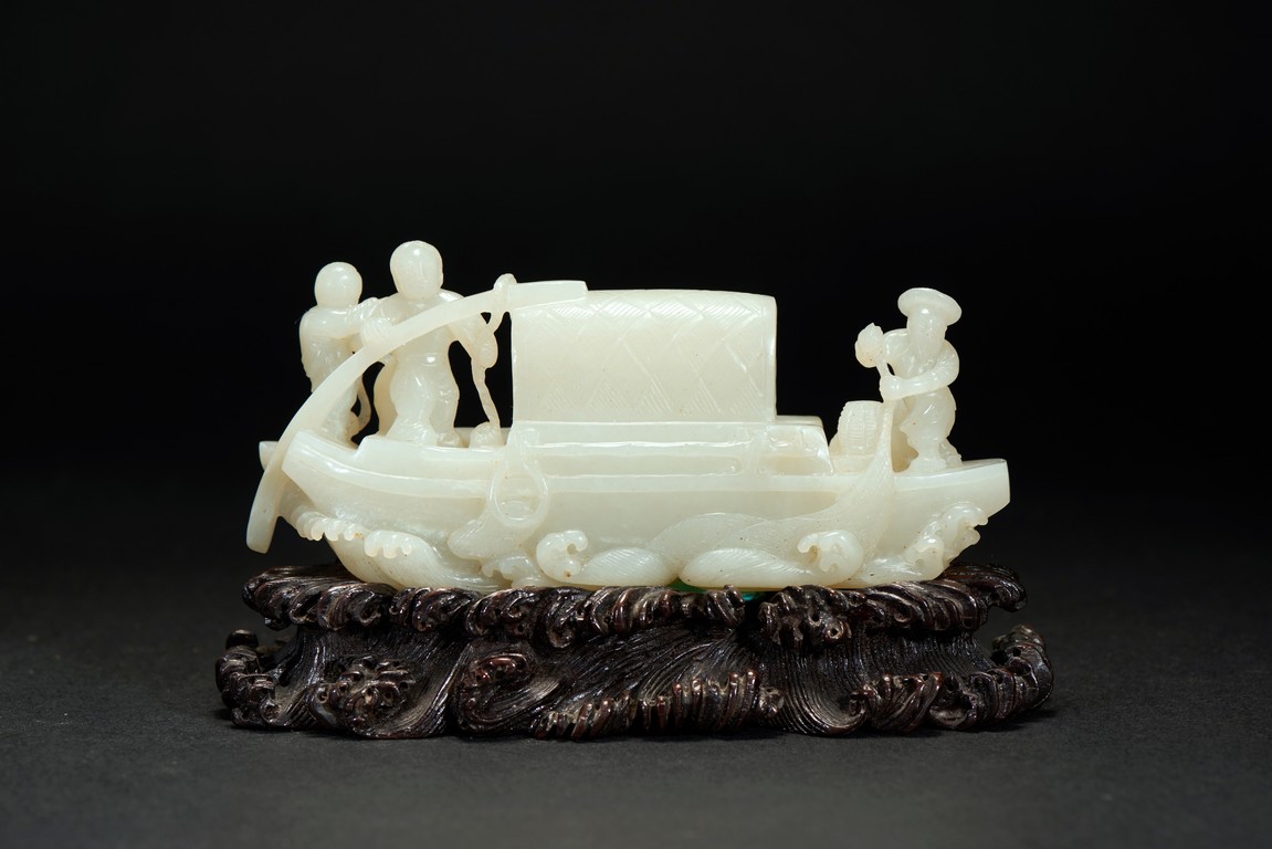 Finely carved with three figures on an long boat with woven awning, one man standing next to an fish basket manning the long pole with one hand and holding an young boy with the other, the other man on the far and of the boat with both arms stretched pulling the net from the sea, closed to the man an dog crouching on the deck.The underside well carved with fine incised markings of swirling crested waves, the stone of even white tone , presented upon an finely carved wood stand with intricately carved waves.