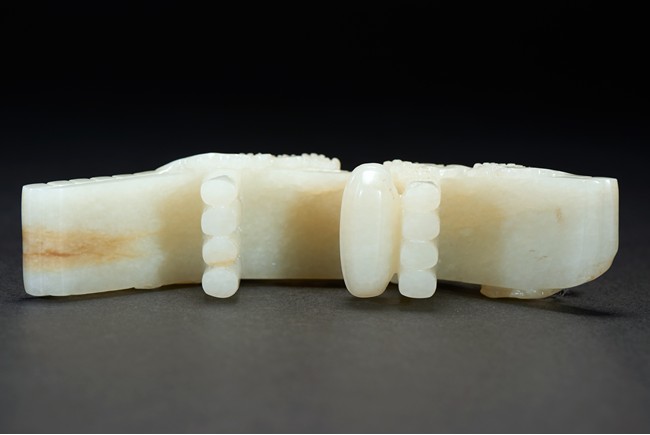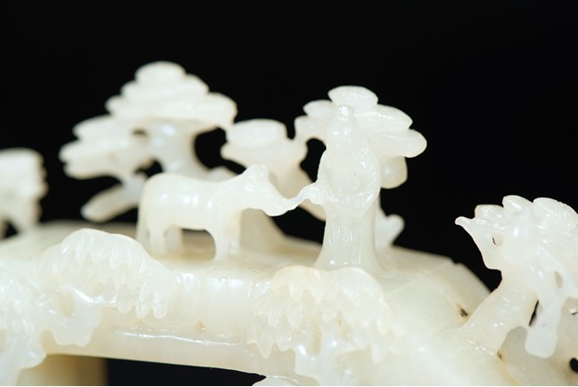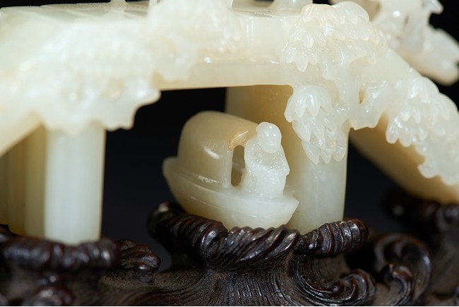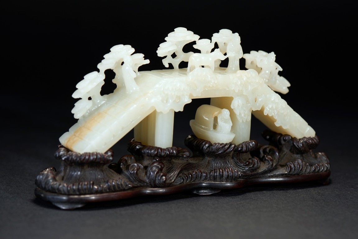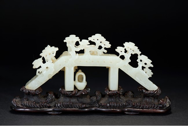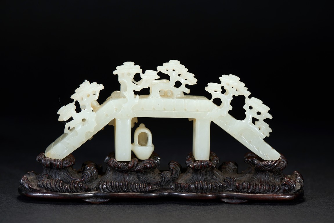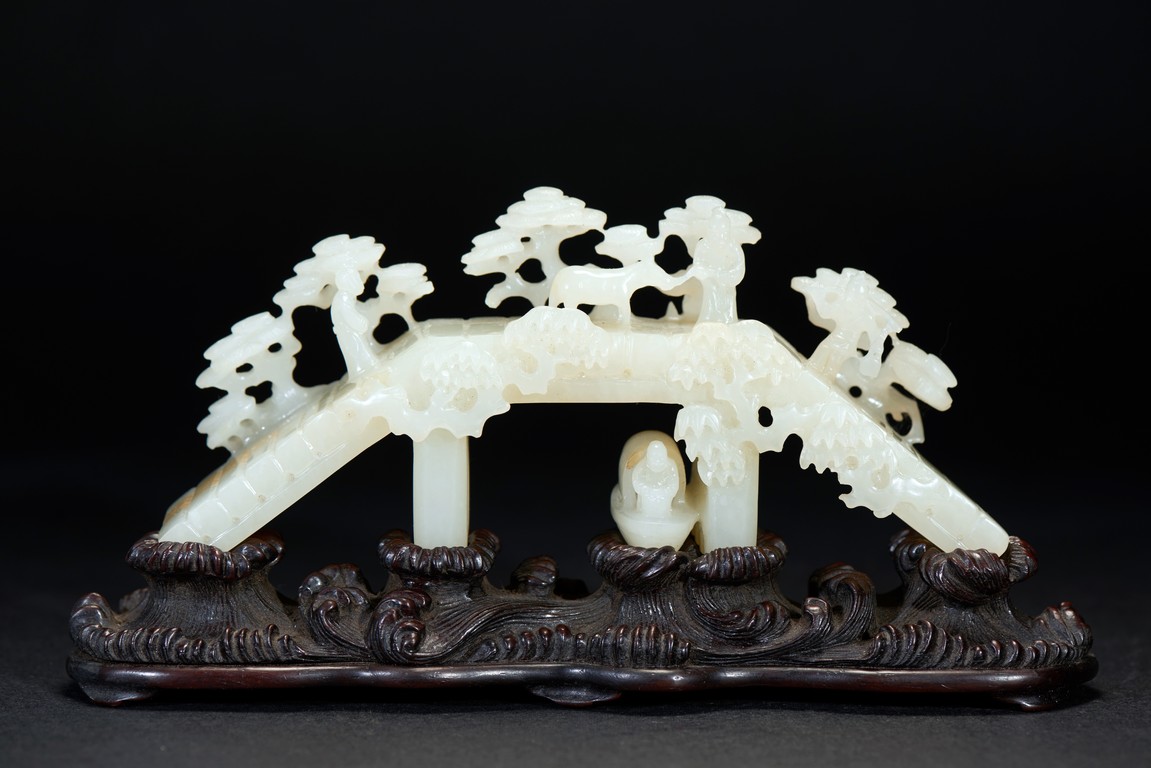 Carved as an arched bridge flanked with pine and wutong trees, including an elderly figure ascending; an figure standing atop holding an rope tied to an mule; an figure carrying an bucket over shoulder; and an small boat travelling under the bridge. The stone is of semi-translucent even white tone with caramel inclusion worked into the overall design. Accompanied with an hardwood stand carved into scudding water waves under the bridge. Qing Dynasty period.