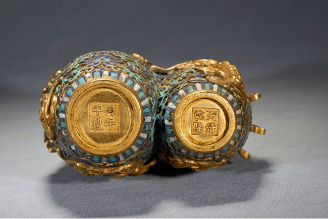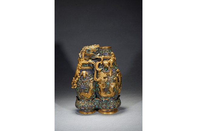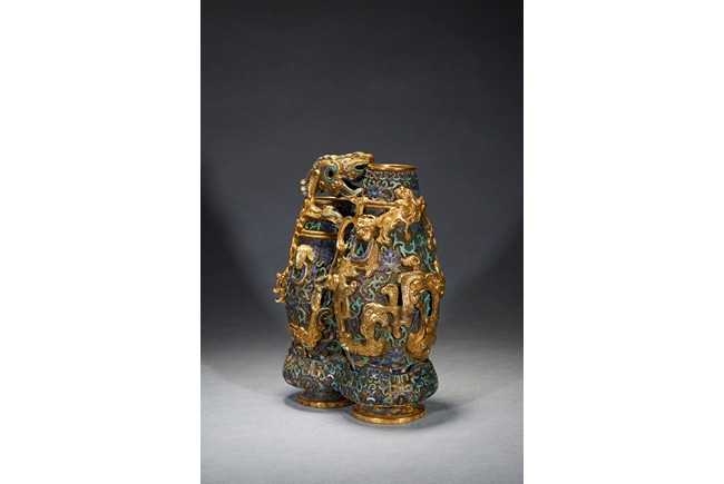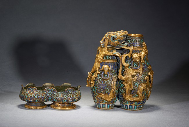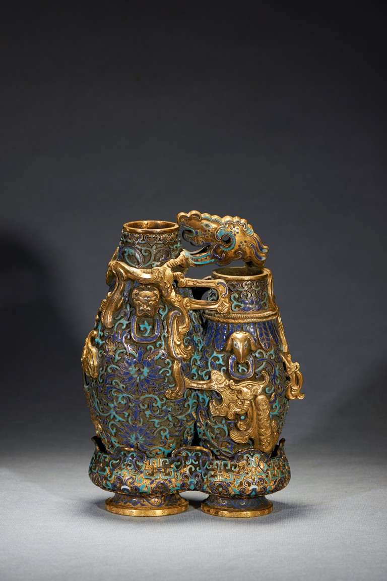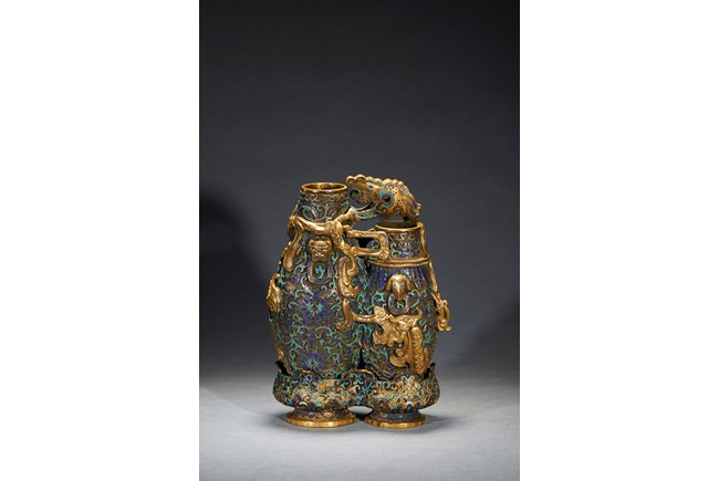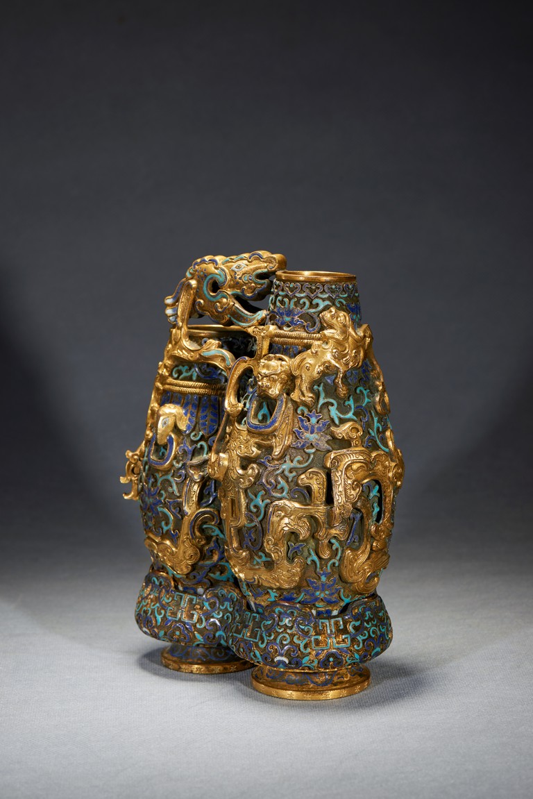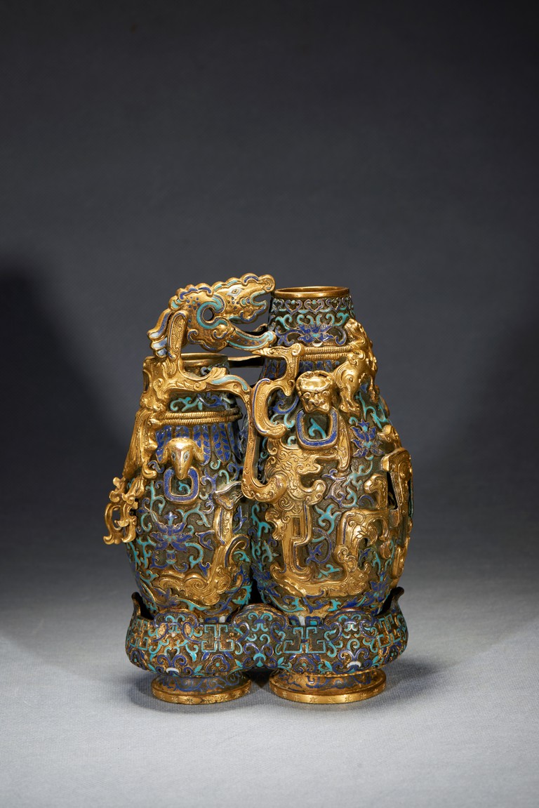 The conjoined vases of upright elongated oval shape each rising from an separate circular foot, decorated with animal mask-handles, elaborately embraced around the exterior with gilt dragons and phoenix in relief against an lotus-scroll turquoise and lapis lazuli tone enamels.