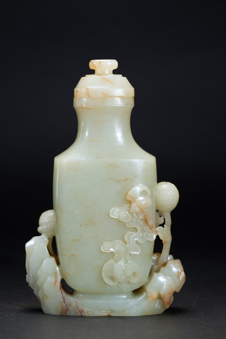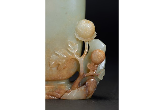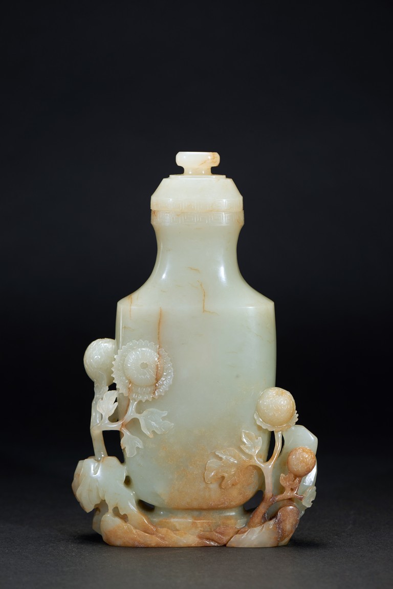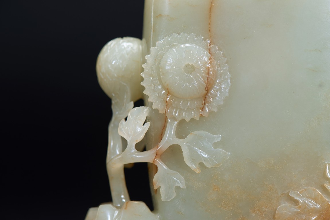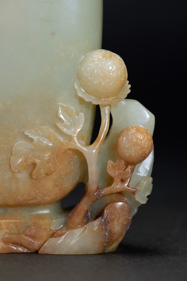 Modelled in the form of flattened baluster vase borned on rocky outcrops, the body finely carved in high relief with chrysanthemum flowers issuing from rocks, the stone well polished with russet inclusions. Qing Dynasty period.