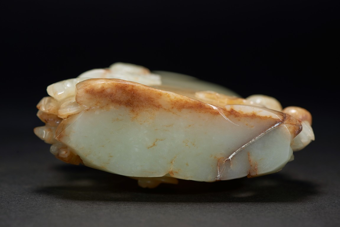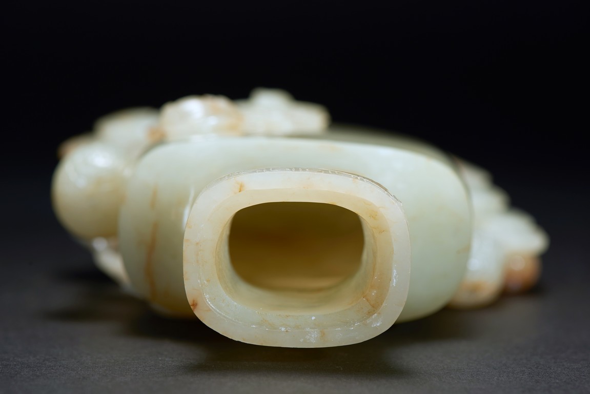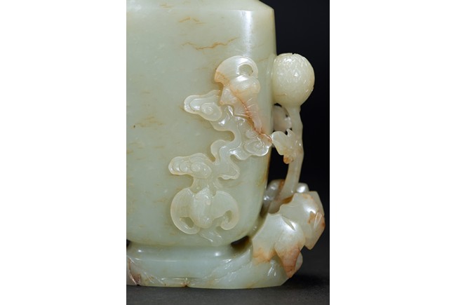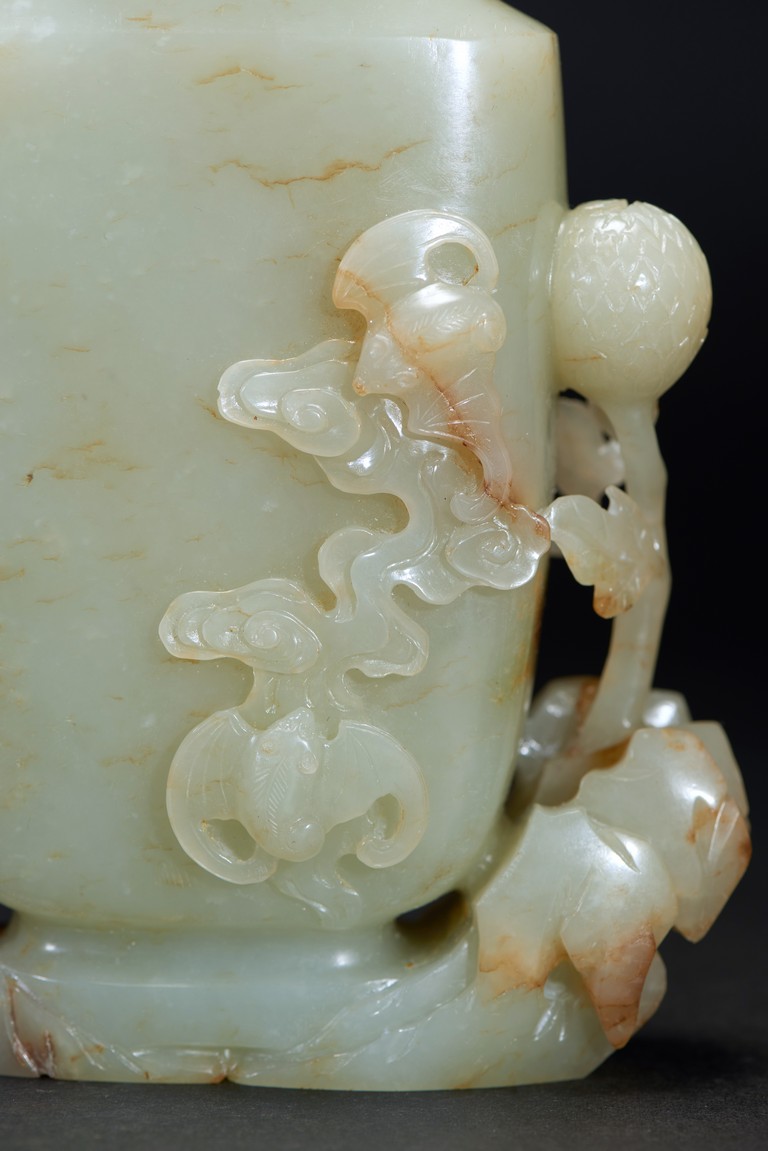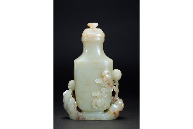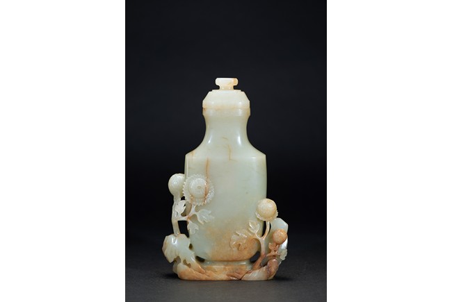 Modelled in the form of flattened baluster vase borned on rocky outcrops, the body finely carved in high relief with chrysanthemum flowers issuing from rocks, the stone well polished with russet inclusions. Qing Dynasty period.