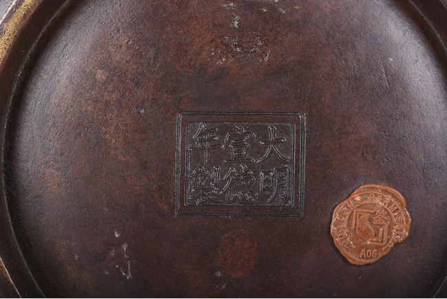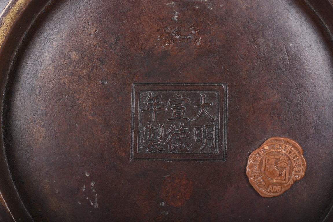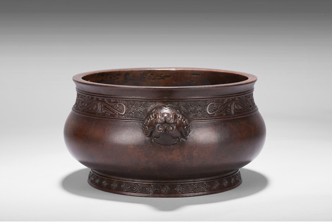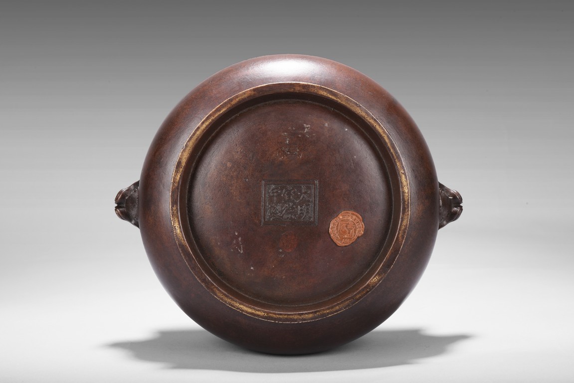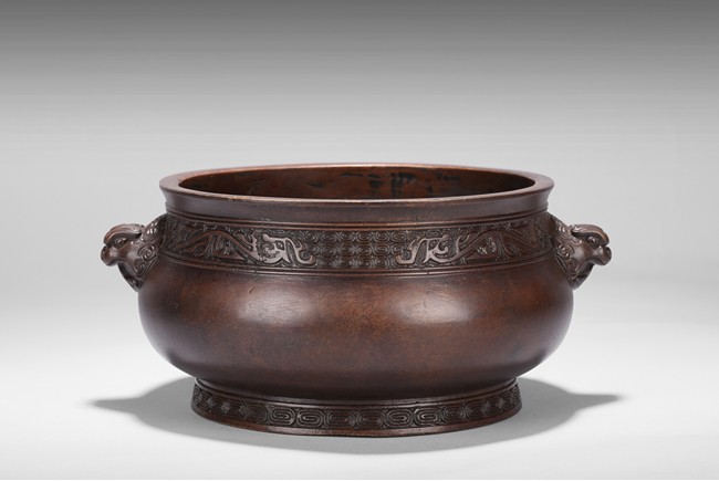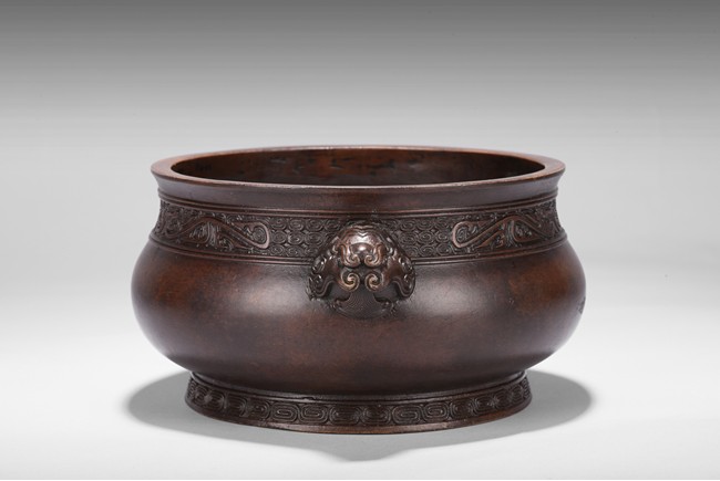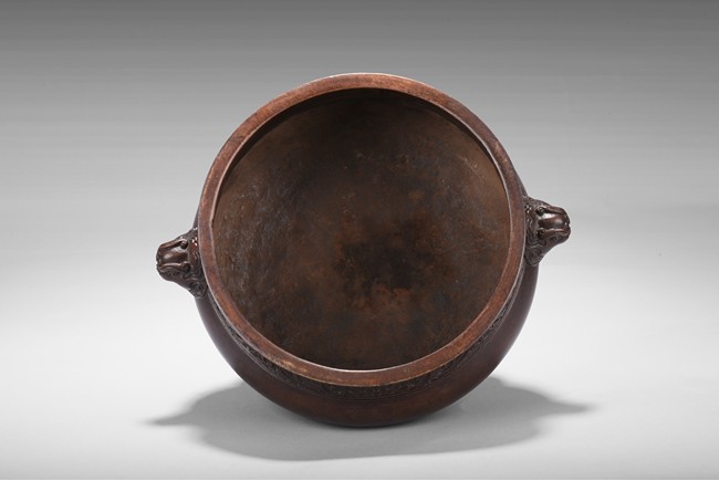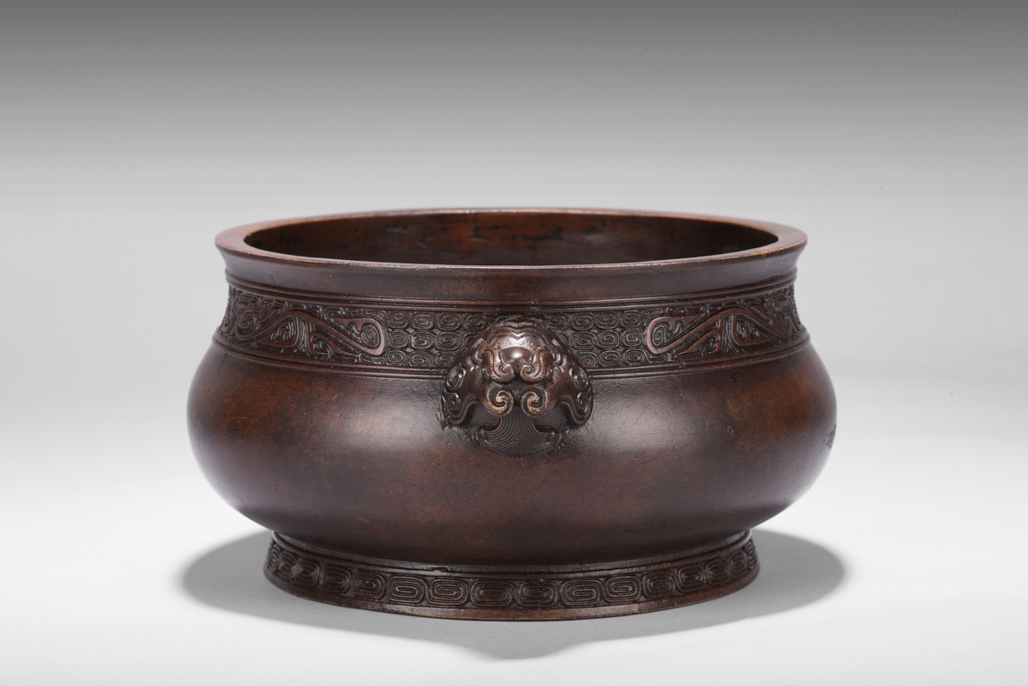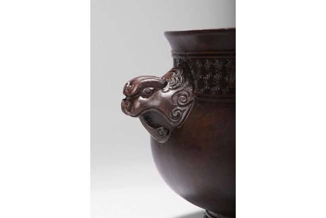 Finely cast, the body rising from an spreading foot to an flared rim, flanked by an pair of mythical beast mask handles, the neck encircled by an band with an pair of confronting chilong reserved on an leiwen ground, the foot with an stylized key fret border, the base impressed with an six character 'XUANDE' mark. Qing Dynasty period.