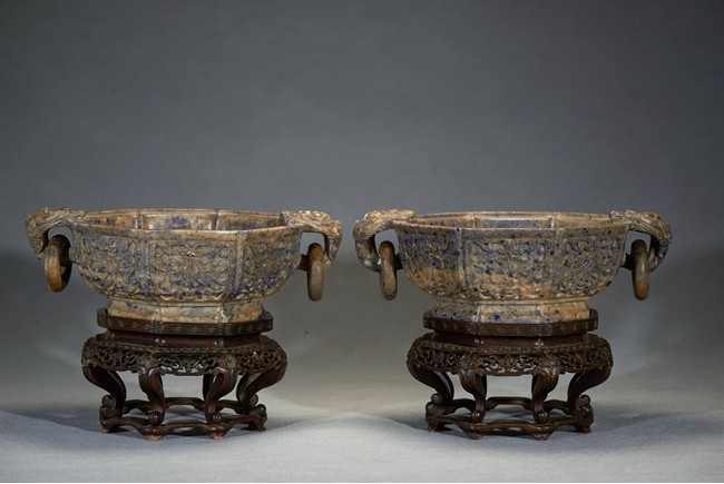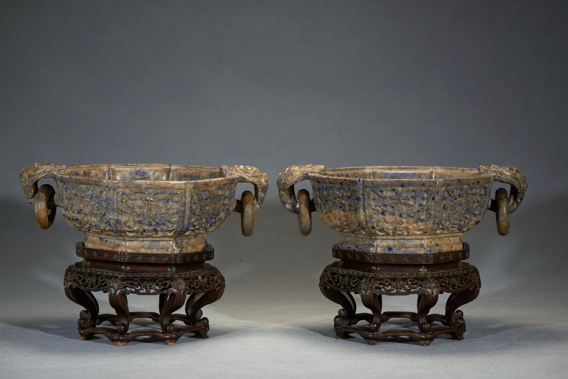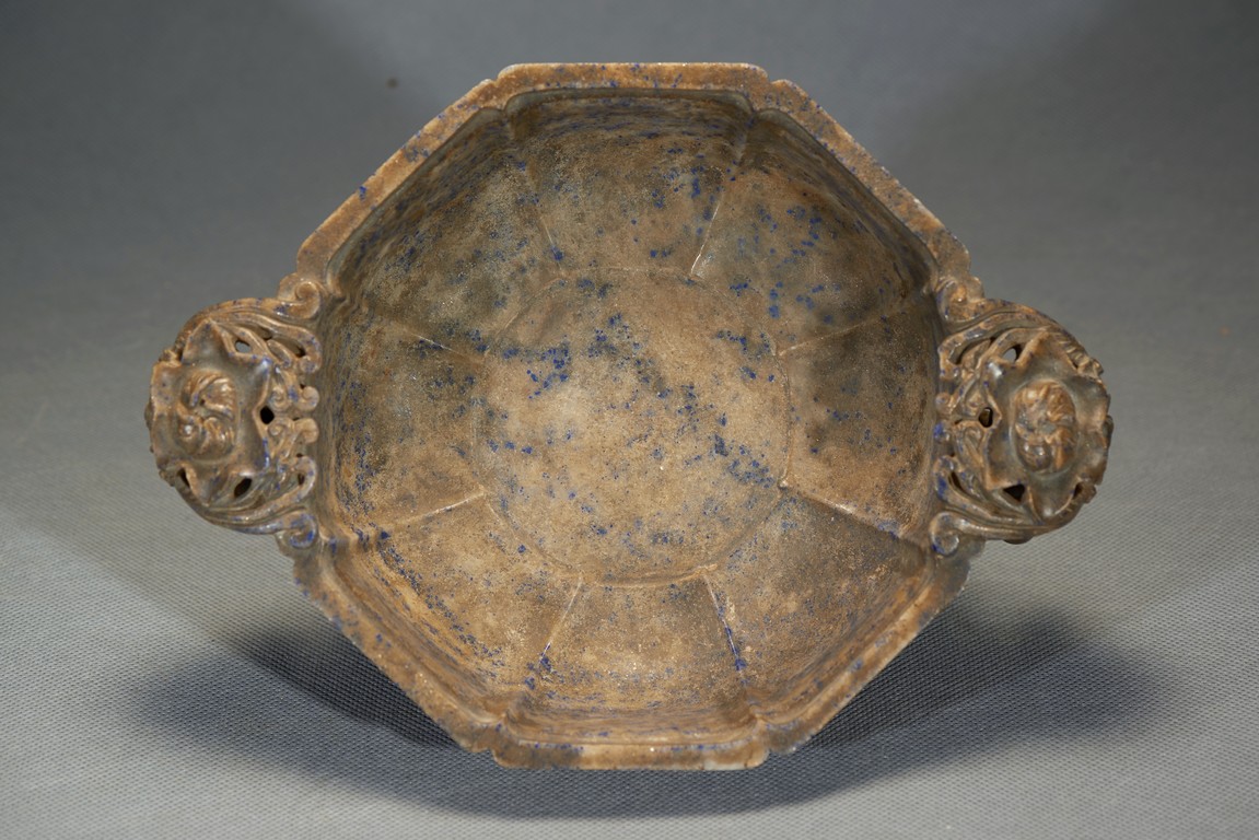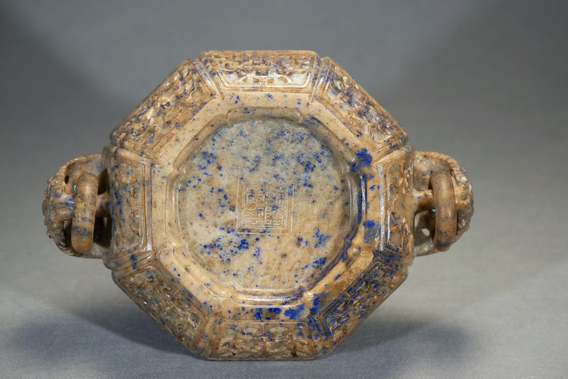 Of octagonal from, each side carved with an shaped panel enclosing double fish motif in relief, the two handles suspended with loose rings, the base with four character mark. Qing Dynasty period.