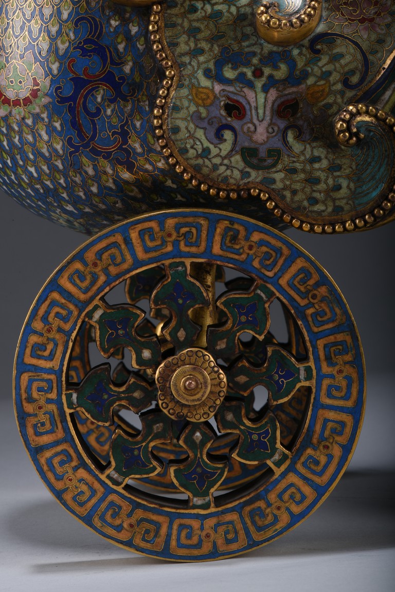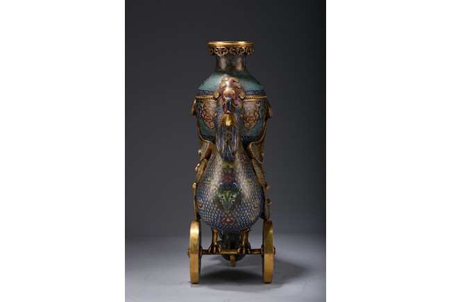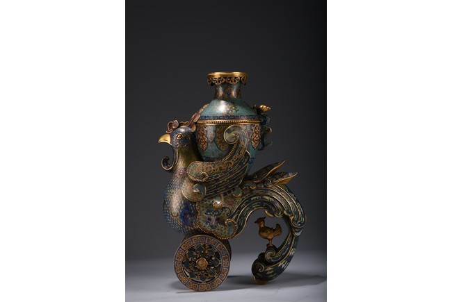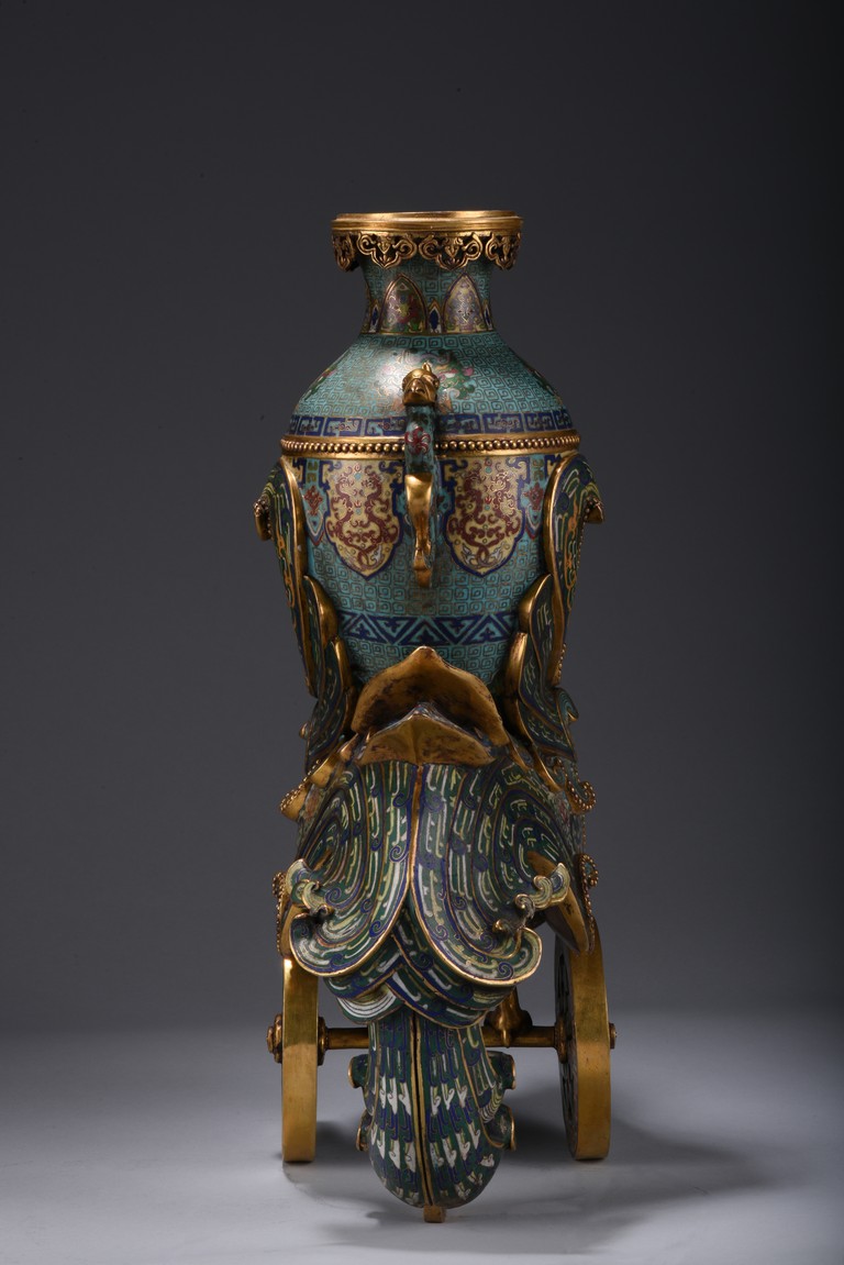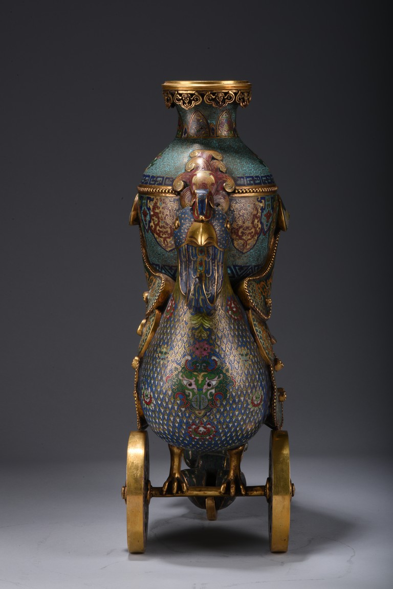 Elaborately modelled into an phoenix perched on an axle between two stationary spoked wheels that decorated with key-fret band rim, the feather enamelled with scrolled cloud and lotus pattern, bearing turquoise ground baluster vase on its back, below the larger phoenix curling tail standing an smaller golden baby phoenix. Qing Dynasty period.