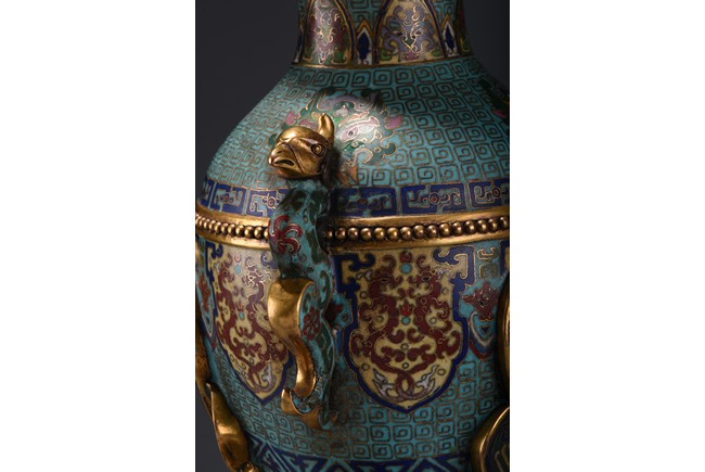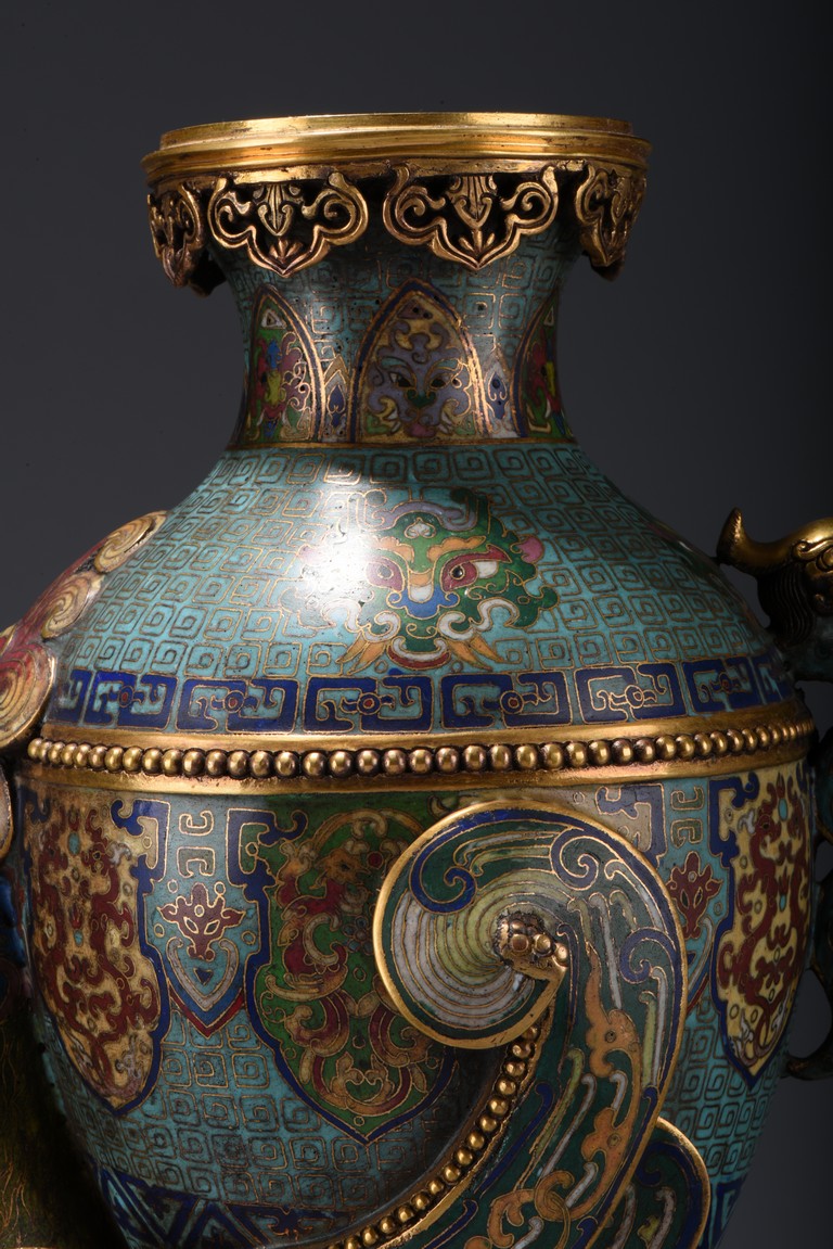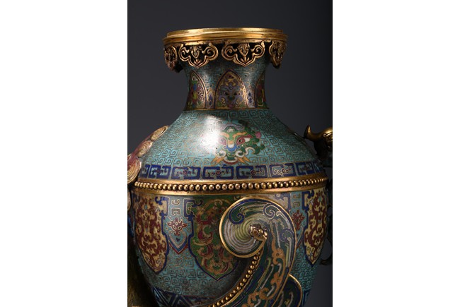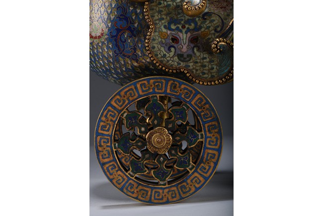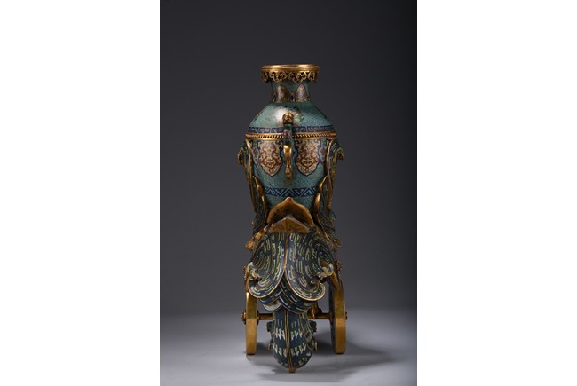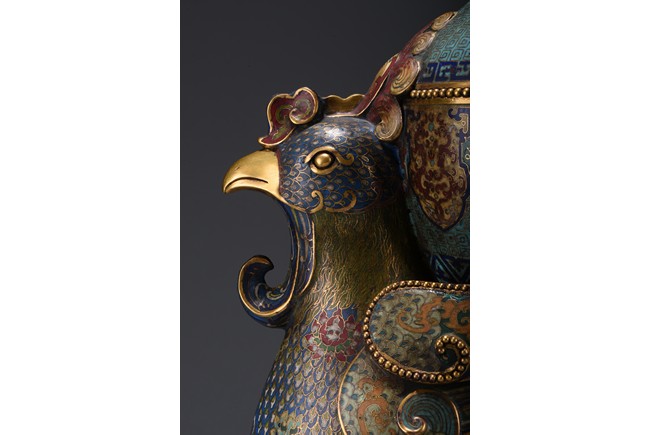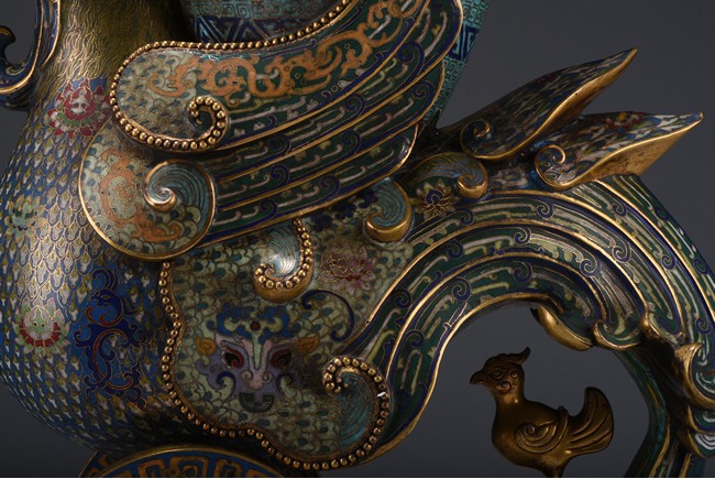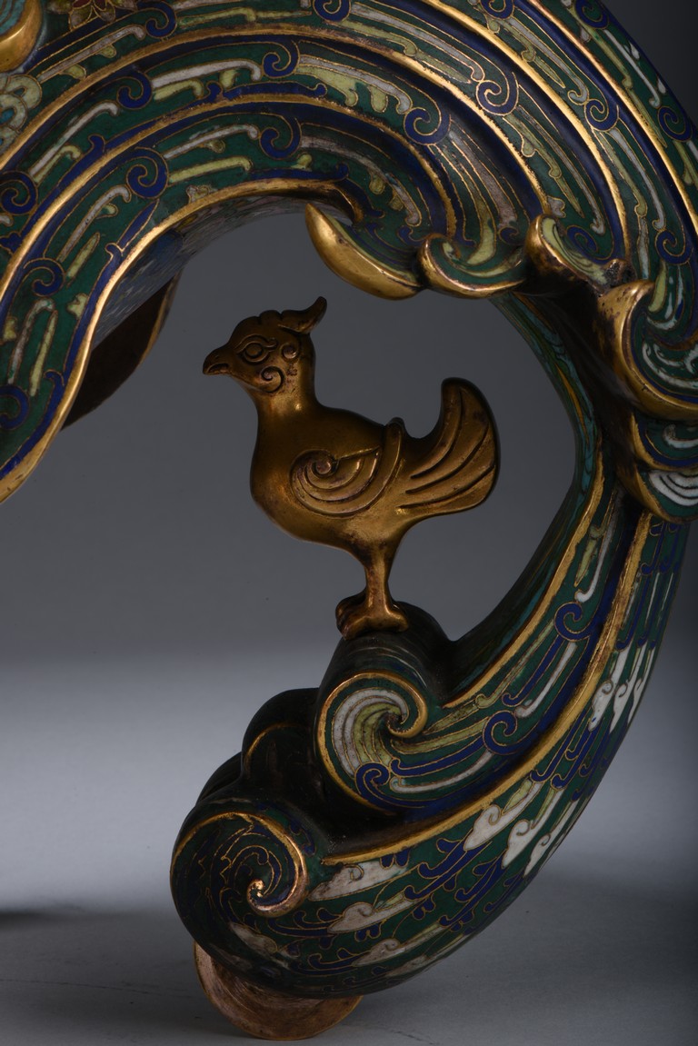 Elaborately modelled into an phoenix perched on an axle between two stationary spoked wheels that decorated with key-fret band rim, the feather enamelled with scrolled cloud and lotus pattern, bearing turquoise ground baluster vase on its back, below the larger phoenix curling tail standing an smaller golden baby phoenix. Qing Dynasty period.