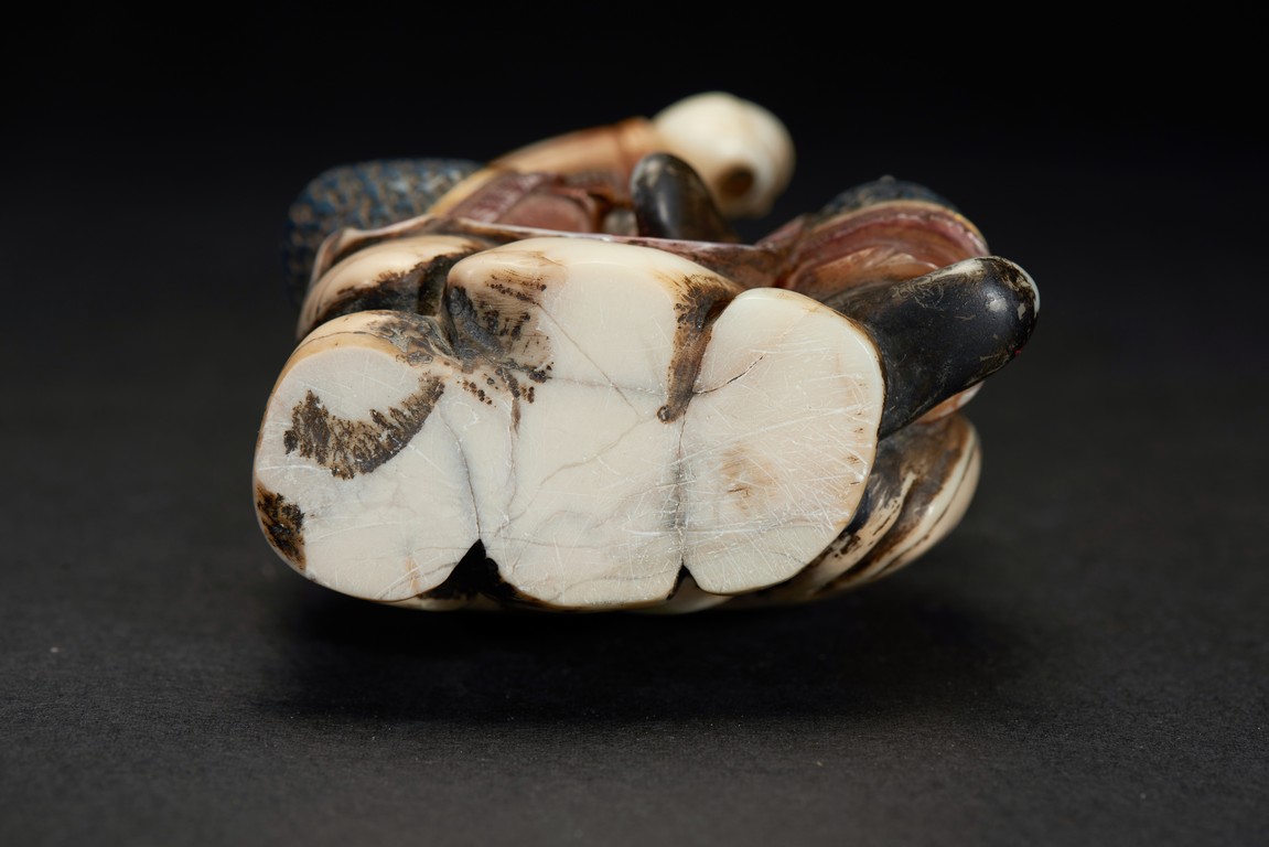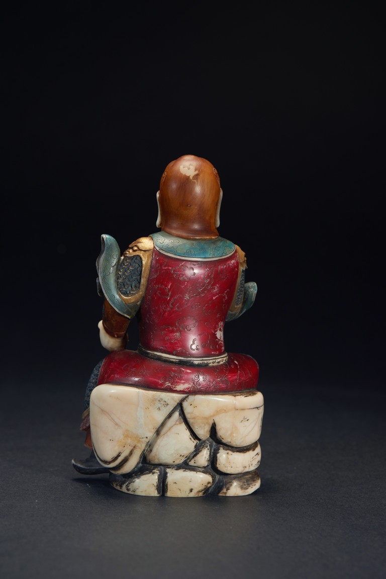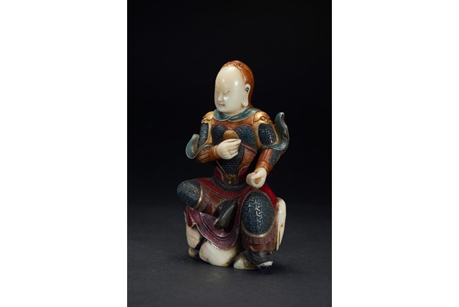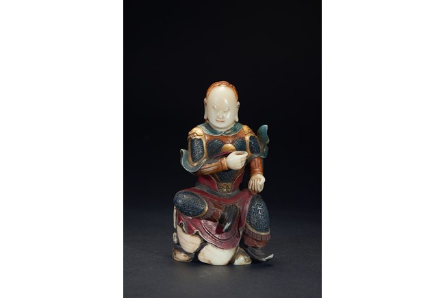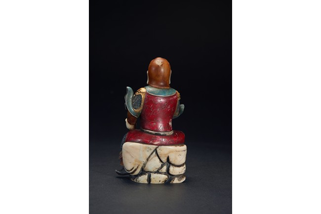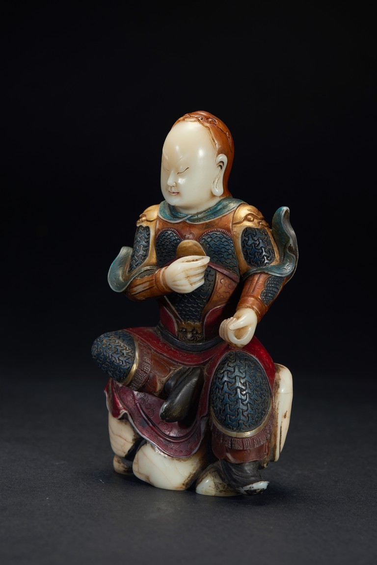 The figure depicts an general wearing color painted armor suits sitting on an white rock with right knee rising, his eyes looks downside and the face with serious expression. Republic period.
