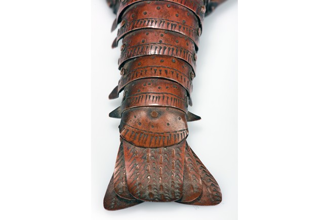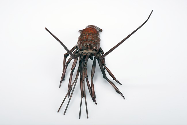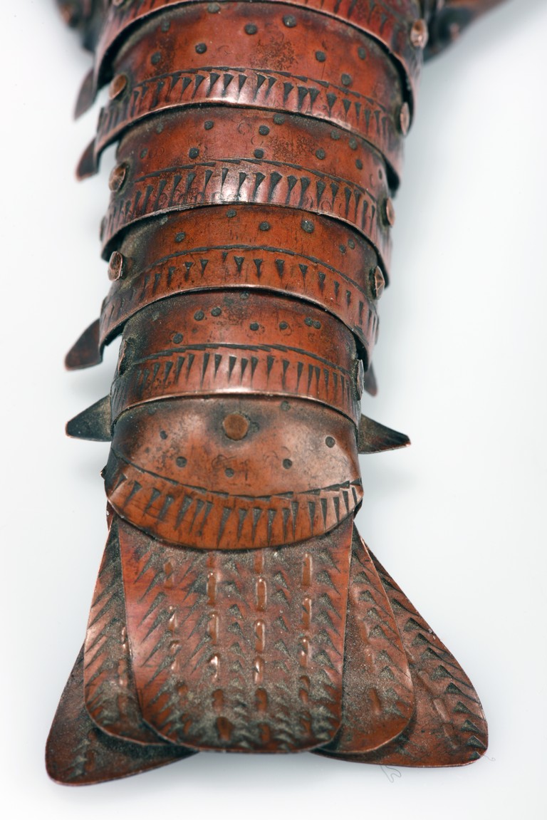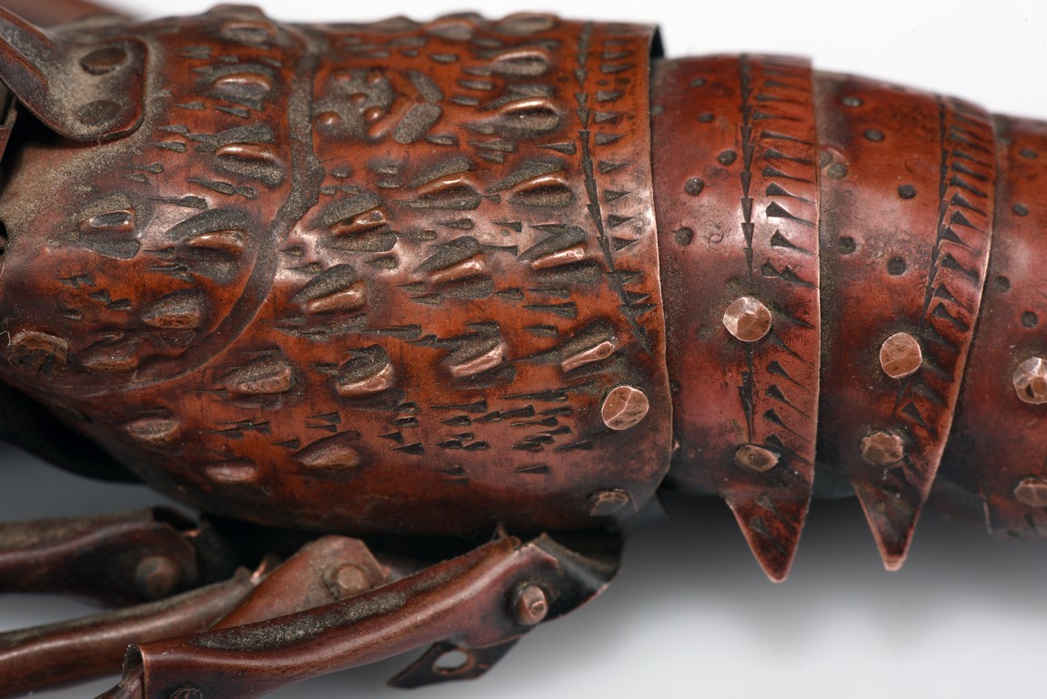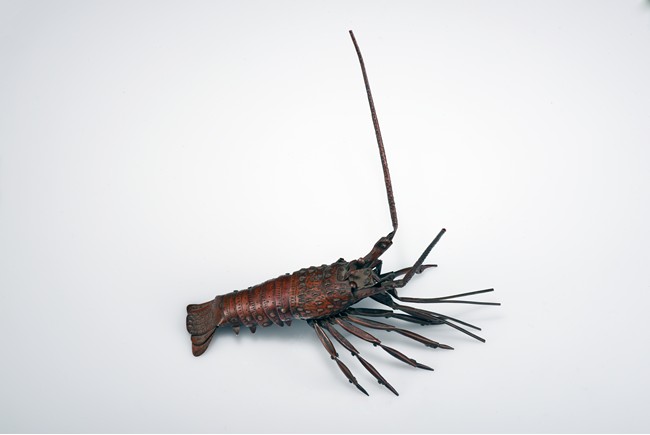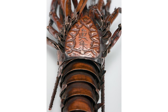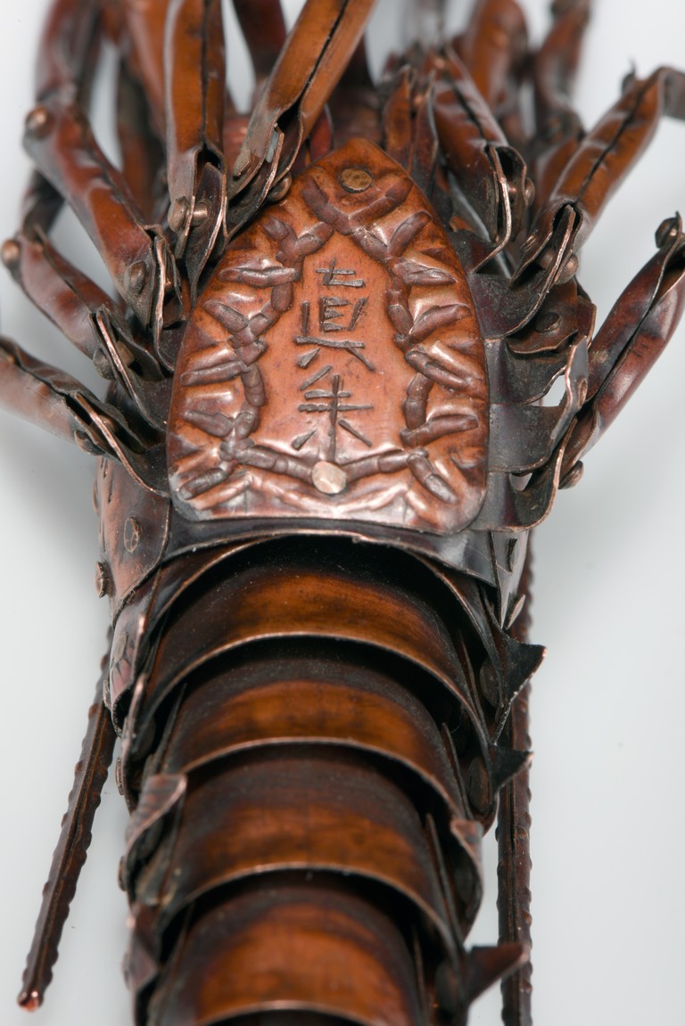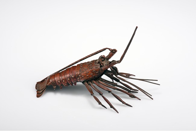 Japanese. Naturalistically and delicately worked into the shape of an live shrimp in bronze, on the base of the body with two characters 'Zhen Wei' inscription. Meiji Period.
