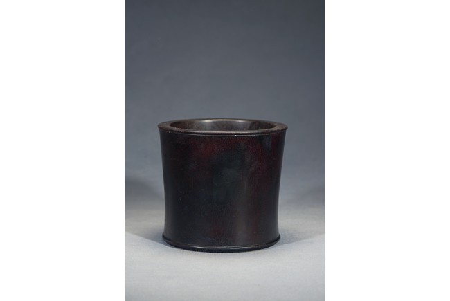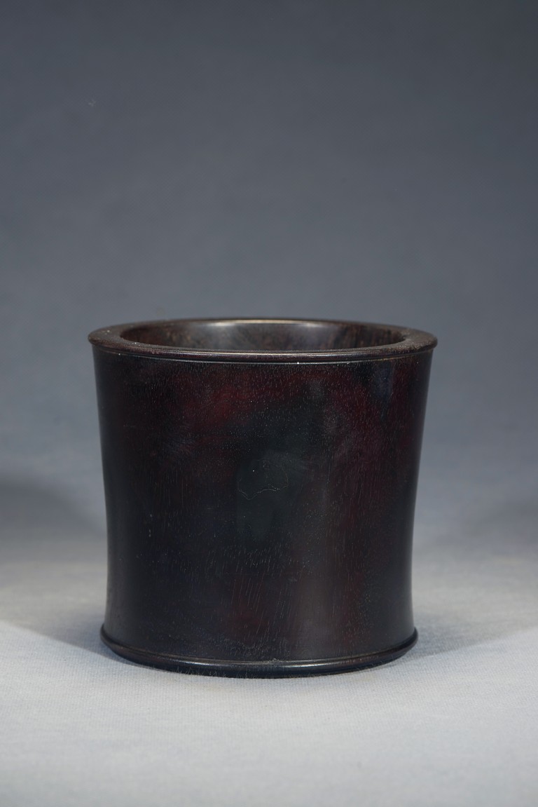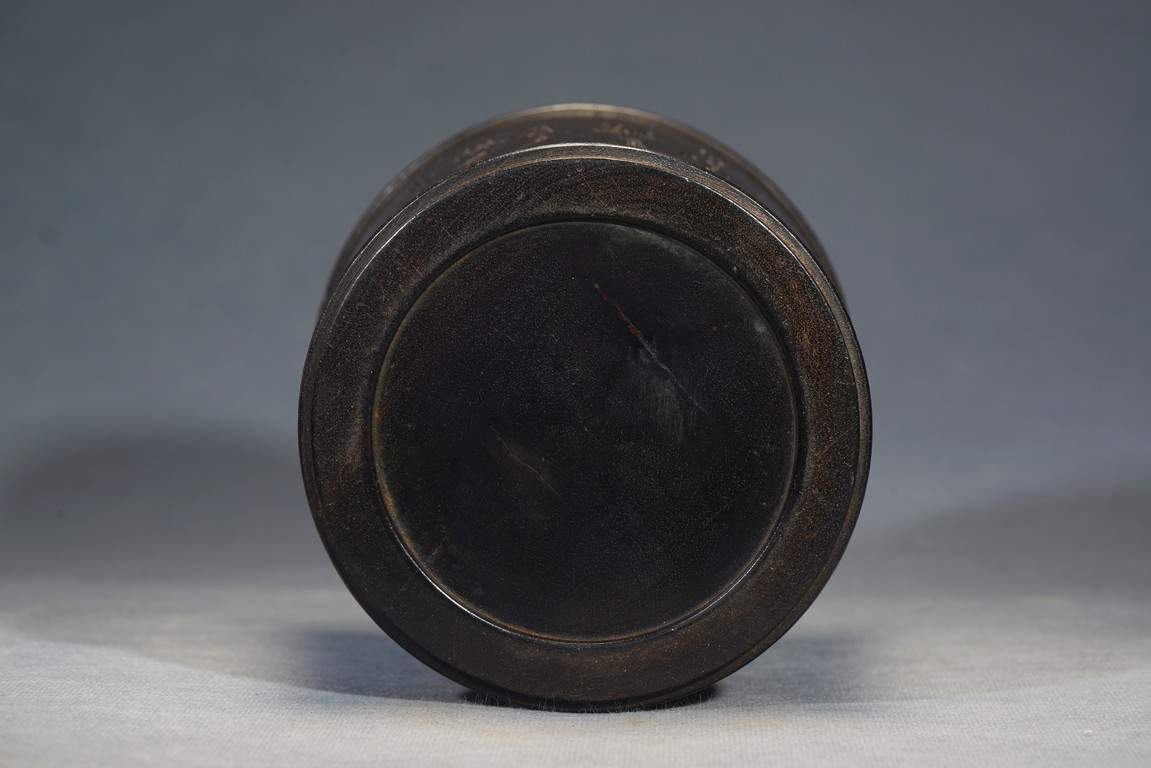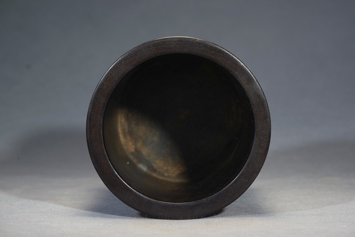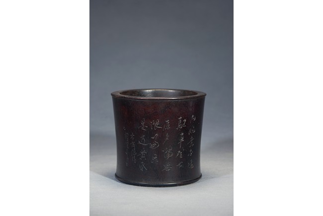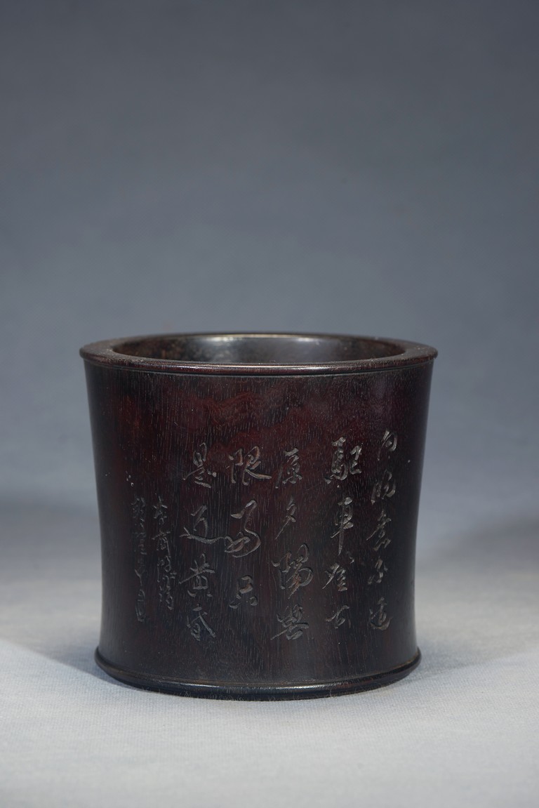Of waisted cylindrical form, the exterior incised with an poetic inscription in running script, and with signature. Qing Dynasty period.