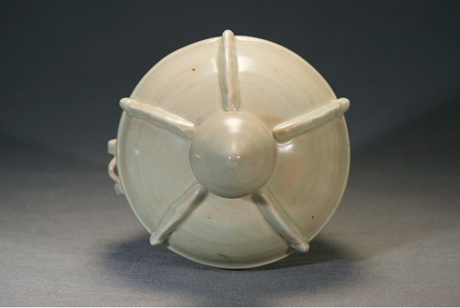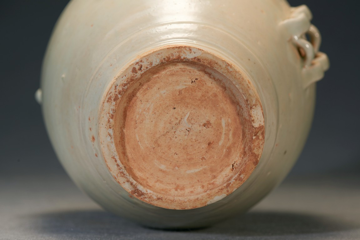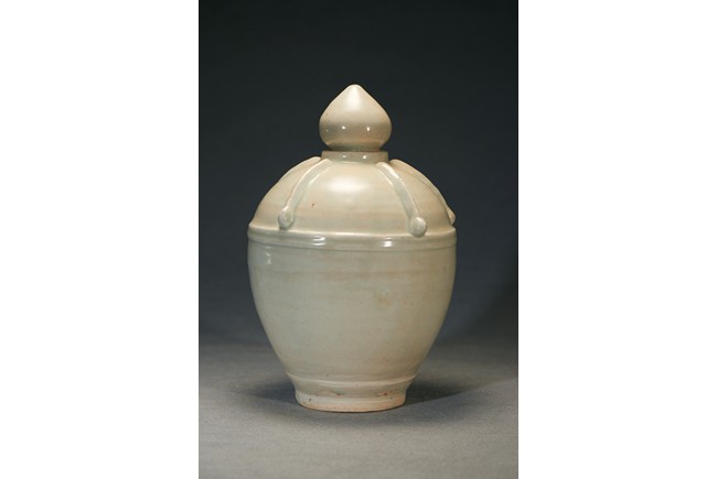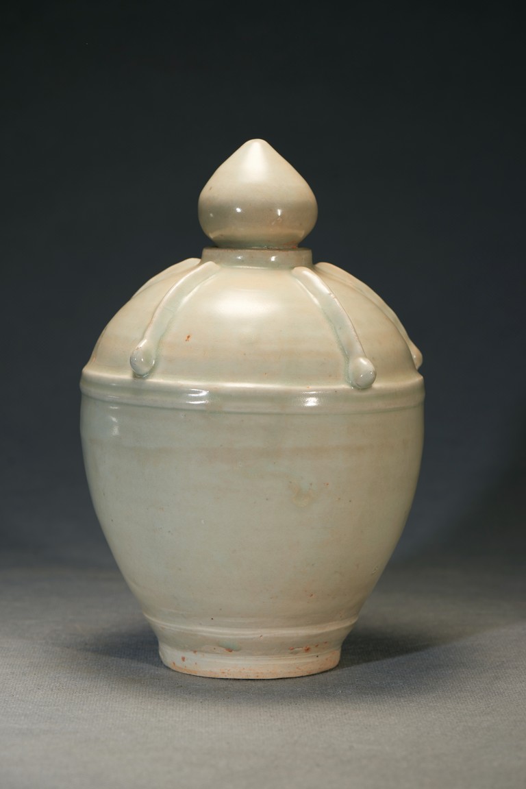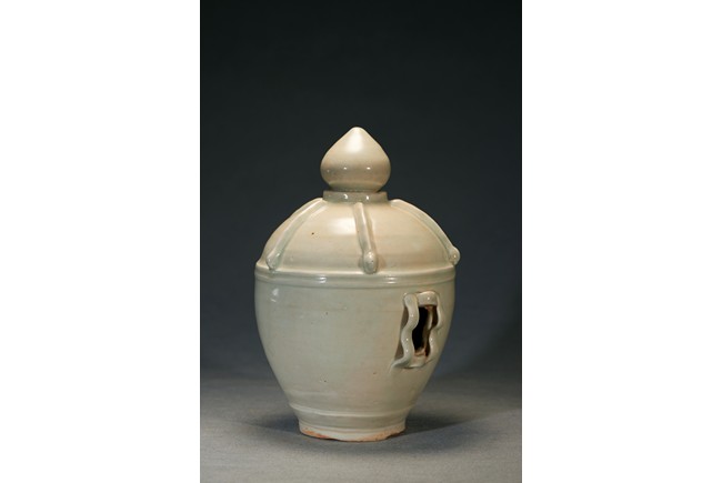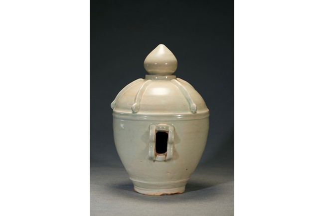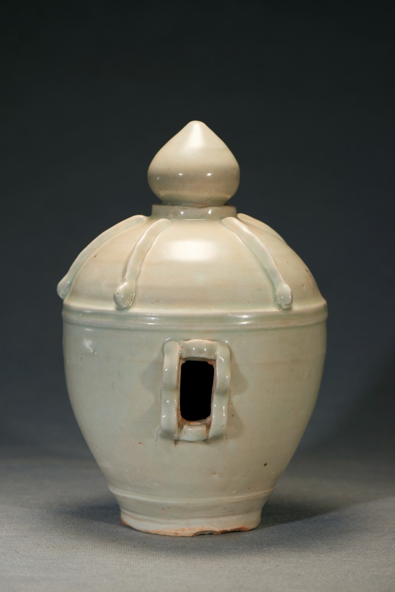 Of oval shaped body raising from slightly tapering circular foot, the finial moulded into pagoda top form with five stripes pattern in relief. In the middle of the jar body pierced with a rectangular shaped aperture. Ming Dynasty period.