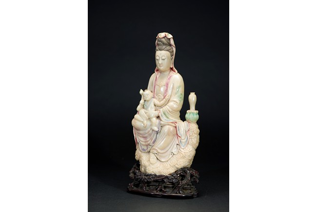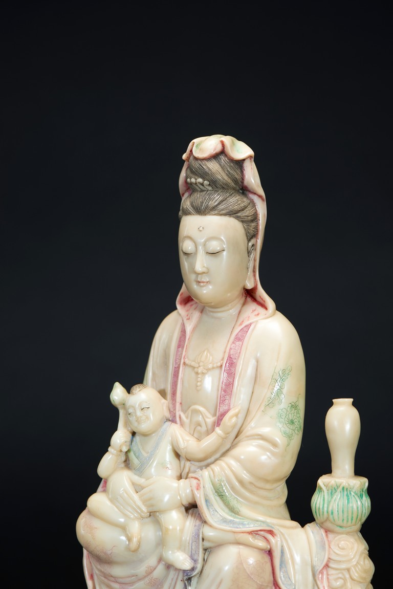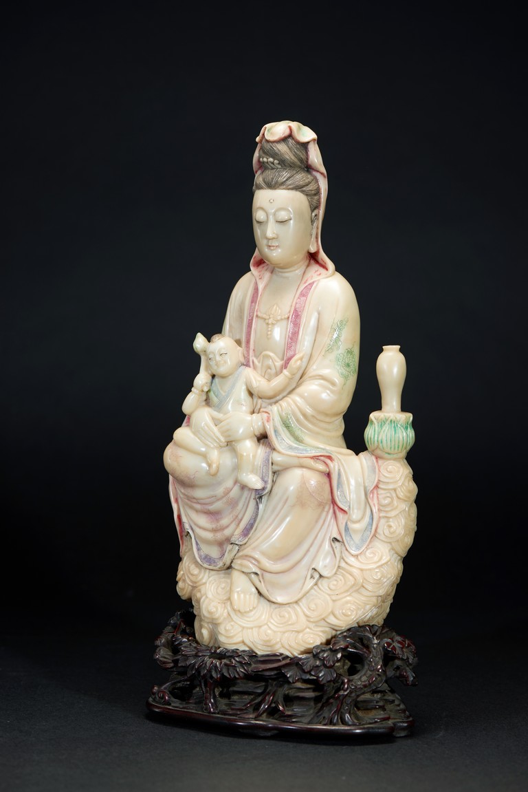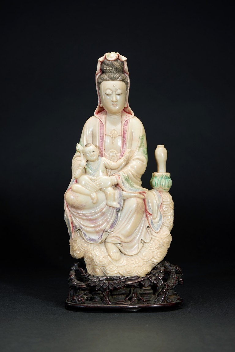 Seated in royal position with an child seated on her lap, wearing long flowing robes opening at the chest to reveal an beaded necklace, the hair tied into high chignon , the face with an serene expression, all supported on an pierced pine trees and lingzhi shaped rock hardwood base. Republic period.