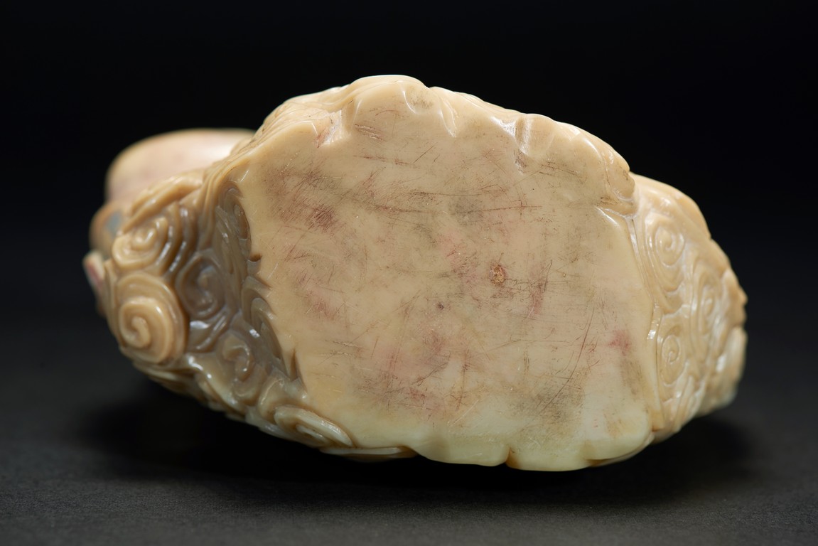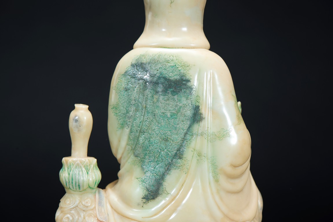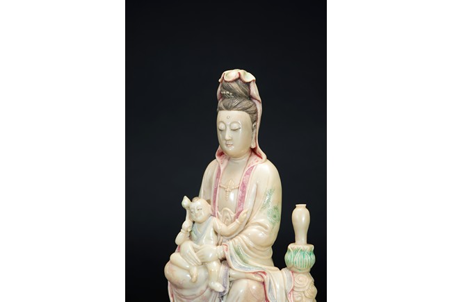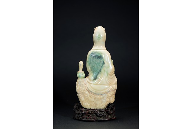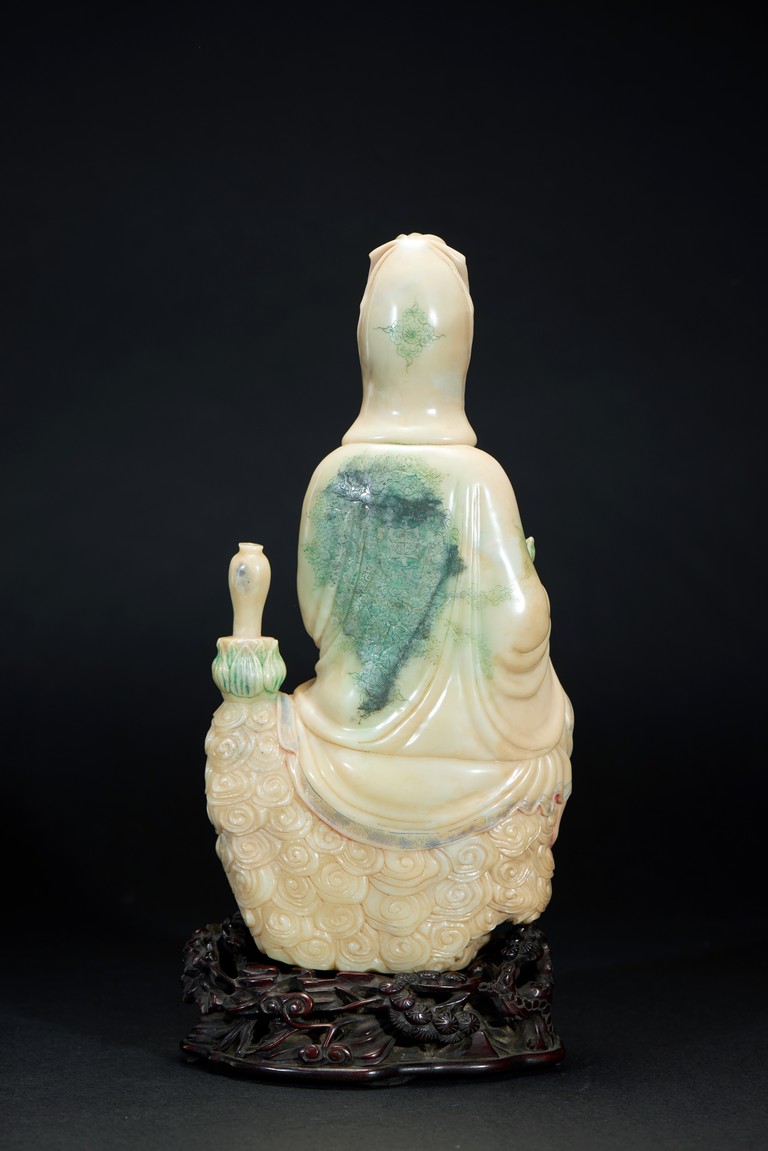 Seated in royal position with an child seated on her lap, wearing long flowing robes opening at the chest to reveal an beaded necklace, the hair tied into high chignon , the face with an serene expression, all supported on an pierced pine trees and lingzhi shaped rock hardwood base. Republic period.