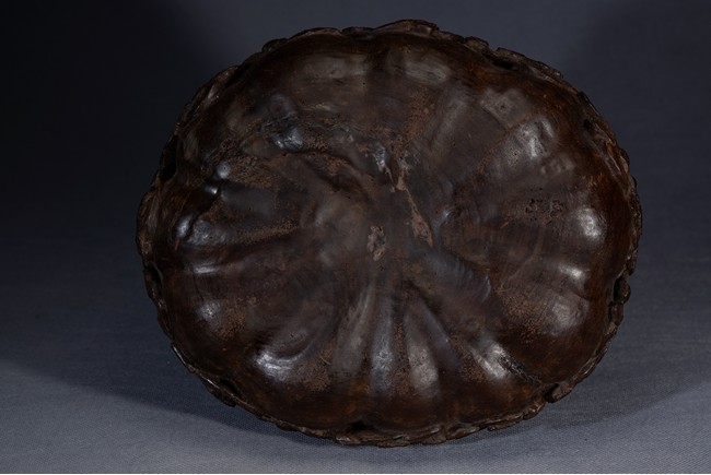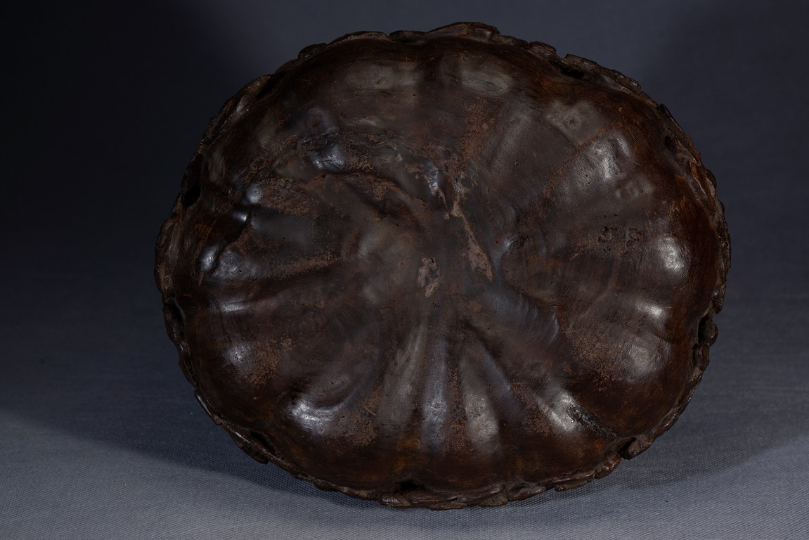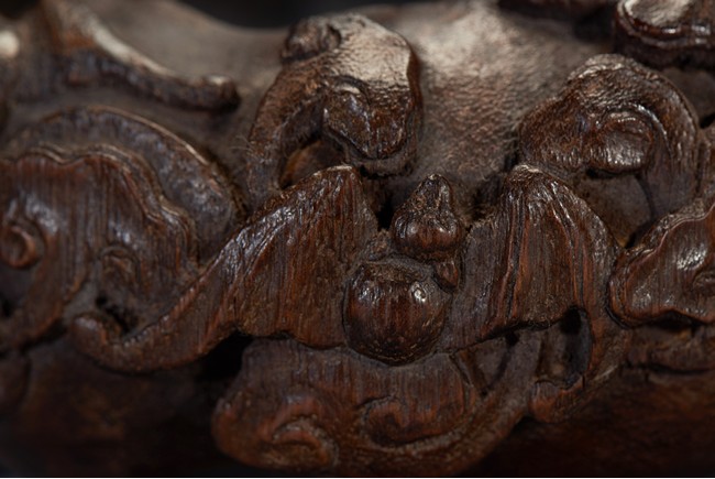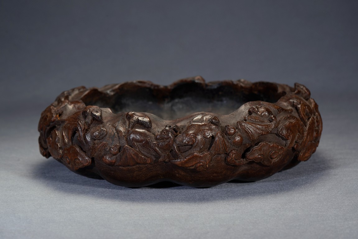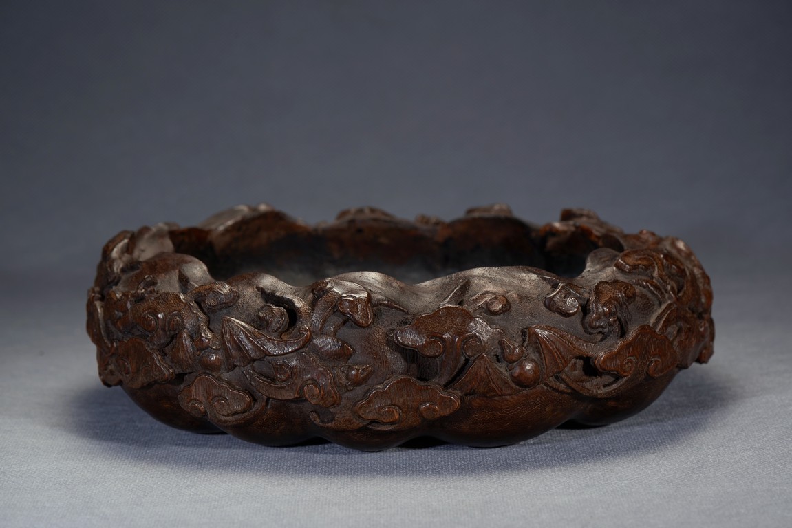 Modelled in the form of an compressed washer with irregular mouth rim, the body finely carved in relief with auspicious decorations of flying bats, deer, and lingzhi heads. Qing Dynasty period.