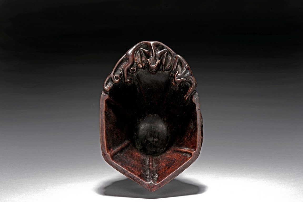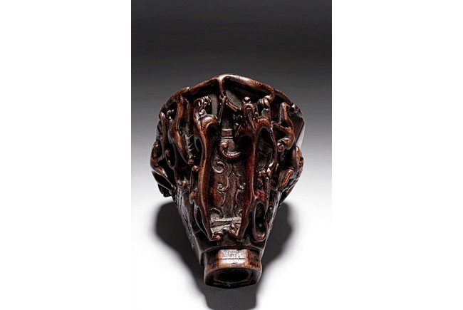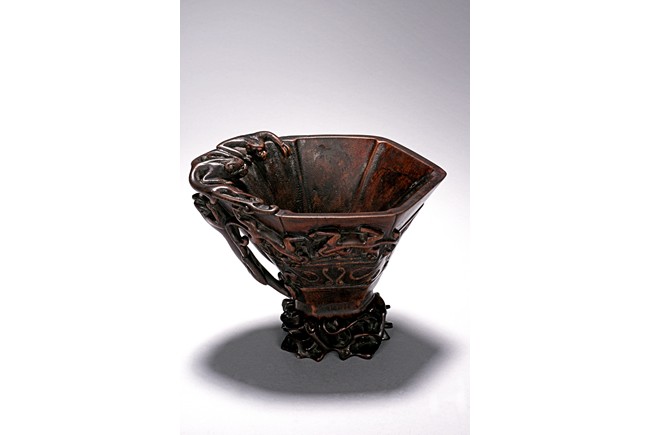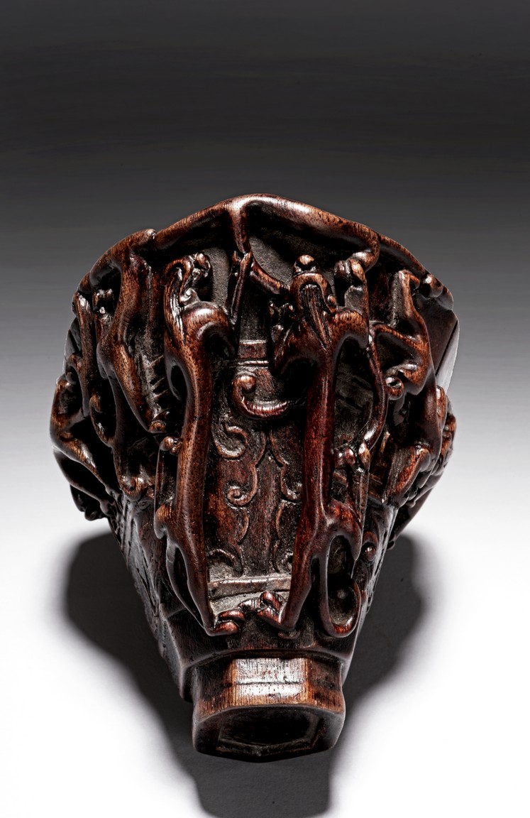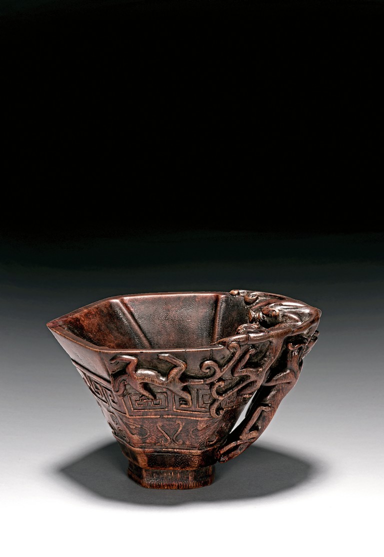 Of hexagonal in from, the cup is finely carved with an band of archaistic key-fret pattern covered by chilong, the handle formed by three clambering chilong dragons in high relief, accompanied with an hardwood reticulated base stand. Qing Dynasty period.