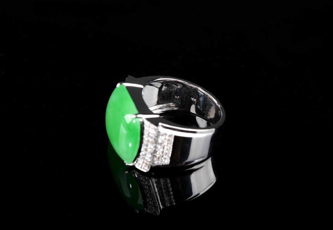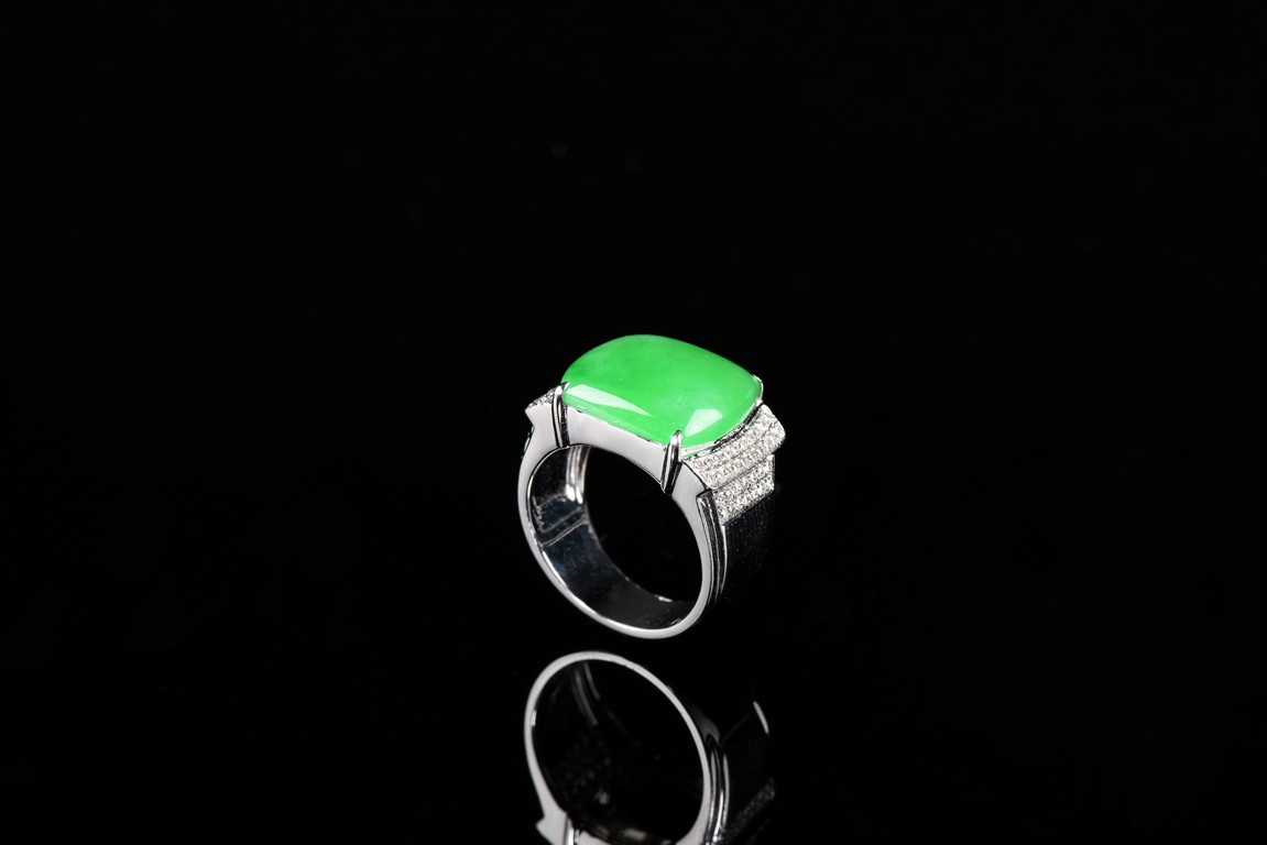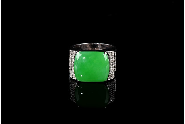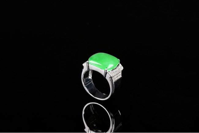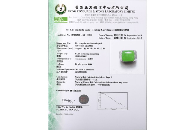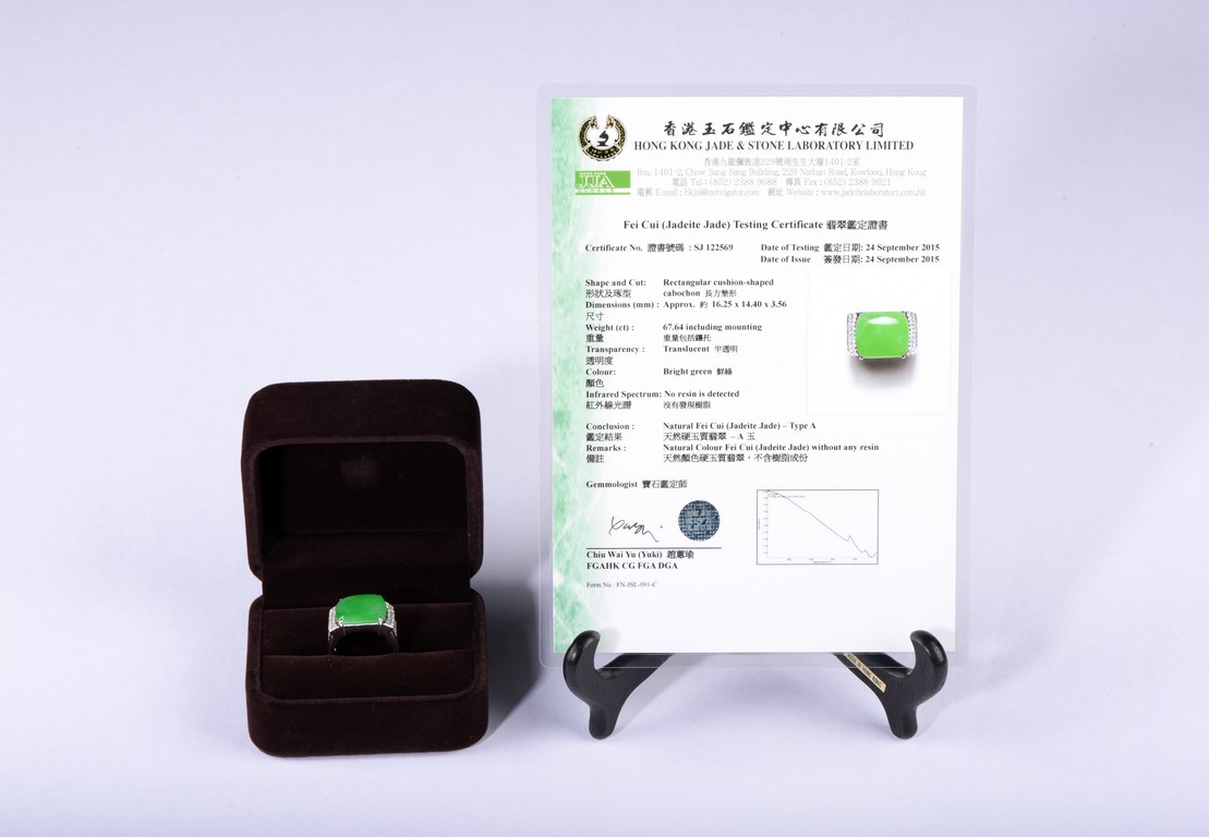 Center jadeite stone measured at 16.25 x 14.40 x 3.56mm in very bright and vibrant apple green color, and even smooth texture. Set in 18K white gold and micro paved four rows of diamond on each side. Accompanied by an certificate from Hong Kong Jade & Stone Lab indicate natural an Type jadeite with no resin detected.