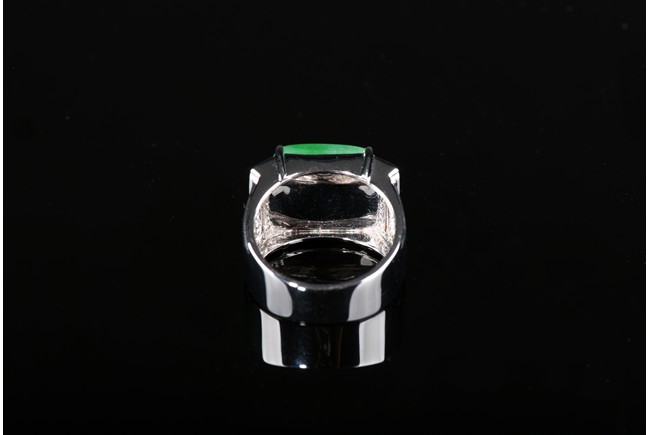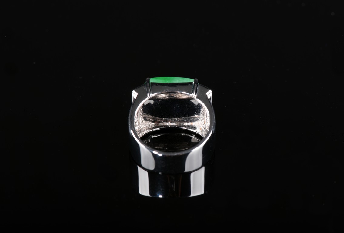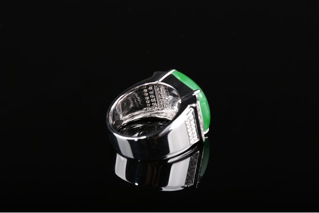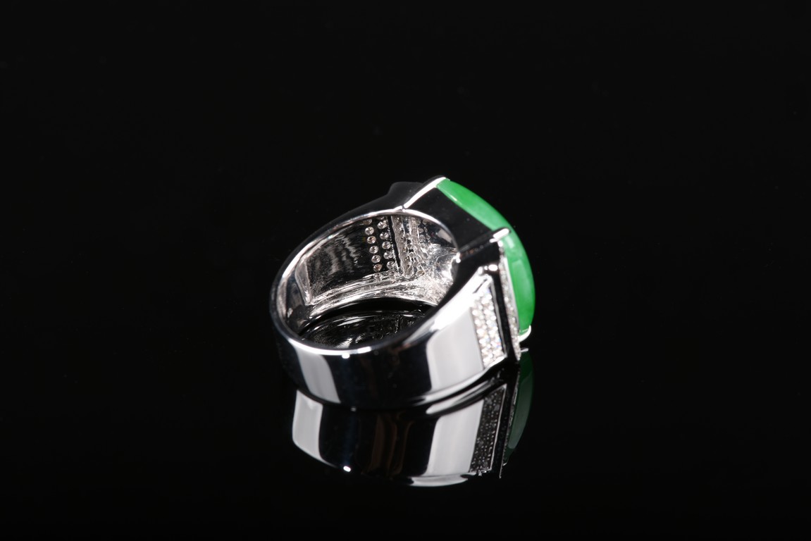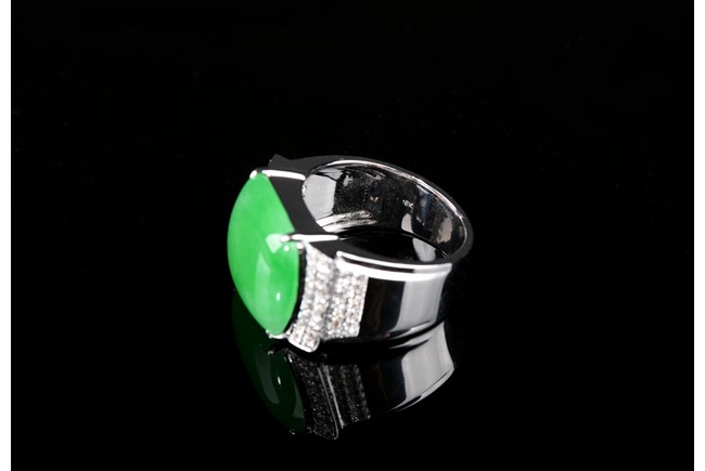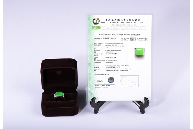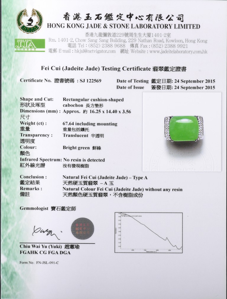 Center jadeite stone measured at 16.25 x 14.40 x 3.56mm in very bright and vibrant apple green color, and even smooth texture. Set in 18K white gold and micro paved four rows of diamond on each side. Accompanied by an certificate from Hong Kong Jade & Stone Lab indicate natural an Type jadeite with no resin detected.