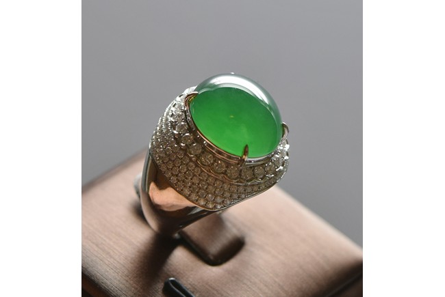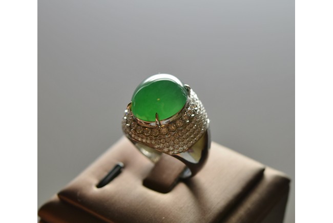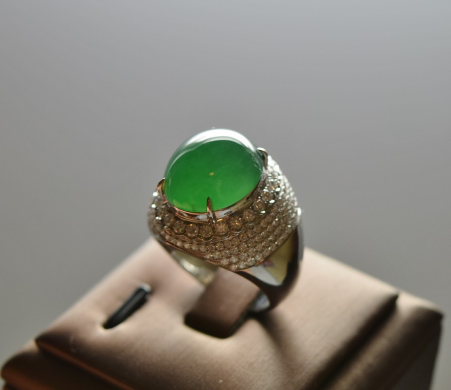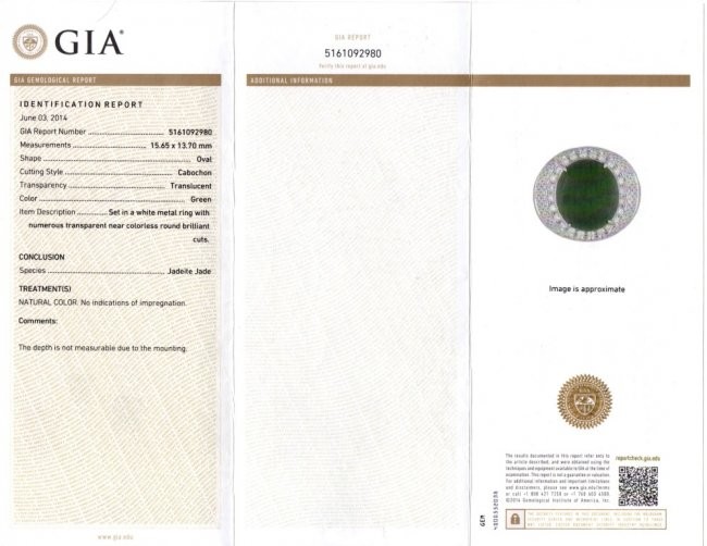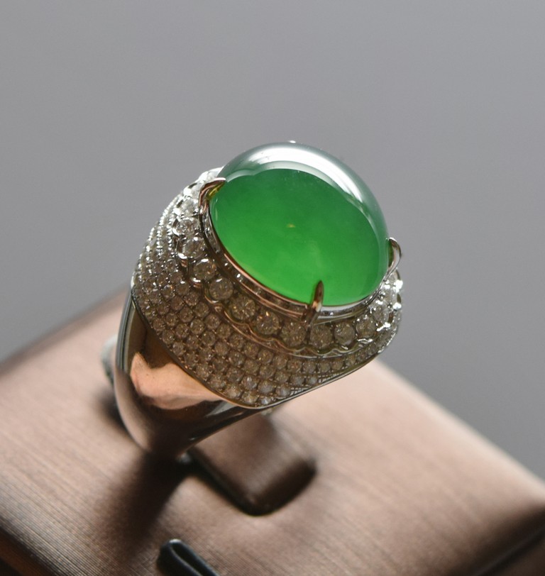 Micro paved with diamonds and in 18K white gold. The center stone features an extremely fine glassy old mine jadeite jade cabochon, in silky smooth even texture with high translucent. Accompanied by GIA Indicating Type an Natural Jadeite Jade with no resin detected. The jadeite cabochon measured approximately 15.65 x 13.70 x 8.50 mm.
