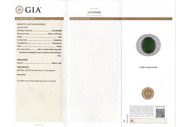 附香港玉石鑒定中心有限公司鑒定證書