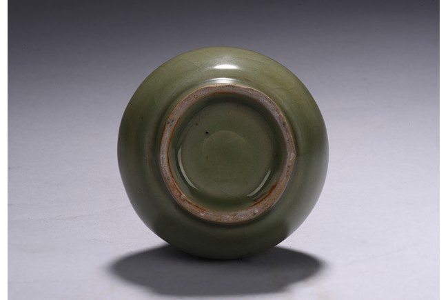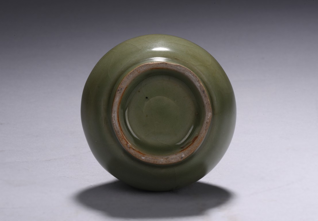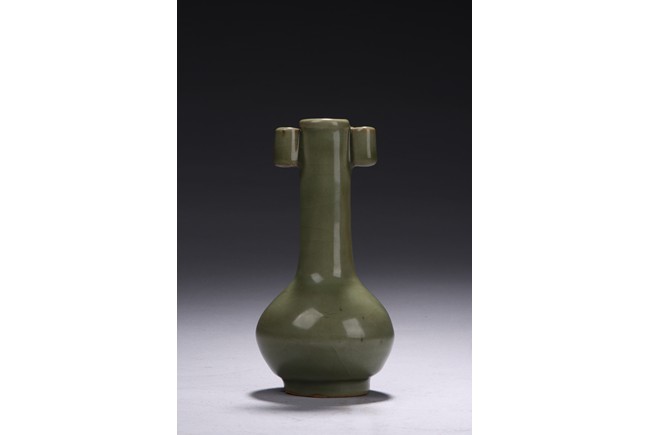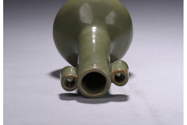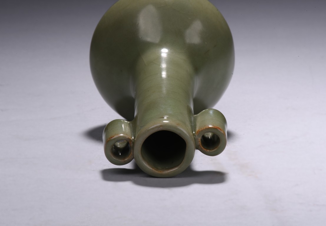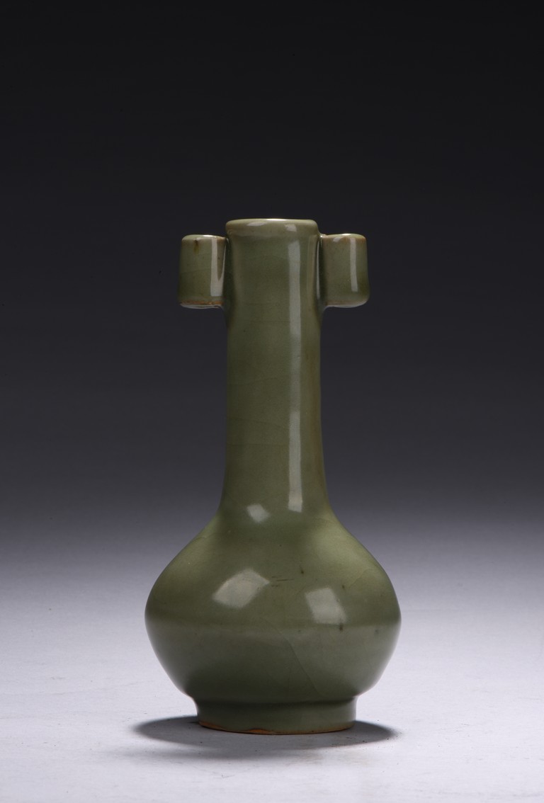 Of traditional form comprised of an cylindrical foot supporting an pear-shaped body beneath an long, thin tubular neck further flanked by two tubular handles ; the unadorned exterior surfaces covered in an celadon green glaze with fine crackles. Ming Dynasty period.