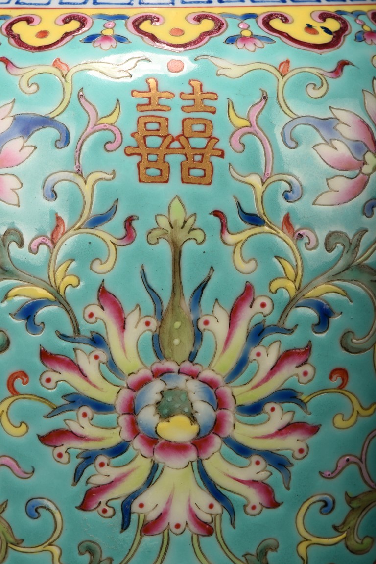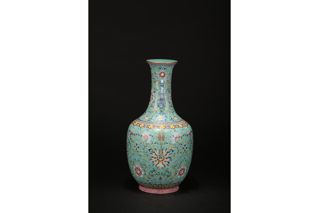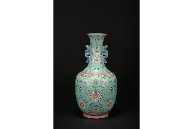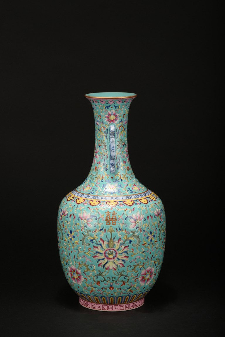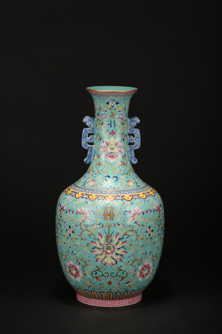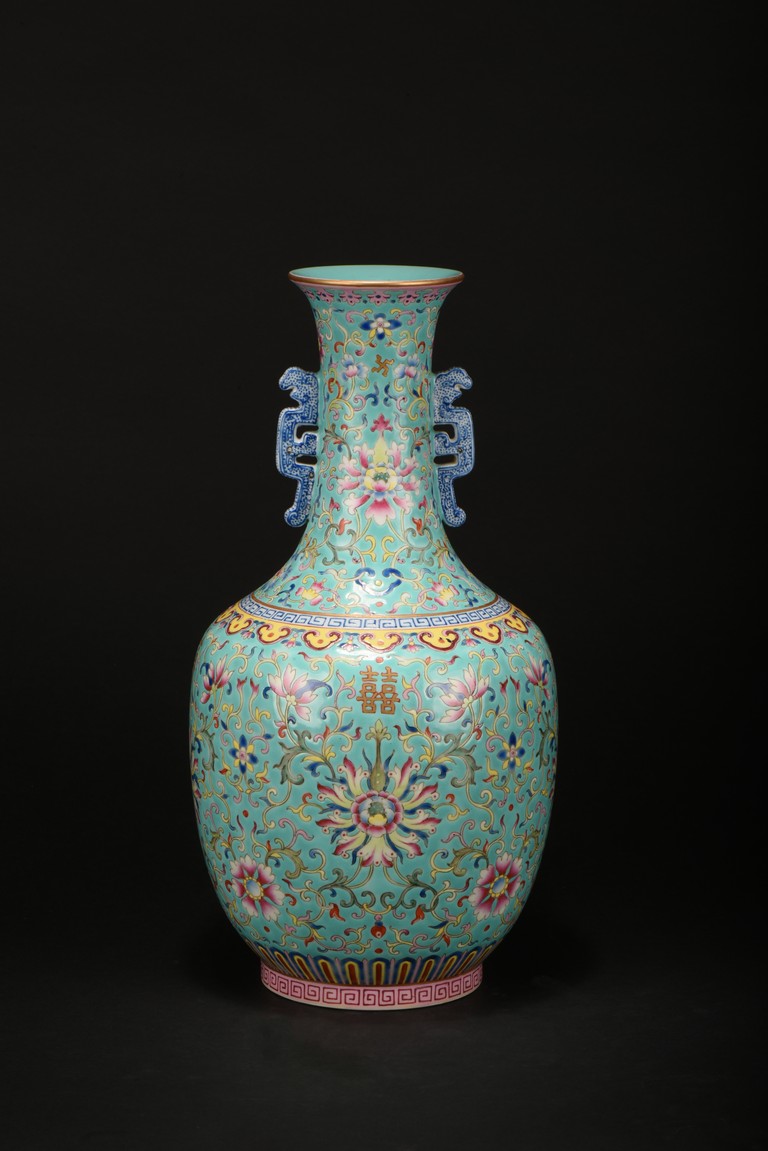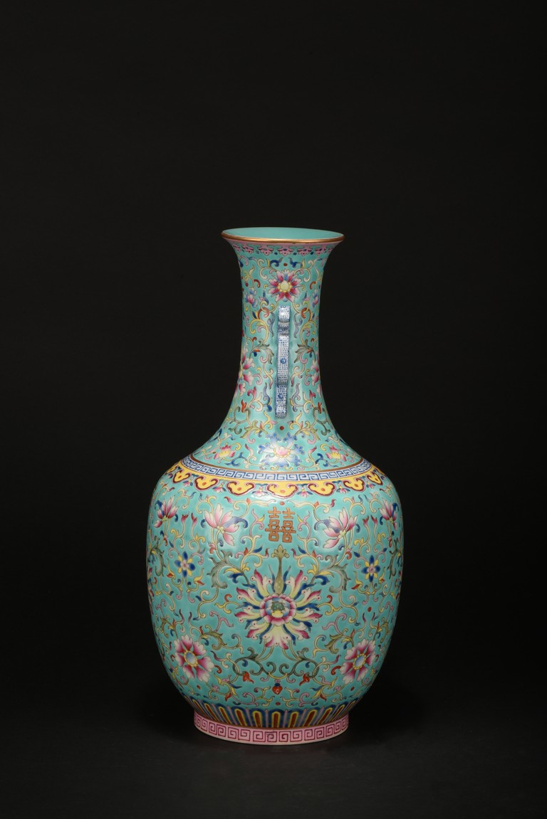 "Raised on band of key-fret pattern short ring foot, the body finely enamelled with stylized lotus blossoms amidst scrolled foliate pattern, on the shoulder of the vase with four stylized golden ""XI"" characters on each four side, at the border between flaring neck and body elaborately decorated with bands of ruyi motif in yellow and red glaze and key-fret pattern in sky blue glaze, an pair of phenix shaped ears applied to the sides, close to the rim is enamelled with lappet band enclosed by gilt border, all reserved on bright turquoise green ground. The base bearing an six character mark. Qing Dynasty period."