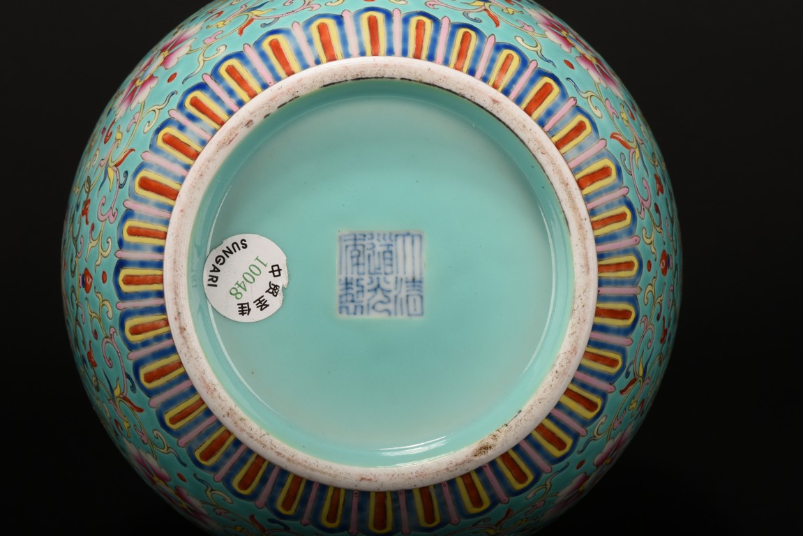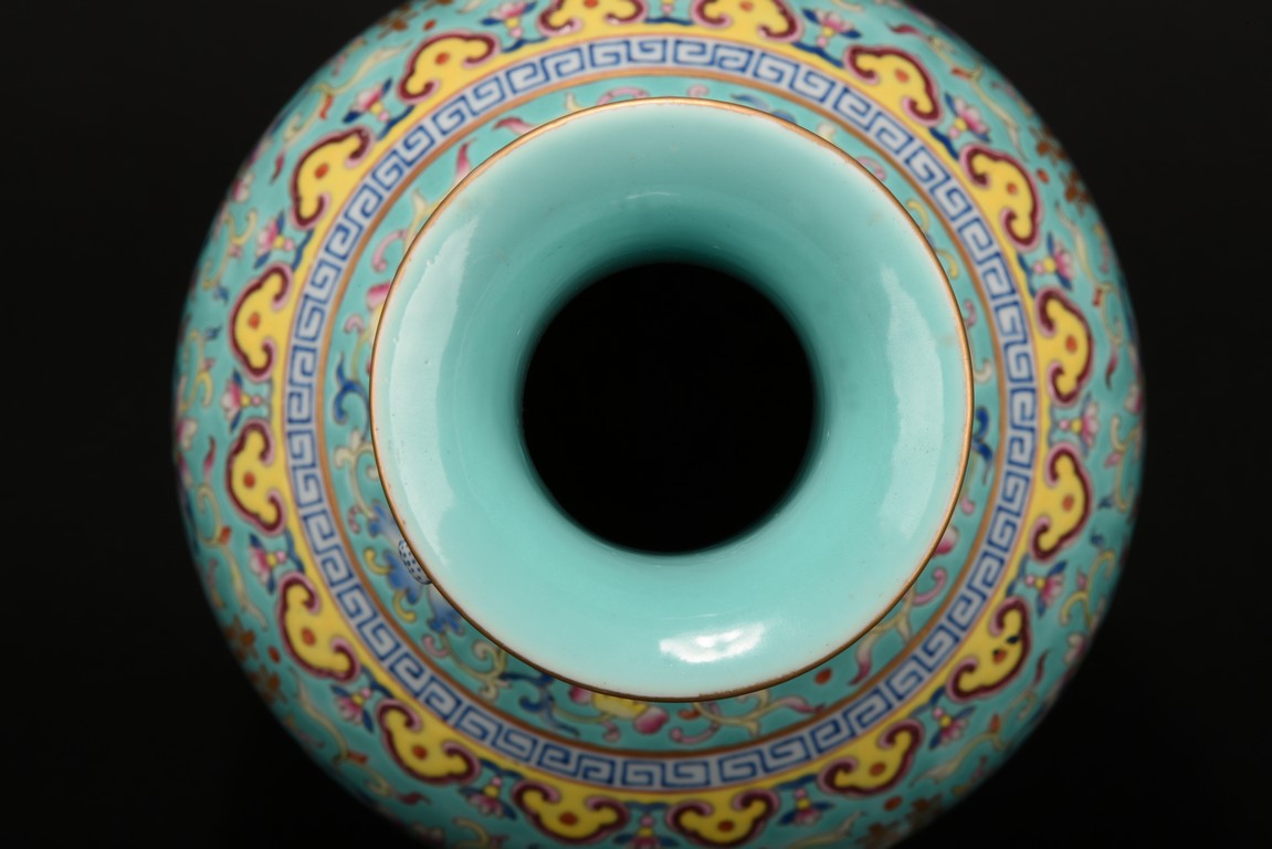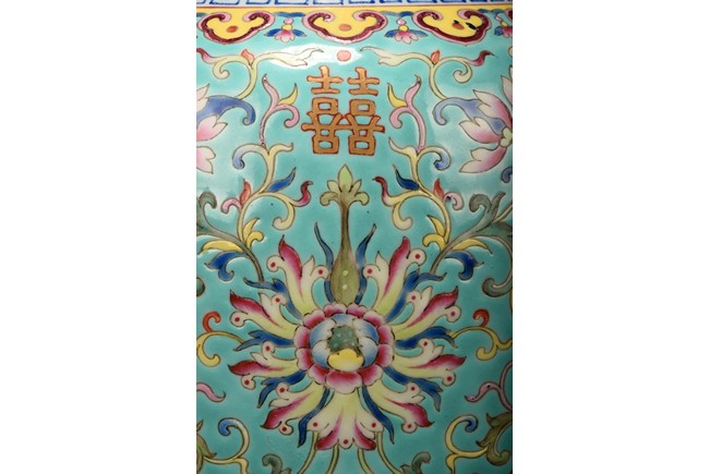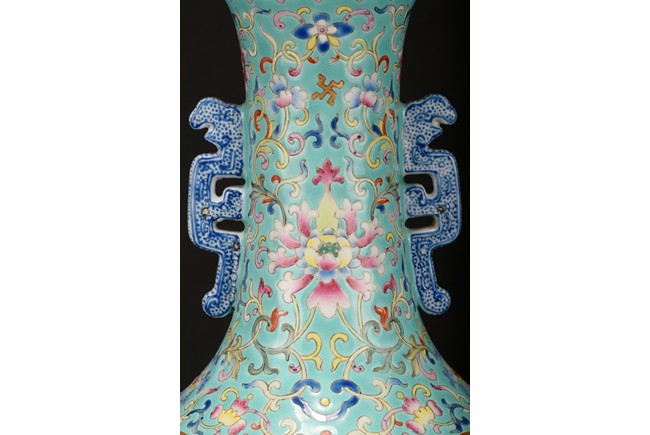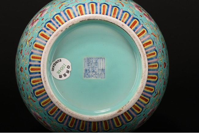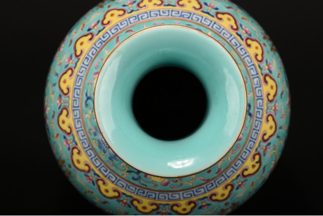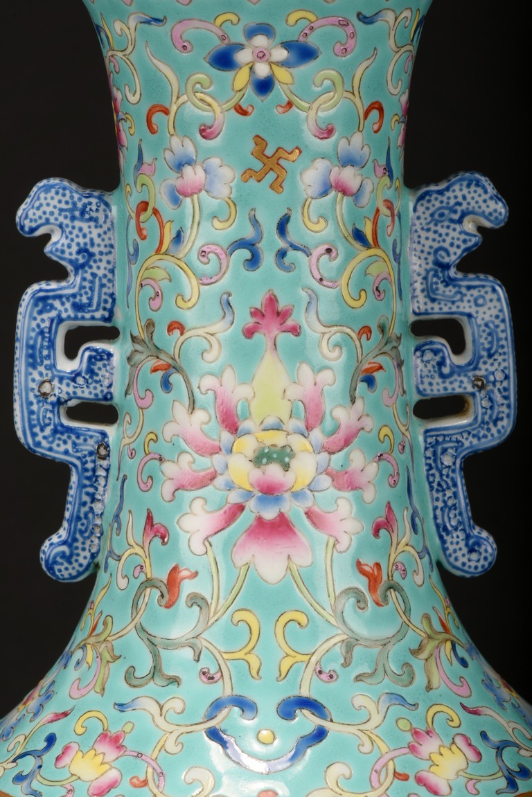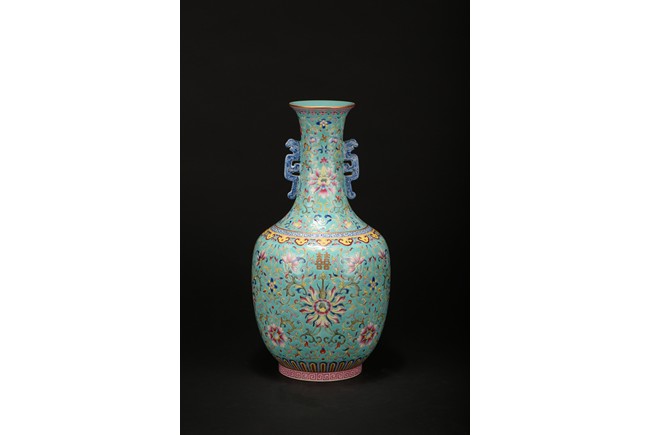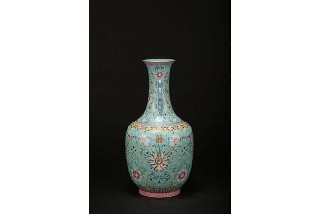 "Raised on band of key-fret pattern short ring foot, the body finely enamelled with stylized lotus blossoms amidst scrolled foliate pattern, on the shoulder of the vase with four stylized golden ""XI"" characters on each four side, at the border between flaring neck and body elaborately decorated with bands of ruyi motif in yellow and red glaze and key-fret pattern in sky blue glaze, an pair of phenix shaped ears applied to the sides, close to the rim is enamelled with lappet band enclosed by gilt border, all reserved on bright turquoise green ground. The base bearing an six character mark. Qing Dynasty period."