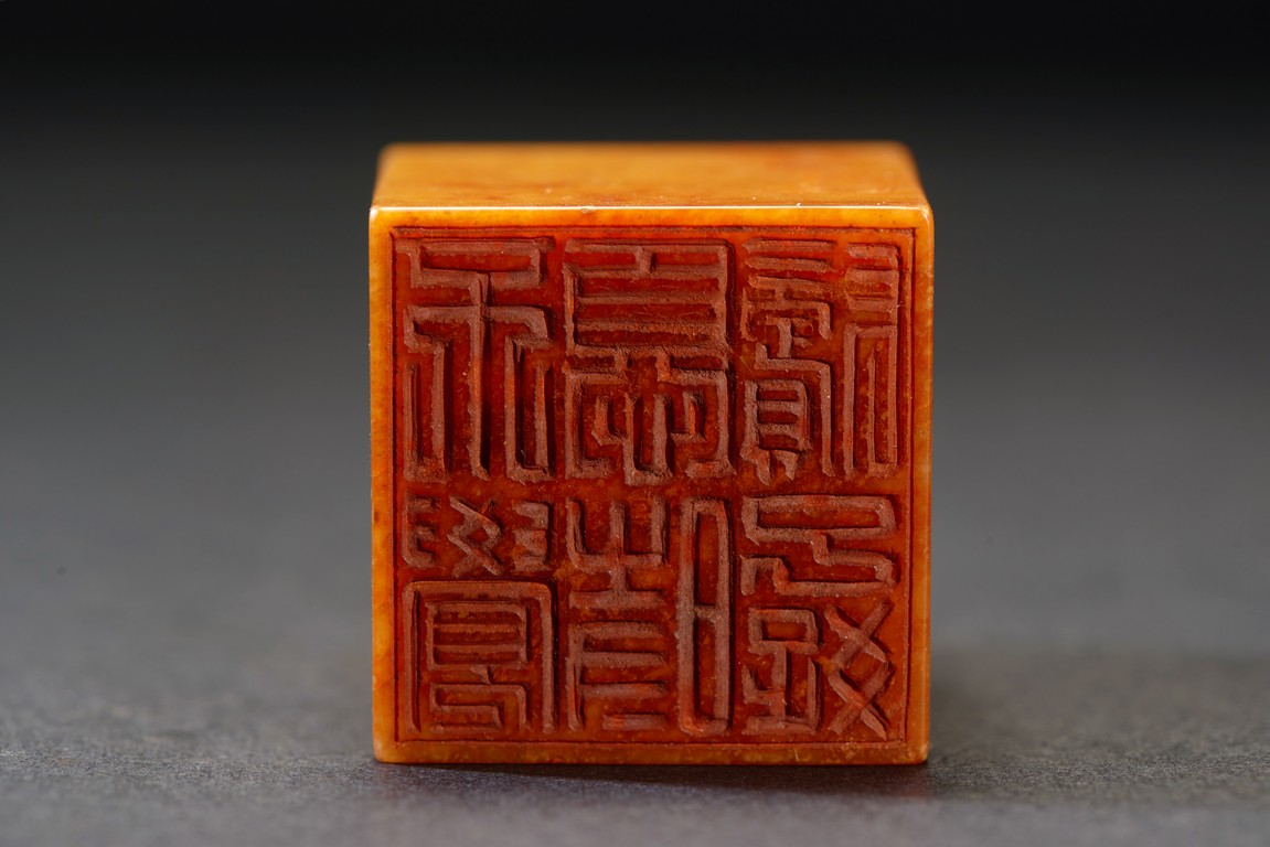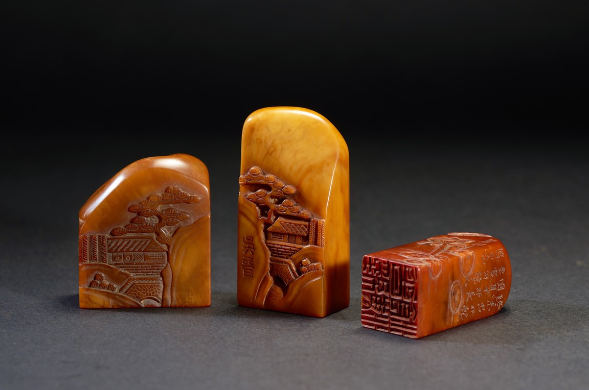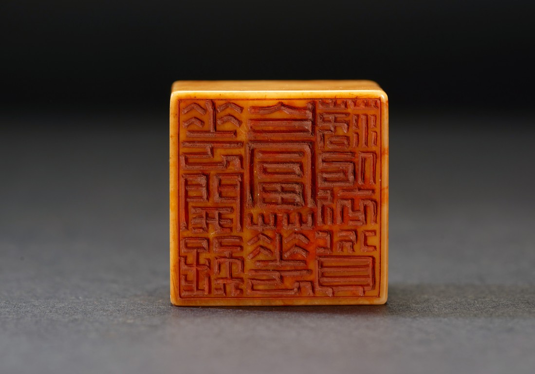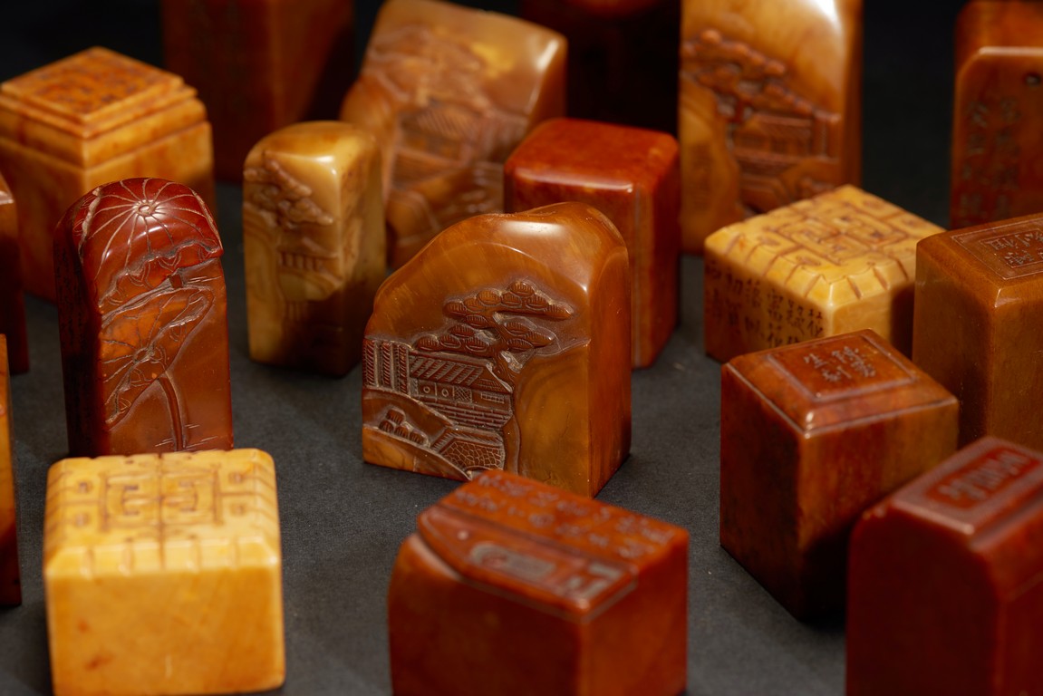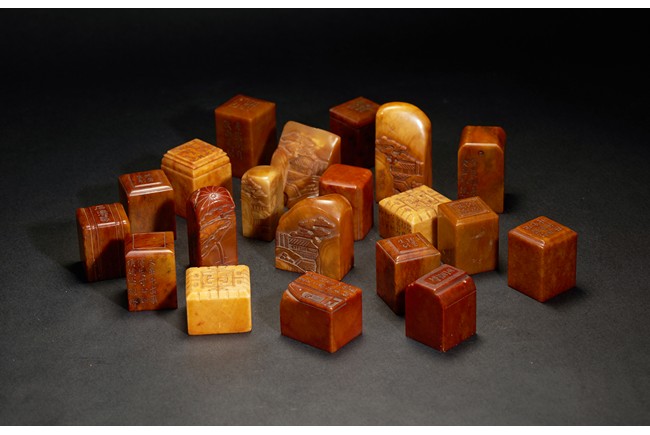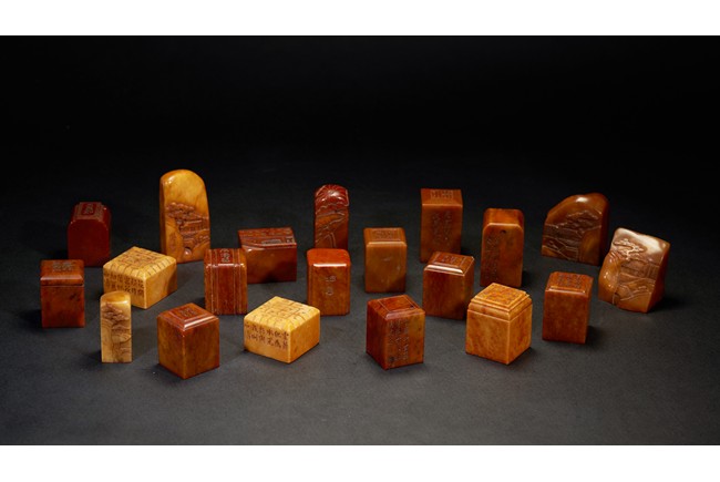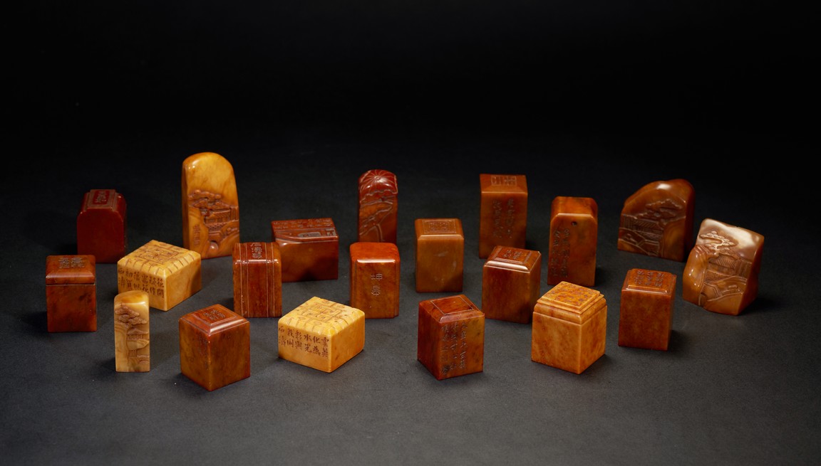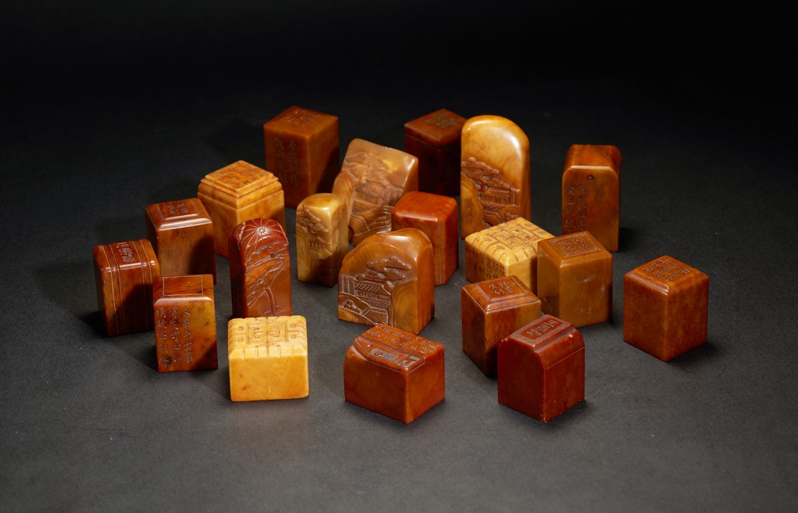 The group consists of twenty irregularly shaped jade seals with inscriptions, the base carved with mark.